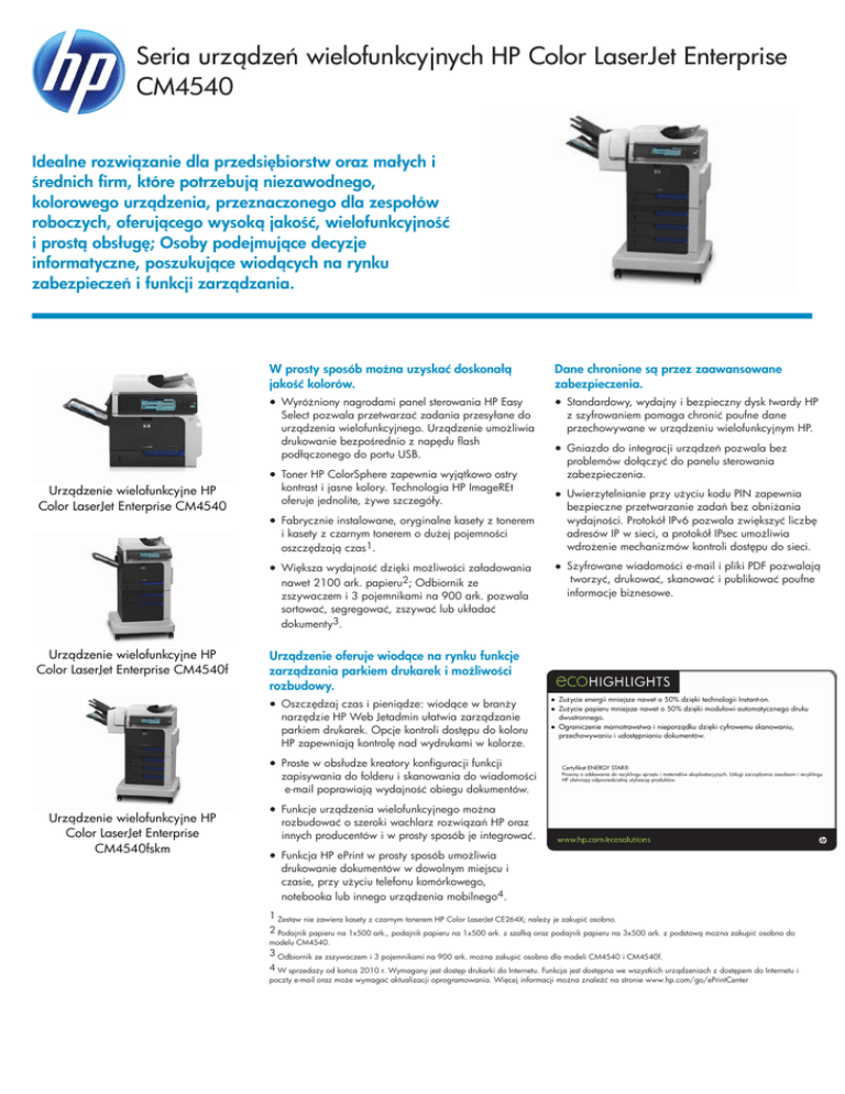 Seria urządzeń wielofunkcyjnych HP Color LaserJet Enterprise CM4540 Idealne rozwiązanie dla przedsiębiorstw oraz małych i średnich firm, które potrzebują niezawodnego, kolorowego urządzenia, przeznaczonego dla zespołów roboczych, oferującego wysoką jakość, wielofunkcyjność i prostą obsługę; Osoby podejmujące decyzje informatyczne, poszukujące wiodących na rynku zabezpieczeń i funkcji zarządzania. Urządzenie wielofunkcyjne HP Color LaserJet Enterprise CM4540 W prosty sposób można uzyskać doskonałą jakość kolorów. Dane chronione są przez zaawansowane zabezpieczenia. ● Wyróżniony nagrodami panel sterowania HP Easy Select pozwala przetwarzać zadania przesyłane do urządzenia wielofunkcyjnego. Urządzenie umożliwia drukowanie bezpośrednio z napędu flash podłączonego do portu USB. ● Standardowy, wydajny i bezpieczny dysk twardy HP z szyfrowaniem pomaga chronić poufne dane przechowywane w urządzeniu wielofunkcyjnym HP. ● Toner HP ColorSphere zapewnia wyjątkowo ostry kontrast i jasne kolory. Technologia HP ImageREt oferuje jednolite, żywe szczegóły. ● Fabrycznie instalowane, oryginalne kasety z tonerem i kasety z czarnym tonerem o dużej pojemności oszczędzają czas1. ● Większa wydajność dzięki możliwości załadowania nawet 2100 ark. papieru2; Odbiornik ze zszywaczem i 3 pojemnikami na 900 ark. pozwala sortować, segregować, zszywać lub układać dokumenty3. Urządzenie wielofunkcyjne HP Color LaserJet Enterprise CM4540f ● Uwierzytelnianie przy użyciu kodu PIN zapewnia bezpieczne przetwarzanie zadań bez obniżania wydajności. Protokół IPv6 pozwala zwiększyć liczbę adresów IP w sieci, a protokół IPsec umożliwia wdrożenie mechanizmów kontroli dostępu do sieci. ● Szyfrowane wiadomości e-mail i pliki PDF pozwalają tworzyć, drukować, skanować i publikować poufne informacje biznesowe. Urządzenie oferuje wiodące na rynku funkcje zarządzania parkiem drukarek i możliwości rozbudowy. ● Oszczędzaj czas i pieniądze: wiodące w branży narzędzie HP Web Jetadmin ułatwia zarządzanie parkiem drukarek. Opcje kontroli dostępu do koloru HP zapewniają kontrolę nad wydrukami w kolorze. ● Proste w obsłudze kreatory konfiguracji funkcji zapisywania do folderu i skanowania do wiadomości e-mail poprawiają wydajność obiegu dokumentów. Urządzenie wielofunkcyjne HP Color LaserJet Enterprise CM4540fskm ● Gniazdo do integracji urządzeń pozwala bez problemów dołączyć do panelu sterowania zabezpieczenia. ● Zużycie energii mniejsze nawet o 50% dzięki technologii Instant-on. ● Zużycie papieru mniejsze nawet o 50% dzięki modułowi automatycznego druku dwustronnego. ● Ograniczenie marnotrawstwa i nieporządku dzięki cyfrowemu skanowaniu, przechowywaniu i udostępnianiu dokumentów. Certyfikat ENERGY STAR® Prosimy o oddawanie do recyklingu sprzętu i materiałów eksploatacyjnych. Usługi zarządzania zasobami i recyklingu HP ułatwiają odpowiedzialną utylizację produktów. ● Funkcje urządzenia wielofunkcyjnego można rozbudować o szeroki wachlarz rozwiązań HP oraz innych producentów i w prosty sposób je integrować. ● Funkcja HP ePrint w prosty sposób umożliwia drukowanie dokumentów w dowolnym miejscu i czasie, przy użyciu telefonu komórkowego, notebooka lub innego urządzenia mobilnego4. 1 Zestaw nie zawiera kasety z czarnym tonerem HP Color LaserJet CE264X; należy je zakupić osobno. 2 Podajnik papieru na 1x500 ark., podajnik papieru na 1x500 ark. z szafką oraz podajnik papieru na 3x500 ark. z podstawą można zakupić osobno do modelu CM4540. 3 Odbiornik ze zszywaczem i 3 pojemnikami na 900 ark. można zakupić osobno dla modeli CM4540 i CM4540f. 4 W sprzedaży od końca 2010 r. Wymagany jest dostęp drukarki do Internetu. Funkcja jest dostępna we wszystkich urządzeniach z dostępem do Internetu i poczty e-mail oraz może wymagać aktualizacji oprogramowania. Więcej informacji można znaleźć na stronie www.hp.com/go/ePrintCenter Przegląd produktu Seria urządzeń wielofunkcyjnych HP Color LaserJet Enterprise CM4540 1.) Intuicyjny 8-calowy [obrotowy] ekran dotykowy HP Easy Select, panel sterowania 2.) Gniazdo integracji sprzętu do integracji rozwiązań 3.) Odbiornik ze zszywaczem i 3 pojemnikami na 900 ark. 4.) Przednia pokrywa zapewnia wygodny dostęp do czterech wkładów drukujących HP 5.) Wbudowany moduł automatycznego druku dwustronnego 6.) Cztery podajniki na 500 ark. zwiększają łączną pojemność podajników do 2100 ark. 7.) Skaner z automatycznym podajnikiem dokumentów na 50 ark. obsługuje 2-stronne dokumenty z maksymalną szybkością Skaner [ze szkłem płaskim walcowanym] obsługuje dokumenty do formatu legal 8.) Podajnik uniwersalny na 100 arkuszy obsługuje grube i nietypowe nośniki o gramaturze do 220 g/m2 9.) Port Hi-Speed USB 2.0 10.) Wbudowany serwer druku HP Jetdirect do sieci Gigabit Ethernet 11.) Port faksu RJ-11 12.) Jedno wolne gniazdo EIO 13.) 1280 MB (bez możliwości rozbudowy) łącznej pamięci oraz procesor 800 MHz umożliwiają szybkie wykonanie złożonych zadań drukowania 14.) Wbudowany dysk twardy z zabezpieczeniem HP High Performance 15.) Port dostępu z opcj. blokadą typu Kensington Krótka charakterystyka Urządzenie wielofunkcyjne HP Color LaserJet Enterprise CM4540 ● prędkość drukowania i kopiowania maks. 40 str./min ● maks. 600 x 600 dpi efektywnej rozdzielczości wyjściowej z technologią HP ImageREt 3600 ● 1280 MB pamięci RAM ● procesor 800 MHz ● standardowa pojemność podajników 600 ark. z jednym podajnikiem na 500 ark. i jednym uniwersalnym podajnikiem na 100 ark. Z możliwością rozszerzenia o opcjonalny podajnik na 500 ark. z szafką lub bez albo o podajnik na 3x500 ark. z podstawą drukarki. Urządzenie wielofunkcyjne HP Color LaserJet Enterprise CM4540f ● jak w modelu podstawowym oraz wbudowany faks analogowy ● maks. prędkość faksowania 33,6 kb/s ● 1 dodatkowy podajnik papieru na 5