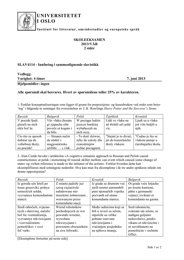UNIVERSITETET I OSLO In s titu tt fo r litte r a tu r , o m r å d e stu d ie r o g e u r o p e isk e sp r å k SKOLEEKSAMEN 2013/VÅR 2 sider SLAV4114 - Innføring i sammenlignende slavistikk Vedlegg: Varighet: 4 timer Hjelpemidler: ingen 7. juni 2013 Alle spørsmål skal besvares. Hvert av spørsmålene teller 25% av karakteren. 1. Forklar konseptualiseringen som ligger til grunn for preposisjons- og kasusbruken ved ordet som betyr ‘tog’ i følgende to setninger fra oversettelser av J. K. Rowlings Harry Potter and the Sorcerer’s Stone. Russisk V poezde ljudi glazeli na nich ešče bol´še. Čto ėto za sposob dobirat´sja do volšebnoj školy, na poezde! Bulgarsk Văv vlaka chorata gi zjapacha ošte poveče ot kogato i da bilo. — Stranen način da otideš v magjosničesko učilište … s vlak. Polsk W pociągu ludzie jeszcze bardziej wybałuszali na nich oczy. - To dość dziwne, żeby do szkoły dla czarodziejów jechać pociągiem. Tsjekkisk Lidé ve vlaku na ně třeštili oči ještě víc. Kroatisk Ljudi su u vlaku još više buljili u njih. "Stejně je to divné, jet do kouzelnické školy vlakem. "Čudno je što se vlakom putuje u čarobnjačku školu. 2. Alan Cienki hevder i artikkelen «A cognitive semantic approach to Russian and Polish causal constructions» at polsk i motsetning til russisk skiller mellom «an event which caused some change of state» og «when reference is made to the initiator of the action». Forklar hvordan dette kan eksemplifiseres med setningene nedenfor. Hva kan man fra eksemplene i de tre andre språkene utlede om denne opposisjonen? Russisk Iz goroda uže leteli po šosse gruzoviki, polnye nemeckich soldat, vyzvannye komendantom stancii. Sredi rabočich, svjazannych s derevnej, načalis´ bol´šie vozmuščenija, vyzvannye rekvizicijami i vozvraščeniem pomeščikov v svoi fol´varki. Polsk Z miasta pędziły już szosą ciężarówki naładowane niemieckimi żołnierzami , wezwanymi przez komendanta stacji. Wśród robotników pochodzących ze wsi powstało wrzenie, wywołane rekwizycjami i powrotem obszarników na swe folwarki. Kroatisk Iz grada su drumom već jurili teretni automobili puni njemačkih vojnika pozvanih od strane komandanta stanice. Bulgarsk Ot grada veče letjacha po šoseto kamioni, pălni s germanski vojnici, izvikani ot komendanta na garata. Među radnicima koji su bili u izvezi sa selom, otpočele su velike pobune izazvane rekvizicijama i vraćanjem posjednika na njihova imanja. Sred rabotnicite, svărzani săs seloto, se nadigna goljamo nedovolstvo, predizvikano ot rekviziciite i ot zavrăštaneto na pomešticite v technite čiflici. [Eksemplene fortsetter på neste side] Side 1 av 2 Russisk Sabina vnov´ predstavila sebe Tomaša, kak esli by on byl odnim iz ee cholstov: na perednem plane Don Žuan točno mnimaja dekoracija, napisannaja chudožnikom-primitivistom; Zakryv lico rukami, on, kazalos´, borolsja s šumom v golove, vyzvannym vodkoj. Ja uznal, čto v XX veke Ljuzaniju potrjas užasnyj krizis, vyzvannyj samozatmeniem nauki. Polsk Znów widziała Tomasza, jakby był na jednym z jej obrazów: na pierwszym planie Don Juan jako fałszywa dekoracja namalowana przez naiwnego malarza; Tsjekkisk Zase viděla Tomáše, jako by byl jedním z jejích obrazů: vpředu Don Juan jako falešná dekorace namalovaná naivním malířem; — spytał kremator, z twarzą w rękach, jakby walczył z wywołanym wódką oszołomieniem. Dowiedziałem się, że w XX wieku popadła Luzania w okropny kryzys, wywołany samozaćmieniem nauki. 3. Den russiske setningen nedenfor inneholder en syntaktisk konstruksjon som er forholdsvis uvanlig i de fleste andre slaviske språk. Forklar nærmere om dette. U hos-PREPOSISJON «Jeg har en bok» menja jeg-GEN. kniga bok-NOMIN.SG. 4. Forklar hva et Sprachbund er. Hvilke slaviske språk inngår i det balkanske Sprachbund? Pek på typiske Balkan-trekk i eksemplene nedenfor. Makedonsk Ne sakam da јa potchranuvam tvoјata sueta, dovolno samiot se grižiš za toa. Russisk Ne choču tešit´ tvoju gordost´. - Bulgarsk Ne iskam da podchranvam tvojata gordost, ti sam se grižiš za tova. - Serbisk Neću da u tebi potpirujem oholost, za to si se već i sam pobrinuo. Polsk Nie chcę karmić twojej dumy, sam już o to zadbasz. Tsjekkisk Nechci živit tvou pýchu, na to si stačíš sám. Kroatisk Ne želim podržavati tvoj ponos, za to se ti već sam brineš. Side 2 av 2