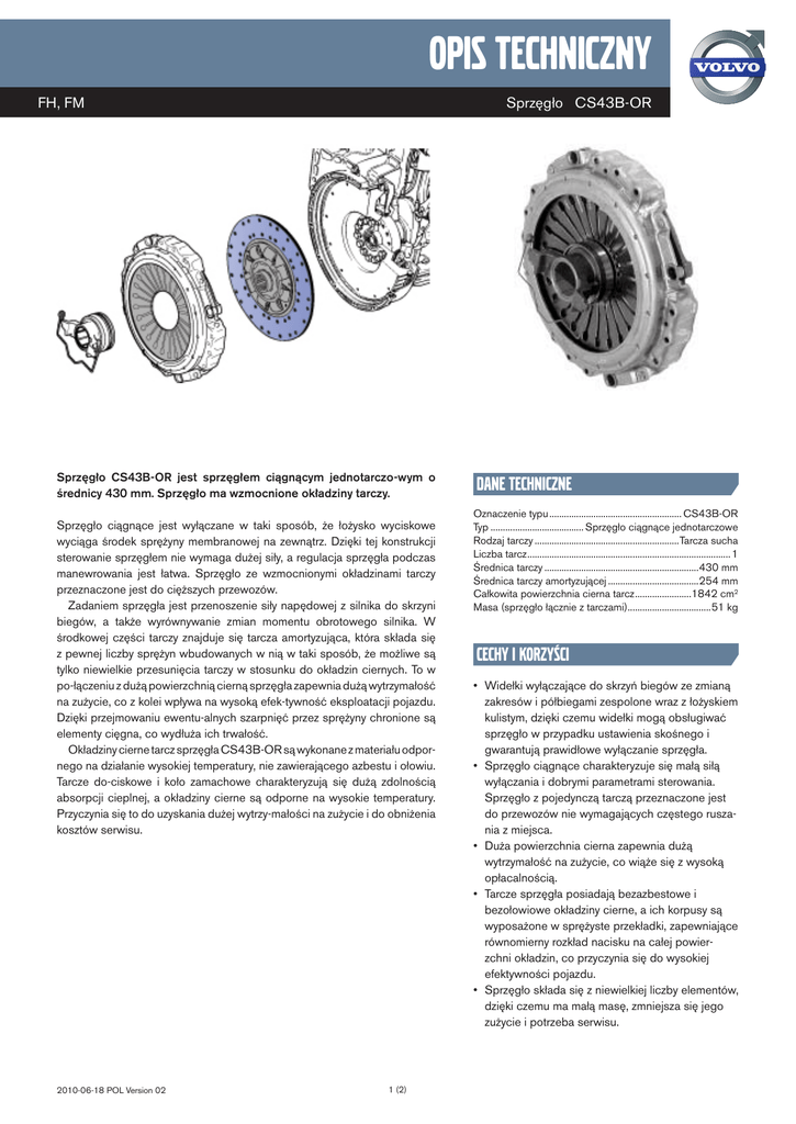 Opis techniczny Sprzęgło CS43B-OR FH, FM Sprzęgło CS43B-OR jest sprzęgłem ciągnącym jednotarczo-wym o średnicy 430 mm. Sprzęgło ma wzmocnione okładziny tarczy. Sprzęgło ciągnące jest wyłączane w taki sposób, że łożysko wyciskowe wyciąga środek sprężyny membranowej na zewnątrz. Dzięki tej konstrukcji sterowanie sprzęgłem nie wymaga dużej siły, a regulacja sprzęgła podczas manewrowania jest łatwa. Sprzęgło ze wzmocnionymi okładzinami tarczy przeznaczone jest do cięższych przewozów. Zadaniem sprzęgła jest przenoszenie siły napędowej z silnika do skrzyni biegów, a także wyrównywanie zmian momentu obrotowego silnika. W środkowej części tarczy znajduje się tarcza amortyzująca, która składa się z pewnej liczby sprężyn wbudowanych w nią w taki sposób, że możliwe są tylko niewielkie przesunięcia tarczy w stosunku do okładzin ciernych. To w po-łączeniu z dużą powierzchnią cierną sprzęgła zapewnia dużą wytrzymałość na zużycie, co z kolei wpływa na wysoką efek-tywność eksploatacji pojazdu. Dzięki przejmowaniu ewentu-alnych szarpnięć przez sprężyny chronione są elementy cięgna, co wydłuża ich trwałość. Okładziny cierne tarcz sprzęgła CS43B-OR są wykonane z materiału odpornego na działanie wysokiej temperatury, nie zawierającego azbestu i ołowiu. Tarcze do-ciskowe i koło zamachowe charakteryzują się dużą zdolnością absorpcji cieplnej, a okładziny cierne są odporne na wysokie temperatury. Przyczynia się to do uzyskania dużej wytrzy-małości na zużycie i do obniżenia kosztów serwisu. 2010-06-18 POL Version 02 1 (2) DANE TECHNICZNE Oznaczenie typu....................................................... CS43B-OR Typ....................................... Sprzęgło ciągnące jednotarczowe Rodzaj tarczy............................................................Tarcza sucha Liczba tarcz.................................................................................... 1 Średnica tarczy................................................................430 mm Średnica tarczy amortyzującej......................................254 mm Całkowita powierzchnia cierna tarcz........................1842 cm2 Masa (sprzęgło łącznie z tarczami)...................................51 kg CECHY I KORZYŚCI • Widełki wyłączające do skrzyń biegów ze zmianą zakresów i półbiegami zespolone wraz z łożyskiem kulistym, dzięki czemu widełki mogą obsługiwać sprzęgło w przypadku ustawienia skośnego i gwarantują prawidłowe wyłączanie sprzęgła. • Sprzęgło ciągnące charakteryzuje się małą siłą wyłączania i dobrymi parametrami sterowania. Sprzęgło z pojedynczą tarczą przeznaczone jest do przewozów nie wymagających częstego ruszania z miejsca. • Duża powierzchnia cierna zapewnia dużą wytrzymałość na zużycie, co wiąże się z wysoką opłacalnością. • Tarcze sprzęgła posiadają bezazbestowe i bezołowiowe okładziny cierne, a ich korpusy są wyposażone w sprężyste przekładki, zapewniające równomierny rozkład nacisku na całej powierzchni okładzin, co przyczynia się do wysokiej efektywności pojazdu. • Sprzęgło składa się z niewielkiej liczby elementów, dzięki czemu ma małą masę, zmniejsza się jego zużycie i potrzeba serwisu. Opis techniczny FH, FM Sprzęgło CS43B-OR Łatwe do sterowania sprzęgło z jedną tarczą Łatwe sterowanie sprzęgłem usprawnia pracę kierowcy Sprzęgło CS43B-O składa się z tarczy (1), tarczy dociskowej (2) i łożyska wycisko-wego (3). Tarcza posiada piastę z wewnętrznymi wypustami. Piasta jest osadzona na wale wejściowym skrzyni biegów, któ-ry posiada wypusty zewnętrzne. Oznacza to, że tarcza może się ślizgać wzdłuż wału. Konstrukcja ta zapewnia dobre parametry sterowania. Sterowanie sprzęgłem odbywa się za poś-rednictwem pneumatycznego układu wspomagania, dzięki czemu kierowca może z łatwością zmieniać biegi. Układ wspomagania jest sterowany ukła-dem hydraulicznym, którego cylinder główny znajduje się przy pedale sprzęgła w kabinie. Cylinder i zbiornik płynu są dostępne po otwarciu drzwiczek serwisowych z przodu pojazdu. Zadaniem ukła-du wspomagania jest przetwarzanie ciśnienia hydraulicznego z cylindra główne-go przy współudziale sprężonego powietrza na ruch mechaniczny. Dzięki wspomaganemu pneumatycznie układowi hydraulicznemu niewielka siła nacisku na pedał umożliwia miękkie włą-czanie i wyłączanie sprzęgła, co znacznie usprawnia pracę kierowcy. 2 3 1 Okładziny tarcz o dużej trwałości Tarcza sprzęgła ma postać płyty stalowej z przynitowanymi po obu stronach okła-dzinami ciernymi. Materiał okładzin nie zawiera azbestu ani ołowiu i jest odporny na działanie wysokich temperatur, jakie powstają w czasie poślizgu sprzęgła przy ruszaniu pojazdu z miejsca. Między okładzinami a płytą stalową znajduje się amortyzująca tarcza pośrednia, która rozkłada nacisk tarczy dociskowej równomiernie na całą powierzchnię cier-ną, co przyczynia się do wydłużenia okre-su eksploatacji. Wokół środka tarczy umieszczony jest amortyzator w postaci sprężyn, których zadaniem jest przejmowanie ewentualnych szarpnięć wibracji. Ponadto jest tu również mniejszy amortyzator, eliminujący hałas powstający w skrzyni biegów podczas pracy na biegu jałowym. Sprzęgło ciągnące zapewnia łatwe sterowanie W położeniu ciągnącym sprężyna membranowa naciska tzw. sprężynę wachla-rzową (1) na tarczy dociskowej (2), która z kolei ściska sprzęgło. Gdy sprzęgło jest ściśnięte, siła silnika jest przenoszona z koła zamachowego (3) poprzez tarcze (4) oraz piastę (5) na wał wejściowy skrzyni biegów (6). Wciśnięcie pedału sprzęgła powoduje przeniesienie siły na widełki wyłączające (7), które pociągają łożysko wyciskowe (8) do tyłu w kierunku skrzyni biegów. Łożysko wyciskowe wyciąga środek sprę-żyny m
