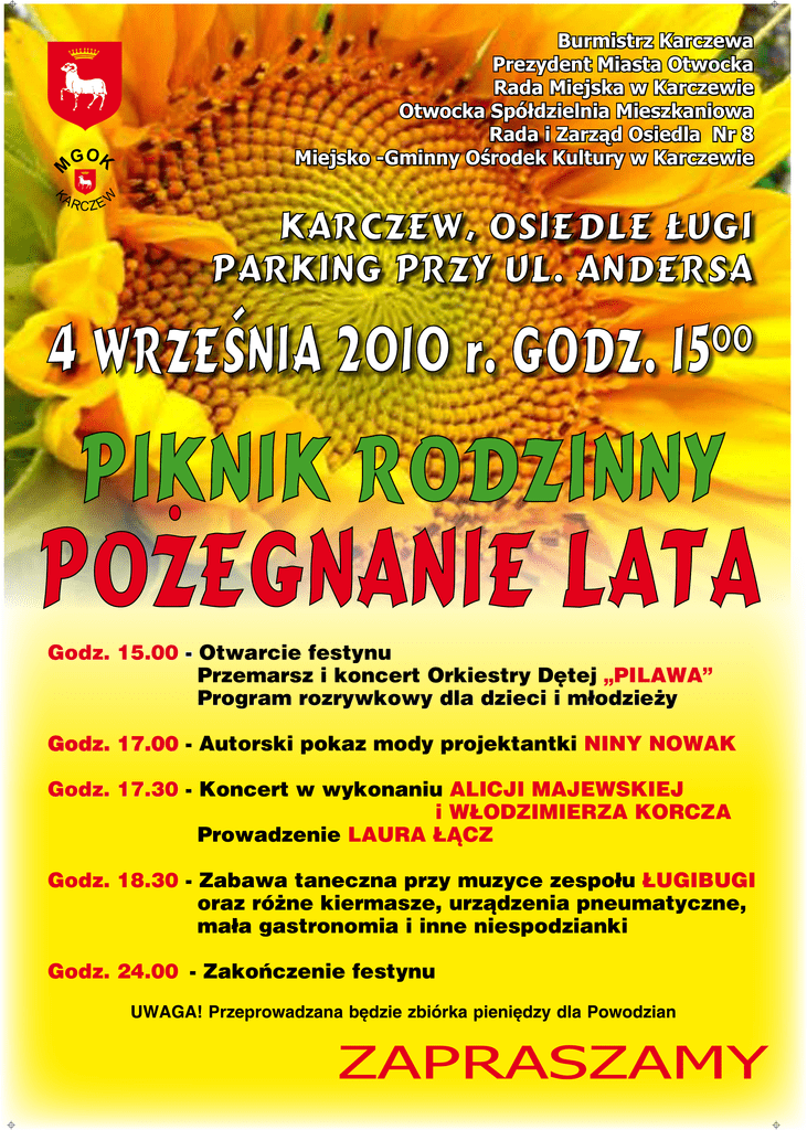 K AR W M GOK Burmistrz Karczewa Prezydent Miasta Otwocka Rada Miejska w Karczewie Otwocka Spółdzielnia Mieszkaniowa Rada i Zarząd Osiedla Nr 8 Miejsko -Gminny Ośrodek Kultury w Karczewie CZE Godz. 15.00 - O twarcie festynu Przemarsz i koncert Orkiestry Dętej „PILAWA” Program rozrywkowy dla dzieci i młodzieży Godz. 17.00 - Autorski pokaz mody projektantki NINY NOWAK Godz. 17.30 - Koncert w wykonaniu ALICJI MAJEWSKIEJ i WŁODZIMIERZA KORCZA Prowadzenie LAURA ŁĄCZ Godz. 18.30 - Zabawa taneczna przy muzyce zespołu ŁUGIBUGI oraz różne kiermasze, urządzenia pneumatyczne, mała gastronomia i inne niespodzianki Godz. 24.00 - Zakończenie festynu