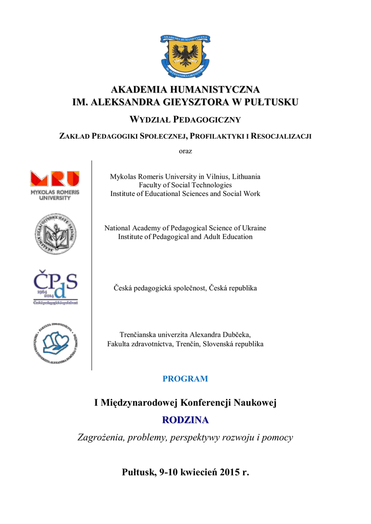 AKADEMIA HUMANISTYCZNA IM. ALEKSANDRA GIEYSZTORA W PUŁTUSKU WYDZIAŁ PEDAGOGICZNY ZAKŁAD PEDAGOGIKI SPOŁECZNEJ, PROFILAKTYKI I RESOCJALIZACJI oraz Mykolas Romeris University in Vilnius, Lithuania Faculty of Social Technologies Institute of Educational Sciences and Social Work National Academy of Pedagogical Science of Ukraine Institute of Pedagogical and Adult Education Česká pedagogická společnost, Česká republika Trenčianska univerzita Alexandra Dubčeka, Fakulta zdravotníctva, Trenčín, Slovenská republika PROGRAM I Międzynarodowej Konferencji Naukowej RODZINA Zagrożenia, problemy, perspektywy rozwoju i pomocy Pułtusk, 9-10 kwiecień 2015 r. DZIEŃ I konferencji Czwartek 9 kwiecień 2015 r. Sala Auditorium Maximum, ul. Daszyńskiego 17 9.00 – 10.00 Rejestracja uczestników w budynku głównym Centrum Akademickie nr 2, ul. Daszyńskiego 17. Kawa, herbata - barek kawowy obok sali Auditorium Maximum, ul. Daszyńskiego 17 10.00 – 10.15 Powitanie gości konferencji, uroczyste otwarcie obrad Dziekan Wydziału Pedagogicznego Akademii Humanistycznej im. Aleksandra Gieysztora w Pułtusku Dr Tadeusz Cichorz Przewodnicząca Komitetu Naukowo-Organizacyjnego Dr hab. Małgorzata Przybysz-Zaremba, prof. AH *** 10.15 – 11.45 Obrady plenarne, część I Moderatorzy: prof. zw. dr hab. Anna Kwak dr hab. Mirosława Nowak-Dziemianowicz, prof. DSW dr hab. Ewa Kantowicz, prof. UWM dr Tadeusz Cichorz, Dziekan Wydziału Pedagogicznego AH im. A. Gieysztora dr hab. Maciej Kołodziejski, prof. AH dr hab. Małgorzata Przybysz-Zaremba, prof. AH prof. zw. dr hab. Anna Kwak, Uniwersytet Warszawski Rodzina jako stała i zmieniająca się forma życia - siła więzi rodzinnych dr hab. Mirosława Nowak-Dziemianowicz, prof. DSW, Dolnośląska Szkoła Wyższa we Wrocławiu Między strukturą społeczną a światem życia. Współczesna rodzina w procesie zmiany ks. dr hab. Jan Niewęgłowski, prof. UKSW, Uniwersytet Kardynała Stefana Wyszyńskiego w Warszawie Idea małżeństwa i rodziny w nauczaniu Jana Pawła II dr hab. Ewa Kantowicz, prof. UWM, Uniwersytet Warmińsko-Mazurski w Olsztynie Współczesne wyzwania i programy pracy socjalnej z rodziną dr hab. Tomas Butvilas, prof. MRU, Mykolas Romeris University, Vilnius, Litwa Cooperation between families and institutions (kindergarten): Reggio Emilia Case 11.45- 12.15 Przerwa kawowa (barek kawowy obok sali Auditorium Maximum, ul. Daszyńskiego 17) 12.15 – 14.00 Obrady plenarne, część II dr hab. Justinas Sadauskas, prof. MRU, dr hab. Asta Railiene, prof. MRU, Mykolas Romeris University, Vilnius, Litwa Fulfilling Needs of Children from Social Risk Families in social work perpective dr hab. Hanna Żuraw, prof. WSNS, Pedagogium, Wyższa Szkoła Nauk Społecznych w Warszawie; Akademia Humanistyczna im. Aleksandra Gieysztora w Pułtusku Osoba niepełnosprawna w rodzinie - wątki rozproszone. Próba syntezy prof. zw. dr hab. Valdonė Indrašienė, dr Violeta Jegelevičienė, Mykolas Romeris University, Vilnius, Litwa Social pedagogical assistance for parents preparing children to change pre- school into preprimary school dr hab. Dorota Plucińska, Akademia Humanistyczna im. Aleksandra Gieysztora w Pułtusku W poszukiwaniu wzoru i autorytetu. Implikowany obraz rodziny w lekturach polonistycznych według podstawy programowej dr hab. Maria Boużyk, Uniwersytet Kardynała Stefana Wyszyńskiego w Warszawie Postulat wychowania otwartego na religię w ujęciu Jacka Woronieckiego – propozycja dla współczesnej rodziny dr hab. Maciej Kołodziejski, prof. AH, Akademia Humanistyczna im. Aleksandra Gieysztora w Pułtusku Rozwijanie audiacji muzycznej dziecka w rodzinie dr hab. Małgorzata Przybysz-Zaremba, prof. AH, Akademia Humanistyczna im. Aleksandra Gieysztora w Pułtusku Dynamizacja zachowań ryzykownych młodzieży jako implikacja problemów, dysfunkcji i patologii tkwiących w rodzinie 14.00 – 15.00 OBIAD (sala A, ul. Daszyńskiego 17) 15.00 – 16.00 WARSZTATY TWÓRCZE ul. Daszyńskiego 17 (zapisy podczas rejestracji – liczba miejsc ograniczona) dr Eliza Kiepura, Wideotrening komunikacji oraz terapia zabawowa we wspieraniu komunikacji rodziców i dzieci, (sala G, ul. Daszyńskiego 17) dr Bożena Józefów-Czerwińska, Radzenie sobie z konsekwencjami przemian ról społecznych kobiet i mężczyzn we współczesnych rodzinach, (sala K, ul. Daszyńskiego 17) mgr Łucja Worobiej, mgr Dawid Urbanowski, Sytuacja konfliktowa do porozumienia bez przemocy, (sala I, ul. Daszyńskiego 17) – dążenie 16.00 – 17.45 Obrady w sekcjach SEKCJA I RODZINA W DOBIE TRANSFORMACJI USTROJOWEJ - PRZEMIANY I EWALUACJE sala D (ul. Daszyńskiego 17) (obrady w sekcjach są otwarte, zaproszeni są wszyscy uczestnicy konferencji po dokonaniu wyboru jednej z nich, lub mogą się przemieszczać na budzące ich zainteresowanie tematy) Moderatorzy: dr hab. Mirosława Nowak-Dziemianowicz, prof. DSW, dr Bożena Józefów-Czerwińska, dr Magda Urbańska mgr Elwira Kamola, Uniwersytet Gdański Kilka refleksji o współczesnej rodzinie dr Weronika Juroszek, Uniwersytet Śląski w Katowicach Rodzice w roli teściów w świetle teorii Erika Eriksona dr Arkadiusz Durasiewicz, Wyższa Szkoła Pedagogiczna im. Janusza Korczaka w Warszawie Faktyczny, realizowany i preferowany model rodziny – w jakim kierunku będzie zmierzać współczesna rodzina? dr Magda Urbańska, Uniwersytet Rzeszowski Obraz świata rodzinnego w podręcznikach szkolnych mgr Paweł Łubiński, Uniwersytet Warmińsko-Mazurski w Olsztynie Nacjonalistyczna wizja współczesnego modelu rodziny – ujęcie teoretyczno - praktyczne dr Ewa Markowska-Gos, Uniwersytet Rzeszowski Samotne ojcostwo - wybrane aspekty. Komunikat z badań mgr Olga Smalej, Uniwersytet Marii Curie-Skłodowskiej w Lublinie Obraz medialny intencjonalnej bezdzietności mgr Aneta Scherer, Katolicki Uniwersytet Lubelski Jana Pawła II Rodzina wobec aborcji. Krótka mowa o wartości życia ludzkiego w fazie prenatalnej dr Danuta Kamilewicz-Rucińska, Un