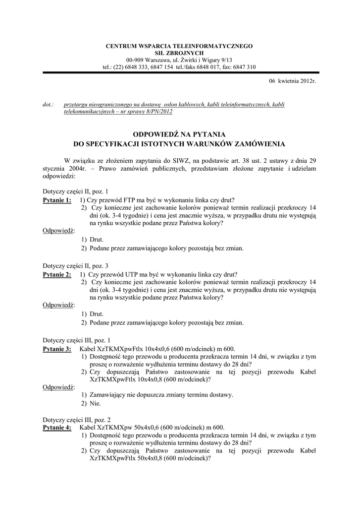 CENTRUM WSPARCIA TELEINFORMATYCZNEGO SIŁ ZBROJNYCH 00-909 Warszawa, ul. Żwirki i Wigury 9/13 tel.: (22) 6848 333, 6847 154 tel./faks 6848 017, fax: 6847 310 06 kwietnia 2012r. dot.: przetargu nieograniczonego na dostawę osłon kablowych, kabli teleinformatycznych, kabli telekomunikacyjnych – nr sprawy 8/PN/2012 ODPOWIEDŹ NA PYTANIA DO SPECYFIKACJI ISTOTNYCH WARUNKÓW ZAMÓWIENIA W związku ze złożeniem zapytania do SIWZ, na podstawie art. 38 ust. 2 ustawy z dnia 29 stycznia 2004r. – Prawo zamówień publicznych, przedstawiam złożone zapytanie i udzielam odpowiedzi: Dotyczy części II, poz. 1 Pytanie 1: 1) Czy przewód FTP ma być w wykonaniu linka czy drut? 2) Czy konieczne jest zachowanie kolorów ponieważ termin realizacji przekroczy 14 dni (ok. 3-4 tygodnie) i cena jest znacznie wyższa, w przypadku drutu nie występują na rynku wszystkie podane przez Państwa kolory? Odpowiedź: 1) Drut. 2) Podane przez zamawiającego kolory pozostają bez zmian. Dotyczy części II, poz. 3 Pytanie 2: 1) Czy przewód UTP ma być w wykonaniu linka czy drut? 2) Czy konieczne jest zachowanie kolorów ponieważ termin realizacji przekroczy 14 dni (ok. 3-4 tygodnie) i cena jest znacznie wyższa, w przypadku drutu nie występują na rynku wszystkie podane przez Państwa kolory? Odpowiedź: 1) Drut. 2) Podane przez zamawiającego kolory pozostają bez zmian. Dotyczy części III, poz. 1 Pytanie 3: Kabel XzTKMXpwFtlx 10x4x0,6 (600 m/odcinek) m 600. 1) Dostępność tego przewodu u producenta przekracza termin 14 dni, w związku z tym proszę o rozważenie wydłużenia terminu dostawy do 28 dni? 2) Czy dopuszczają Państwo zastosowanie na tej pozycji przewodu Kabel XzTKMXpwFtlx 10x4x0,8 (600 m/odcinek)? Odpowiedź: 1) Zamawiający nie dopuszcza zmiany terminu dostawy. 2) Nie. Dotyczy części III, poz. 2 Pytanie 4: Kabel XzTKMXpw 50x4x0,6 (600 m/odcinek) m 600. 1) Dostępność tego przewodu u producenta przekracza termin 14 dni, w związku z tym proszę o rozważenie wydłużenia terminu dostawy do 28 dni? 2) Czy dopuszczają Państwo zastosowanie na tej pozycji przewodu Kabel XzTKMXpwFtlx 50x4x0,8 (600 m/odcinek)? Odpowiedź: 1) Zamawiający nie dopuszcza zmiany terminu dostawy. 2) Nie. Dotyczy części III, poz. 5 Pytanie 5: Kabel YTKSY 1x4x0,5 (500 m/odcinek) m 8500. Czy dopuszczają Państwo dostawę w różnych odcinkach 100 m, 200 m, 300 m, 500 m, spowodowane to jest potrzebą produkcji takiej ilości odcinków 500 m? Odpowiedź: Nie, tylko odcinki 500 m. Dotyczy części III, poz. 6 Pytanie 6: Kabel YTKSY 1x4x0,5c (500 m/odcinek) m 3500. Czy na tej pozycji dopuszczają Państwo Kabel YTKSY 1x4x0,5? Odpowiedź: Nie. Dotyczy części III, poz. 7 Pytanie 7: Kabel YTKSY 5x2x0,5 (500 m/odcinek) m 5500. Czy dopuszczają Państwo na tej pozycji Kabel YTKSYekw 5x2x0,5 z powodu lepszej dostępności? Odpowiedź: Nie. Dotyczy części III, poz. 8 Pytanie 8: Kabel YTKSYekw 10x2x0,5 (500 m/odcinek) m 700. Czy dopuszczają Państwo odcinki 200 m, 500 m? Odpowiedź: Tak. Jeden odcinek -500m, drugi odcinek – 200m. Czy zamawiający dopuści kable produkowane w całym 2011 roku a nie tylko w drugiej jego połowie? Odpowiedź: Zamawiający nie dopuszcza zmiany daty produkcji kabli. Pytanie 9: Czy zamawiający dopuści czas realizacji zamówienia w zakresie zadania II i III do 4 tygodni od zawarcia umowy, ponieważ niektóre kable będące przedmiotem zamówienia są kablami produkowanymi na zamówienie a czas realizacji takich zamówień to min. 4 tygodnie ? Odpowiedź: Zamawiający nie dopuszcza zmiany terminu dostawy. Pytanie 10: W części 2 jaki rodzaj kabla ma zostać zaproponowany, (jakiej konstrukcji) drut czy linka, o jakiej średnicy żyły AWG? W jaki sposób kabel z części II pozycja nr 1 ma być ekranowany ? Informacje z „Formularza ofertowego” są niewystarczające do zaproponowania odpowiednich kabli. Odpowiedź: Odcinki kabli FTP KAT5e 4x2x0,5 oraz kabli UTP KAT5e 4x2x0,5 mają być typu drut. Średnica żyły 0,5 – drut. Kabel wykonany zgodnie z normą ANSI/TIA/EIA-568-A-5, tj. ekran z AL wraz z żyłą uziemiającą. Pytanie 11: W części 2 poz. 1 i poz. 3 zamawiający określa kolor kabli trasowych jako czerwony. Zgodnie z polskim prawem, kolor czerwony zarezerwowany jest dla kabli systemu p. poż. W związku z tym czy zamawiający dopuszcza zmianę kolorystyki ? Odpowiedź: Zamawiający nie dopuszcza zmiany kolorystyki kabli. Pytanie 12: Pytanie 13: W związku z zaistniałymi wątpliwościami proszę o wydłużenie terminu składania ofert do dnia 16.04.2012r. Odpowiedź: Zamawiający nie zmienia terminu składania ofert, obowiązującym terminem jest 11.04.2012r. Zważywszy, iż uwzględnienie powyższych wyjaśnień w treści przygotowanych przez Państwa ofert nie wymaga dodatkowego nakładu pracy, dotychczasowy termin składania ofert do dnia 11.04.2012r. godz. 1000 i otwarcia ofert 11.04.2012r. godz. 1100 pozostaje bez zmian. SZEF wz. płk Marek JURECKI