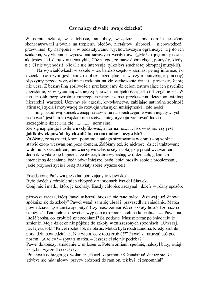 Czy należy chwalić swoje dziecko? W domu, szkole, w autobusie, na ulicy, wszędzie – my dorośli jesteśmy skoncentrowani głównie na tropieniu błędów, nietaktów, słabości, niepowodzeń przewinień, by następnie – w oddziaływaniu wychowawczym ograniczyć się do ich szukania, wytykania i wydawania surowych werdyktów. („Może i pięknie piszesz, ale jesteś taki słaby z matematyki!, Cóż z tego, że masz dobre chęci, pomysły, kiedy nic Ci nie wychodzi!. Nic Cię nie interesuje, tylko byś słuchał tej okropnej muzyki!). Na wywiadówkach w szkole – też bardzo często – zamiast pełnej informacji o dziecku (w czym jest bardzo dobre, przeciętne, a w czym potrzebuje pomocy) słyszymy przede wszystkim narzekania na złe zachowanie dzieci i pretensje, że się nie uczą. Z bezmyślną gorliwością przekazujemy dzieciom zatruwające ich psychikę przesłanie, że w życiu najważniejszą sprawą i umiejętnością jest dostrzeganie zła. W ten sposób bezpowrotnie zaprzepaszczamy szansę przekazania dzieciom istotnej hierarchii wartości. Uczymy się agresji, krytykanctwa, zabijając naturalną zdolność afirmacji życia i motywację do rozwoju własnych umiejętności i zdolności. Inną szkodliwą konsekwencją nastawienia na spostrzeganie wad i negatywnych zachowań jest bardzo wąska i nieuczciwa kategoryzacja zachowań ludzi (a szczególnie dzieci) na złe i ............. normalne. Złe się napiętnuje i usiłuje modyfikować, a normalne........ No, właśnie: czy jest jakikolwiek powód, by chwalić to, co normalne i oczywiste? Załóżmy, że są dzieci, które pomimo ciągłego strofowania w domu – są zdolne stawić czoło wezwaniom poza domem. Załóżmy też, że niektóre dzieci traktowane w domu z szacunkiem, nie wierzą we własne siły i cofają się przed wyzwaniem. Jednak wydaje się logiczne, że dzieci, które wyrastają w rodzinach, gdzie ich intencje są doceniane, będą odważniejsze, będą lepiej radziły sobie z problemami, jakie przynosi życie i będą stawiały sobie wyższe cele. Przedstawię Państwu przykład obrazujący to zjawisko. Było dwóch siedmioletnich chłopców o imionach Paweł i Sławek. Obaj mieli matki, które je kochały. Każdy chłopiec zaczynał dzień w różny sposób: pierwszą rzeczą, którą Paweł usłyszał, budząc się rano było: „Wstawaj już! Znowu spóźnisz się do szkoły” Paweł wstał, sam się ubrał i przyszedł na śniadanie. Matka powiedziała : „Gdzie twoje buty? Czy masz zamiar iść do szkoły boso? I zobacz co założyłeś! Ten niebieski sweter wygląda okropnie z zieloną koszulą.......... Paweł na litość boską, co zrobiłeś ze spodniami? Są podarte. Musisz zaraz po śniadaniu je zmienić. Moje dziecko nie pójdzie do szkoły w zniszczonych spodniach....Uważaj, jak lejesz sok!” Paweł rozlał sok na obrus. Matka była rozdrażniona. Kiedy zrobiła porządek, powiedziała : „Nie wiem, co z tobą zrobić!?” Paweł zamruczał coś pod nosem. „A to co? – spytała matka. – Jeszcze ci się nie podoba?” Paweł dokończył śniadanie w milczeniu. Potem zmienił spodnie, nałożył buty, wziął książki i wyszedł do szkoły. Po chwili dobiegło go wołanie: „Paweł, zapomniałeś śniadania! Założę się, że gdybyś nie miał głowy przytwierdzonej do ramion, też byś jej zapomniał” Sławek mieszkał po drugiej stronie ulicy. Pierwsze, co usłyszał rano to: „Już siódma Sławek. Czy wstaniesz zaraz, czy też poleżysz jeszcze pięć minut?” Sławek obrócił się na drugi bok i ziewnął. „Jeszcze pięć minut” – wymamrotał. Przyszedł na śniadanie ubrany, bez butów. Matka zauważyła: „O jesteś już ubrany. Zapomniałeś tylko założyć buty!. Och spodnie Ci się rozpruły. Mogą Ci pęknąć do reszty. Mam je zszyć na tobie, czy wolisz zmienić na inne? Sławek pomyślał sekundę i powiedział zmienię je po śniadaniu” usiadł przy stole i zaczął nalewać sok. Rozlał trochę. Ścierka jest w zlewie” powiedziała mama zajęta przygotowywaniem drugiego śniadania. Sławek wziął ścierkę i starł to co, się rozlało. W czasie śniadania rozmawiali trochę. Kiedy skończył, zmienił spodnie, wziął buty, wziął książki i wyszedł do szkoły- bez śniadania. Matka zawołała po chwili: „Sławek, twoje śniadanie!” Wrócił po nie szybko i podziękował. Kiedy dawała mu je powiedziała: Do zobaczenia”. Paweł i Sławek mieli tego samego nauczyciela. Podczas lekcji zwrócił się do wszystkich uczniów „Potrzebni są chętni do malowania plakatów powitalnych. Potrzebujemy też ochotników do nalewania i podawania napoi naszym gościom. I jeszcze potrzebujemy kogoś, kto pójdzie do klasy III i wygłosi mowę zapraszającą każdego do zabawy”. Niektóre dzieci natychmiast zgłosiły się, inne po chwili, a jeszcze inne nie podniosły rąk wcale. Proszę domyśleć się ciągu dalszego i spróbować odpowiedzieć nam na pytanie 1. Czy Paweł zgłosił się jako ochotnik? 2. A Sławek? 3. Jaka jest relacja między tym co dzieci myślą o sobie , a ich gotowością do stawienia czoła wyzwaniu? 4. Jaka jest relacja między tym, co dzieci myślą o sobie, a rodzajem stawiania sobie celów? Jeżeli samoocena jest taka ważna, to co jako rodzic możemy zrobić, aby ją uwypuklić? Za każdym razem kiedy okazujemy szacunek uczuciom dziecka, gdy oferujemy mu szansę dokonywania wyboru lub rozwiązania jakiegoś problemu – rośnie w nim zaufanie i szacunek dla samego siebie. Pomocne w budowaniu pozytywnego i realistycznego wyobrażenia o sobie jest udzielenie dzieciom pochwał. Ale nie jest to wcale takie proste. Czasami w najlepszej wierze udzielona pochwała przynosi nieoczekiwanie efekty (np. gdy chwalony przez gości, nauczyciela rysunek został namalowany przez kogoś innego). Dobra pochwała składa się z dwóch części: 1. dorosły opisuje z uznaniem, co widzi lub czuje, 2. dziecko – po wysłuchaniu opinii