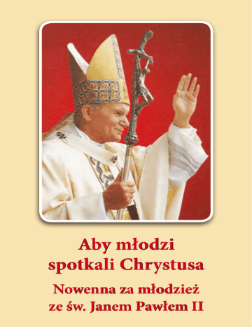 Aby młodzi spotkali Chrystusa Nowenna za młodzież ze św. Janem Pawłem II MODLITWA ZA MŁODYCH DO ŚW. JANA PAWŁA II Święty Janie Pawle, Twoją radością były spotkania z młodymi. Byłeś i pozostałeś dla młodych ojcem, przyjacielem i przewodnikiem. Młodzież wiedziała, że ich kochasz, i dlatego słuchała Cię uważnie, gdy głosiłeś trudne zasady Ewangelii. Ukazywałeś słowem, życiem i miłością, że Chrystus jest Drogą, Prawdą i Życiem. Wzywałeś młodych: „Wymagajcie od siebie, nawet gdyby inni od was nie wymagali”. Ostrzegałeś, aby nie przegrali życia i miłości. Przeciwstawiając się cywilizacji użycia, głosiłeś, że grzechy nieczyste nie są ani wolnością, ani miłością. Oddajemy Twojej opiece ludzi młodych. Prosimy, swoim wstawiennictwem obroń ich przed zagrożeniami, ułudą, przed zmarnowaniem życia. Niech budują przyszłość na fundamencie Chrystusa i jego Ewangelii, traktując życie jako Boże powołanie. Niech młodzi, wpatrzeni w Twój przykład, zaufają prawdzie i miłości Chrystusowej. bp Jan Szkodoń WPROWADZENIE Dlaczego młodzi ludzie potrzebują modlitwy? Ponieważ młodość to szczególny czas, w którym kształtują się i wykuwają ich dalsze losy. Młodzi potrzebują wsparcia w tym procesie tym bardziej, że świat atakuje ich dziś często w samym sercu ich młodego człowieczeństwa. A od tego, z jakimi wartościami zwiążą się młodzi ludzie, zależeć będzie ich dojrzałe życie. Także życie ich rodzin, które stworzą, i społeczności, której cząstkę będą stanowić. Czy można więc wątpić, że Tym, z którym powinni się związać przede wszystkim, jest Jezus Chrystus? Święty Jan Paweł II w Liście do Młodych pisał: „Życzę Wam […] ażeby drogi Waszej młodości spotykały się z Chrystusem”. Papież kochał młodych i dlatego właśnie odsyłał ich wciąż do Chrystusa, ukazując, że tylko opierając się na Nim, są w stanie owocnie przeżyć swoje życie. Tę nowennę ludzie młodzi mogą odprawić za siebie i swoich przyjaciół, a starsi – modlić się za swoje dzieci i wnuki. Wszyscy zaś mogą ją ofiarować w intencji młodych ludzi z całego świata, którzy w ostatnim tygodniu lipca tego roku zgromadzą się w Krakowie z okazji Światowych Dni Młodzieży. Będą się one odbywać tym razem pod hasłem „Błogosławieni miłosierni, albowiem oni miłosierdzia dostąpią” (Mt 5,7). Niech nasz Niebieski Ojciec da poznać swoją miłosierną miłość każdej młodej dziewczynie i każdemu młodemu chłopcu przybywającym w tym roku do Polski. 1 DZIEŃ PIERWSZY 31 lipca – niedziela O szczęśliwe i mądre przeżycie młodości „Życie to czas, który został nam podarowany i w którym każdy z nas staje wobec wyzwania, jakie niesie samo życie: to wyzwanie polega na znalezieniu swojego celu, prze-znaczenia i na walce o nie. Alternatywą jest przeżycie tego czasu w sposób powierzchowny, »utracenie« życia dla marności; nieumiejętność odkrycia w sobie zdolności do dobra i tym samym także drogi do prawdziwego szczęścia. Zbyt wielu młodych ludzi nie zdaje sobie sprawy, że sami są w głównej mierze odpowiedzialni za nadanie głębokiego sensu własnemu życiu. Tajemnica wolności należy do samej istoty tej wielkiej przygody, jaką jest życie dobrze przeżyte” – Jan Paweł II, Manila, 14 stycznia 1995 r. Panie, w Twoim zamyśle młodość jest szczególnym czasem, w którym możemy nakreślić „projekt” swojego życia. To wtedy mamy zapał i siłę, by wsłuchać się w głębokie pragnienia serca, by zmierzyć się ze swoimi ograniczeniami i by wybrać życiową drogę, którą będziemy podążać. To wtedy możemy odnieść zwycięstwa, ale i doświadczyć porażek, które mogą rzutować na całe życie… 2 Rozpoczynając tę nowennę, chcę oddać Tobie wszystkich młodych i prosić, by chcieli zaangażować się w życie. Polecam Ci tych, którym nie chce się żyć, których życiowe warunki są tak trudne, że odebrały im nadzieję, ale także i tych, którzy rozleniwieni w dobrobycie żyją tylko na poziomie zmysłów, zapominając o swojej sferze duchowej i psychicznej. Powierzam Ci tych, którzy codziennie zmagają się ze smutkiem, i tych, którzy nie widząc sensu w dalszym istnieniu, zmagają się z pokusą samobójstwa. Proszę Cię także za tych, którzy życie utożsamiają z „u-życiem” – z bezmyślnym konsumowaniem wszelkiego rodzaju dóbr, byś rozpalił w nich pragnienie życia głębokiego i sensownego. Proszę, byś Ty, który jesteś Życiem, wszystkich ludzi młodych przyprowadził do źródła wody żywej i rozbudził w nich pragnienie życia! Ojcze nasz… Zdrowaś Mario… Chwała Ojcu… Święty Janie Pawle II, módl się za nami! DZIEŃ DRUGI 1 sierpnia – poniedziałek O osobiste spotkanie z Chrystusem dla każdej młodej osoby „Nieraz człowiek, młody człowiek, bywa zagubiony w sobie samym, w otaczającym świecie, 3 w całej sieci spraw ludzkich, które go oplątują. Pozwólcie się znaleźć Chrystusowi. Niech wie o was wszystko i niech was prowadzi. To prawda, że – aby za Nim iść, podążać – trzeba równocześnie od siebie samego wymagać, ale takie jest prawo przyjaźni. Jeśli mamy iść razem, musimy pilnować drogi, po której idziemy. Jeśli poruszamy się w górach, trzeba przestrzegać znaków. Jeśli jesteśmy na wspinaczce, nie wolno popuścić liny. Podobnie trzeba też zachowywać łączność z tym Boskim Przyjacielem, któremu na imię Jezus Chrystus. I trzeba z Nim współpracować” – Jan Paweł II, Kraków, 8 czerwca 1979 r. Panie, dziękuję Ci za to, że stałeś się człowiekiem, umarłeś i zmartwychwstałeś dla każdego z nas, także dla każdej młodej dziewczyny i każdego młodego chłopca. Każdy z nich jest cenny w Twoich oczach, każdego z nich wzywasz po imieniu – nawet jeśli Twojego głosu nie chcą słyszeć, jeśli od niego uciekają, jeśli słu