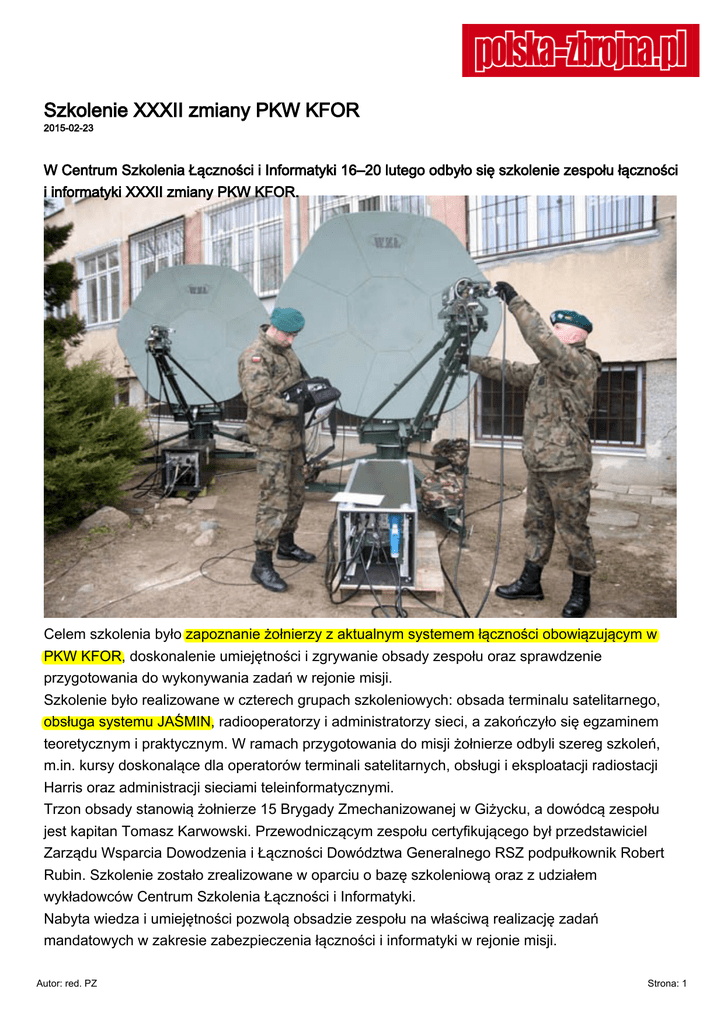 Szkolenie XXXII zmiany PKW KFOR 2015-02-23 W Centrum Szkolenia Łączności i Informatyki 16–20 lutego odbyło się szkolenie zespołu łączności i informatyki XXXII zmiany PKW KFOR. Celem szkolenia było zapoznanie żołnierzy z aktualnym systemem łączności obowiązującym w PKW KFOR, doskonalenie umiejętności i zgrywanie obsady zespołu oraz sprawdzenie przygotowania do wykonywania zadań w rejonie misji. Szkolenie było realizowane w czterech grupach szkoleniowych: obsada terminalu satelitarnego, obsługa systemu JAŚMIN, radiooperatorzy i administratorzy sieci, a zakończyło się egzaminem teoretycznym i praktycznym. W ramach przygotowania do misji żołnierze odbyli szereg szkoleń, m.in. kursy doskonalące dla operatorów terminali satelitarnych, obsługi i eksploatacji radiostacji Harris oraz administracji sieciami teleinformatycznymi. Trzon obsady stanowią żołnierze 15 Brygady Zmechanizowanej w Giżycku, a dowódcą zespołu jest kapitan Tomasz Karwowski. Przewodniczącym zespołu certyfikującego był przedstawiciel Zarządu Wsparcia Dowodzenia i Łączności Dowództwa Generalnego RSZ podpułkownik Robert Rubin. Szkolenie zostało zrealizowane w oparciu o bazę szkoleniową oraz z udziałem wykładowców Centrum Szkolenia Łączności i Informatyki. Nabyta wiedza i umiejętności pozwolą obsadzie zespołu na właściwą realizację zadań mandatowych w zakresie zabezpieczenia łączności i informatyki w rejonie misji. Autor: red. PZ Strona: 1