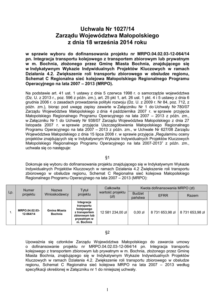 Uchwała Nr 1027/14 Zarządu Województwa Małopolskiego z dnia 18 września 2014 roku w sprawie wyboru do dofinansowania projektu nr MRPO.04.02.03-12-064/14 pn. Integracja transportu kolejowego z transportem zbiorowym lub prywatnym w m. Bochnia, złożonego przez Gminę Miasta Bochnia, znajdującego się w Indykatywnym Wykazie Indywidualnych Projektów Kluczowych w ramach Działania 4.2. Zwiększenie roli transportu zbiorowego w obsłudze regionu, Schemat C Regionalna sieć kolejowa Małopolskiego Regionalnego Programu Operacyjnego na lata 2007 – 2013 (MRPO). Na podstawie art. 41 ust. 1 ustawy z dnia 5 czerwca 1998 r. o samorządzie województwa (Dz. U. z 2013 r., poz. 596 z późn. zm.), art. 25 pkt 1, art. 26 ust. 1 pkt. 4 i 5 ustawy z dnia 6 grudnia 2006 r. o zasadach prowadzenia polityki rozwoju (Dz. U. z 2009 r. Nr 84, poz. 712, z późn. zm.), biorąc pod uwagę zapisy zawarte w Załączniku Nr 1 do Uchwały Nr 780/07 Zarządu Województwa Małopolskiego z dnia 4 października 2007 r. w sprawie przyjęcia Małopolskiego Regionalnego Programu Operacyjnego na lata 2007 – 2013 z późn. zm., w Załączniku Nr 1 do Uchwały Nr 938/07 Zarządu Województwa Małopolskiego z dnia 27 listopada 2007 r. w sprawie przyjęcia Uszczegółowienia Małopolskiego Regionalnego Programu Operacyjnego na lata 2007 – 2013 z późn. zm., w Uchwale Nr 627/08 Zarządu Województwa Małopolskiego z dnia 15 lipca 2008 r. w sprawie przyjęcia „Regulaminu oceny projektów znajdujących się w Indykatywnym Wykazie Indywidualnych Projektów Kluczowych Małopolskiego Regionalnego Programu Operacyjnego na lata 2007-2013” z późn. zm., uchwala się co następuje: §1 Dokonuje się wyboru do dofinansowania projektu znajdującego się w Indykatywnym Wykazie Indywidualnych Projektów Kluczowych w ramach Działania 4.2 Zwiększenie roli transportu zbiorowego w obsłudze regionu, Schemat C Regionalna sieć kolejowa Małopolskiego Regionalnego Programu Operacyjnego na lata 2007 – 2013 (MRPO): Lp. 1. Numer projektu MRPO.04.02.0312-064/14 Nazwa Wnioskodawcy Tytuł projektu Gmina Miasta Bochnia Integracja transportu kolejowego z transportem zbiorowym lub prywatnym w m. Bochnia Całkowita wartość projektu (zł) 12 581 234,00 zł Kwota dofinansowania MRPO (zł) Budżet EFRR Razem państwa 0,00 zł 8 731 653,98 zł 8 731 653,98 zł §2 Upoważnia się członków Zarządu Województwa Małopolskiego do zawarcia umowy o dofinansowanie projektu nr MRPO.04.02.03-12-064/14 pn. Integracja transportu kolejowego z transportem zbiorowym lub prywatnym w m. Bochnia, złożonego przez Gminę Miasta Bochnia, znajdującego się w Indykatywnym Wykazie Indywidualnych Projektów Kluczowych w ramach Działania 4.2. Zwiększenie roli transportu zbiorowego w obsłudze regionu, Schemat C Regionalna sieć kolejowa MRPO na lata 2007 – 2013 według specyfikacji określonej w Załączniku nr 1 do niniejszej uchwały. 1 §3 Wykonanie uchwały powierza się Sekretarzowi Województwa. §4 Uchwała wchodzi w życie z dniem podjęcia. 2 UZASADNIENIE do Uchwały Nr 1027/14 Zarządu Województwa Małopolskiego z dnia 18 września 2014 roku w sprawie wyboru do dofinansowania projektu nr MRPO.04.02.03-12-064/14 pn. Integracja transportu kolejowego z transportem zbiorowym lub prywatnym w m. Bochnia, złożonego przez Gminę Miasta Bochnia, znajdującego się w Indykatywnym Wykazie Indywidualnych Projektów Kluczowych w ramach Działania 4.2. Zwiększenie roli transportu zbiorowego w obsłudze regionu, Schemat C Regionalna sieć kolejowa MRPO na lata 2007 – 2013. Przedmiotem projektu jest budowa węzła przesiadkowego w ramach systemu parkingów „Park & Ride”, integrującego różne rodzaje transportu. Planowana inwestycja zlokalizowana będzie w bezpośrednim sąsiedztwie dworca kolejowego w Bochni, przy ulicy Księcia Józefa Poniatowskiego. W ramach realizacji projektu przewidziano wykonanie: - budynku garażu czteropoziomowego o minimalnej ilości 192 miejsc postojowych dla samochodów osobowych (parking Park & Ride), - parkingu naziemnego z zadaszonymi stanowiskami dla minimum 40 rowerów i minimum 24 motorów i skuterów (parking Bike & Ride), - zatok postojowych dla samochodów osobowych (Kiss & Ride), umożliwiających bezkolizyjne zatrzymanie się pojazdu podwożącego pasażera, - stanowisk przyjazdowych busów miejskich i regionalnych. Zgodnie z „Regulaminem oceny projektów znajdujących się w Indykatywnym Wykazie Indywidualnych Projektów Kluczowych Małopolskiego Regionalnego Programu Operacyjnego na lata 2007 – 2013” Wnioskodawca złożył dokumentację aplikacyjną w dniu 30 maja 2014 r. Zgodnie z procedurą wyboru projektów została przeprowadzona ocena formalna wniosku, a następnie ocena merytoryczna, której składowymi są: ocena finansowa oraz właściwa ocena merytoryczna. W dniu 12 września 2014 r. zakończył się etap właściwej oceny merytorycznej wniosku. Projekt uzyskał 45 pkt, co stanowi 83,33 % maksymalnej liczby punktów możliwych do uzyskania na etapie oceny merytorycznej właściwej. Ostatnim etapem procedury jest dokonanie przez Zarząd Województwa Małopolskiego wyboru projektu do dofinansowania. Dostępne środki w ramach Działania 4.2 Zwiększenie roli transportu zbiorowego w obsłudze regionu, Schemat C Regionalna sieć kolejowa Małopolskiego Regionalnego Programu Operacyjnego na lata 2007 – 2013 (MRPO) pozwalają na pełne dofinansowanie projektu nr MRPO.04.02.03-12-064/14 w kwocie 8 731 653,98 zł. 3 Załącznik nr 1 do Uchwały Nr 1027/14 Zarządu Województwa Małopolskiego z dnia 18 września 2014 r. Do zawarcia umowy o dofinansowanie projektu nr MRPO.04.02.03-12-064/14 pn. Integracja transportu kolejowego z transportem zbiorowym lub prywatnym w m. Bochnia, złożonego przez Gminę Miasta Bochnia, znajdującego się w Indykatywnym Wykazie Indywidualnych Projektów Kluczowych w ramach Działania 4.2. Zwiększenie roli transportu zbiorowego w obsłudze regionu, Schemat C Regional