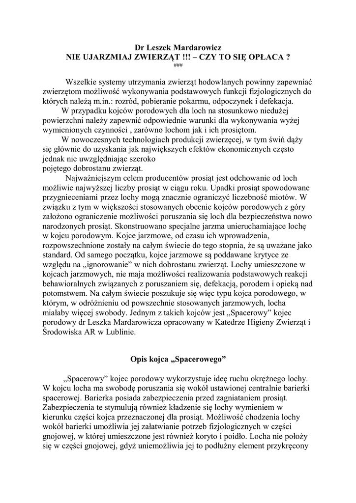Dr Leszek Mardarowicz NIE UJARZMIAJ ZWIERZĄT !!! – CZY TO SIĘ OPŁACA ? ### Wszelkie systemy utrzymania zwierząt hodowlanych powinny zapewniać zwierzętom możliwość wykonywania podstawowych funkcji fizjologicznych do których należą m.in.: rozród, pobieranie pokarmu, odpoczynek i defekacja. W przypadku kojców porodowych dla loch na stosunkowo niedużej powierzchni należy zapewnić odpowiednie warunki dla wykonywania wyżej wymienionych czynności , zarówno lochom jak i ich prosiętom. W nowoczesnych technologiach produkcji zwierzęcej, w tym świń dąży się głównie do uzyskania jak największych efektów ekonomicznych często jednak nie uwzględniając szeroko pojętego dobrostanu zwierząt. Najważniejszym celem producentów prosiąt jest odchowanie od loch możliwie najwyższej liczby prosiąt w ciągu roku. Upadki prosiąt spowodowane przygnieceniami przez lochy mogą znacznie ograniczyć liczebność miotów. W związku z tym w większości stosowanych obecnie kojców porodowych z góry założono ograniczenie możliwości poruszania się loch dla bezpieczeństwa nowo narodzonych prosiąt. Skonstruowano specjalne jarzma unieruchamiające lochę w kojcu porodowym. Kojce jarzmowe, od czasu ich wprowadzenia, rozpowszechnione zostały na całym świecie do tego stopnia, że są uważane jako standard. Od samego początku, kojce jarzmowe są poddawane krytyce ze względu na „ignorowanie” w nich dobrostanu zwierząt. Lochy umieszczone w kojcach jarzmowych, nie maja możliwości realizowania podstawowych reakcji behawioralnych związanych z poruszaniem się, defekacją, porodem i opieką nad potomstwem. Na całym świecie poszukuje się więc typu kojca porodowego, w którym, w odróżnieniu od powszechnie stosowanych jarzmowych, locha miałaby więcej swobody. Jednym z takich kojców jest „Spacerowy” kojec porodowy dr Leszka Mardarowicza opracowany w Katedrze Higieny Zwierząt i Środowiska AR w Lublinie. Opis kojca „Spacerowego” „Spacerowy” kojec porodowy wykorzystuje ideę ruchu okrężnego lochy. W kojcu locha ma swobodę poruszania się wokół ustawionej centralnie barierki spacerowej. Barierka posiada zabezpieczenia przed zagniataniem prosiąt. Zabezpieczenia te stymulują również kładzenie się lochy wymieniem w kierunku części kojca przeznaczonej dla prosiąt. Możliwość chodzenia lochy wokół barierki umożliwia jej załatwianie potrzeb fizjologicznych w części gnojowej, w której umieszczone jest również koryto i poidło. Locha nie położy się w części gnojowej, gdyż uniemożliwia jej to podłużny element przykręcony do podłoża . Charakterystycznym elementem tego kojca jest pięcioczęściowa, rozsuwana teleskopowo barierka, oddzielająca lochę od prosiąt. Dzięki czemu można dostosowywać kojec dla loch o różnej wielkości. Obsługiwanie chlewni porodowej wyposażonej w tego typu kojce jest wygodne i proste. Schemat „spacerowego” kojca porodowego W Katedrze Higieny Zwierząt i Środowiska AR w Lublinie przeprowadzono szczegółowe badania dotyczące zachowania się loch i prosiąt oraz efektów produkcyjnych w „Spacerowych” kojcach porodowych i powszechnie stosowanych jarzmowych.. Badania przeprowadzano w gospodarstwie pana Bączyka w Srebrnej gdzie zainstalowano 20 kojców „Spacerowych” oraz w gospodarstwie państwa Skarżyńskich w Skarżynie gdzie znajduje się 16 kojców jarzmowych.. Zachowanie zwierząt badano metodą obserwacji bezpośrednich i ciągłej rejestracji przy pomocy aparatury typu VIDEO-TIME-LAPSE. Badania prowadzono od dnia poprzedzającego poród i zakończono w dniu odsadzenia prosiąt. W grupie zwierząt użytych do doświadczenia było: W „spacerowym” kojcu porodowym – 5 loch z prosiętami W jarzmowym kojcu porodowym – 5 loch z prosiętami W przeprowadzonych badaniach wykazano różnice w zachowaniu się loch utrzymywanych w tych dwóch różnych systemach utrzymania tj.: kojcu porodowym typu spacerowego kojcu porodowym typu jarzmowego Aktywność loch po porodzie utrzymywanych w obu badanych systemach w zasadzie utrzymywała się na jednakowym poziomie. Jednak formy aktywności loch utrzymywanych w „spacerowym” kojcu porodowym były inne niż w kojcu jarzmowym. Jedynie w „spacerowym” kojcu porodowym na 1-2 dni przed porodem lochy zwiększały swą aktywność, zajmowały się budową gniazda i miały pełną swobodę ruchu do realizacji tego behawioru. Natomiast lochy utrzymywane w kojcu jarzmowym ukierunkowały swoją aktywność na wykonywanie nietypowych zachowań tj. gryzienie przegród, ruchy maneżowe wskazujące na chęć wyzwolenia się z jarzma. W „spacerowym” kojcu porodowym, lochy w dniu poprzedzającym poród, wydawały się spokojniejsze. Aktywność loch polegała na wstawaniu, spacerze w koło barierki kojca, kładzeniu się i pobieraniu słomy na budowę gniazda. Lochy mniej czasu (46,3%) poświęcały tu na leżenie niż te utrzymywane w systemie jarzmowym (54,2%). Lochy utrzymywane w „spacerowym” kojcu porodowym, niezależnie od dnia w którym przeprowadzano obserwacje rzadziej leżały, częściej wstawały, jadły, piły i karmiły prosięta. Pozycja jaką przyjmowały leżąc, to głównie pozycja na boku. „Spacerowy” kojec zapewniał lochom komfort przestrzenny. Natomiast w kojcu jarzmowym niezależnie od dnia prowadzanych obserwacji, lochy najwięcej czasu spędzały w pozycji leżącej. Ograniczona powierzchnia kojca u loch spowodowała przybieranie postawy wymuszonej – na brzuchu. Kojec jarzmowy w znacznym stopniu ograniczał swobodę ruchu lochom. Lochy nie miały możliwości leżenia w pozycji, w której głowa zwrócona jest w kierunku części kojca przeznaczonej dla prosiąt, co sprawiało, że były niespokojne i zdenerwowane. Lochy starały się za wszelką cenę utrzymywać kontakt wzrokowy ze swoim potomstwem, przez co narażały się na liczne urazy skóry i kończyn. Zdarzały się również przypadki zaklinowania si