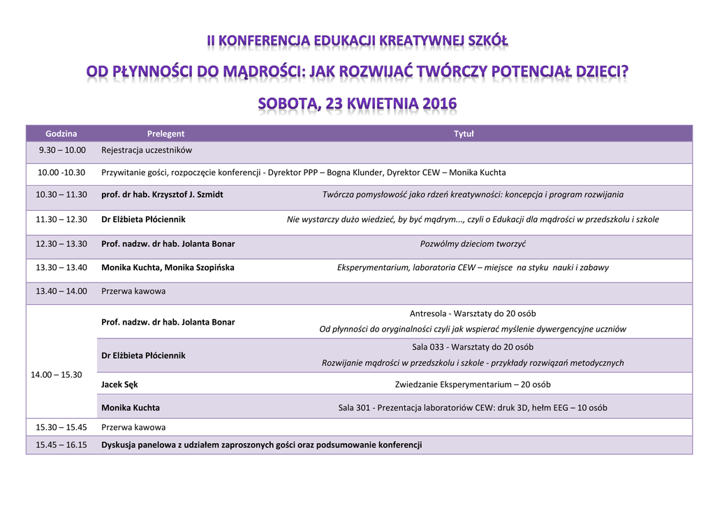 Godzina Prelegent Tytuł 9.30 – 10.00 Rejestracja uczestników 10.00 -10.30 Przywitanie gości, rozpoczęcie konferencji - Dyrektor PPP – Bogna Klunder, Dyrektor CEW – Monika Kuchta 10.30 – 11.30 prof. dr hab. Krzysztof J. Szmidt 11.30 – 12.30 Dr Elżbieta Płóciennik 12.30 – 13.30 Prof. nadzw. dr hab. Jolanta Bonar Pozwólmy dzieciom tworzyć 13.30 – 13.40 Monika Kuchta, Monika Szopińska Eksperymentarium, laboratoria CEW – miejsce na styku nauki i zabawy 13.40 – 14.00 Przerwa kawowa Prof. nadzw. dr hab. Jolanta Bonar Dr Elżbieta Płóciennik Twórcza pomysłowość jako rdzeń kreatywności: koncepcja i program rozwijania Nie wystarczy dużo wiedzieć, by być mądrym..., czyli o Edukacji dla mądrości w przedszkolu i szkole Antresola - Warsztaty do 20 osób Od płynności do oryginalności czyli jak wspierać myślenie dywergencyjne uczniów Sala 033 - Warsztaty do 20 osób Rozwijanie mądrości w przedszkolu i szkole - przykłady rozwiązań metodycznych 14.00 – 15.30 Jacek Sęk Monika Kuchta Zwiedzanie Eksperymentarium – 20 osób Sala 301 - Prezentacja laboratoriów CEW: druk 3D, hełm EEG – 10 osób 15.30 – 15.45 Przerwa kawowa 15.45 – 16.15 Dyskusja panelowa z udziałem zaproszonych gości oraz podsumowanie konferencji