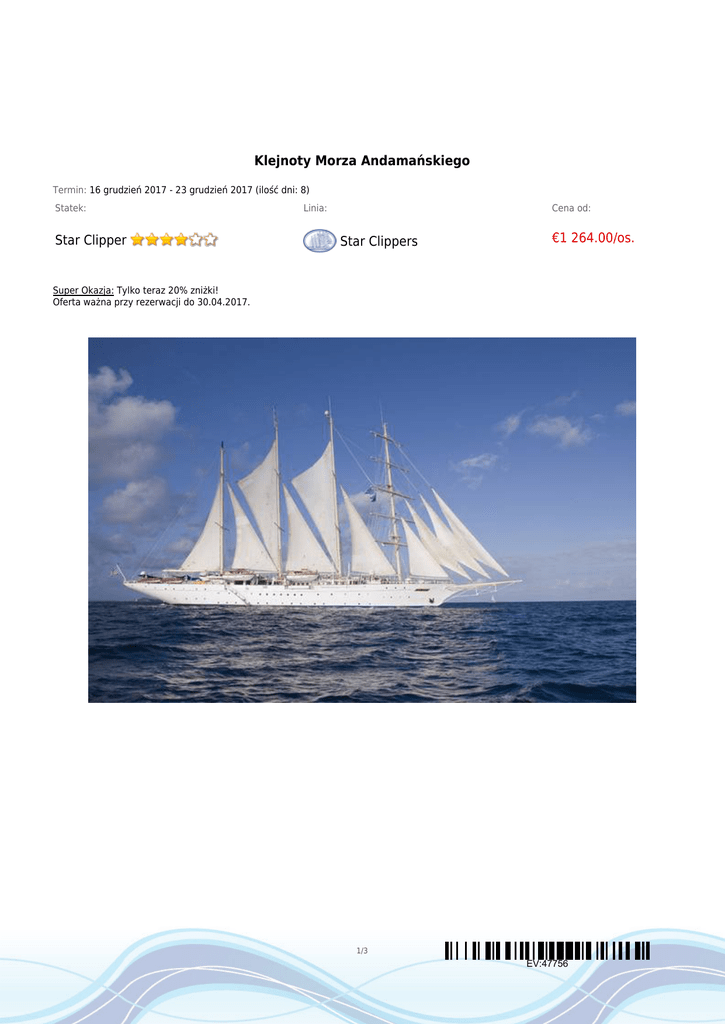 Klejnoty Morza Andamańskiego Termin: 16 grudzień 2017 - 23 grudzień 2017 (ilość dni: 8) Statek: Star Clipper Linia: Cena od: Star Clippers €1 264.00/os. Super Okazja: Tylko teraz 20% zniżki! Oferta ważna przy rezerwacji do 30.04.2017. 1/3 EV:47756 TRASA REJSU dzień 1 dzień 2 dzień 3 dzień 4 dzień 4 dzień 5 dzień 6 dzień 7 dzień 7 dzień 8 Data Port Wpłynięcie Wypłynięcie sobota 16.12.2017 Phuket --:-- --:-- --:-- --:-- --:-- --:-- --:-- --:-- --:-- --:-- --:-- --:-- --:-- --:-- --:-- --:-- --:-- --:-- --:-- --:-- Tajlandia niedziela 17.12.2017 Mu Ko Surin National Park poniedziałek 18.12.2017 Similan Island wtorek 19.12.2017 Hin Daeng wtorek 19.12.2017 Wyspy Ko Rok Nok/Ko Muk środa 20.12.2017 Langkawi czwartek 21.12.2017 Wyspa Ko Kradan piątek 22.12.2017 Phang Nga piątek 22.12.2017 Ko Hong sobota 23.12.2017 Legenda Tajlandia Tajlandia Tajlandia Tajlandia Malezja Tajlandia Tajlandia Tajlandia Phuket Tajlandia CENNIK Cena katalogowa Cena promocyjna Kabina wewnętrzna od €1 580.00 od €1 264.00 Kabina zewnętrzna z oknem od €1 775.00 od €1 420.00 Suite (apartament) €3 580.00 od €2 864.00 Kabina jednoosobowa €2 055.00 2/3 EV:47756 3 osoba dorosła w kabinie €585.00 dziecko do 18 lat jako 3 i 4 osoba w kabinie €585.00 Opłaty portowe €205.00 Uwaga! Ceny za osobę w kabinie dwuosobowej. Cena zawiera: zakwaterowanie w kabinie wybranej kategorii; wyżywienie - 3 główne posiłki, przekąski między posiłkami, bufet lub przekąski o północy; napoje serwowane do śniadania i w bufetach samoobsługowych; serwis bagażowy podczas wejścia i zejścia ze statku; serwis kabinowy; korzystanie ze wszystkich urządzeń sportowo - rekreacyjnych znajdujących się na pokładzie statku (basen, jacuzzi, sala fitness, itp.); udział we wszystkich imprezach organizowanych na statku (przedstawienia w teatrze, koncerty, programy animacyjne itp.). Cena nie zawiera: kosztów dojazdu do portu; ewentualnych noclegów w hotelu przed/po rejsie i transferów; wycieczek fakultatywnych w trakcie rejsu; korzystania z barów, mini baru w kabinie oraz napojów zamawianych w restauracji; korzystania z punktów usługowych (fryzjer, pralnia, fotograf, salon piękności i odnowy biologicznej, internet) i wydatków osobistych; napiwków dla obsługi na statku (kwota uzależniona od długości rejsu); ubezpieczenia KL, NNW i bagaż, kosztów wiz (tam gdzie wymagane). 3/3 EV:47756