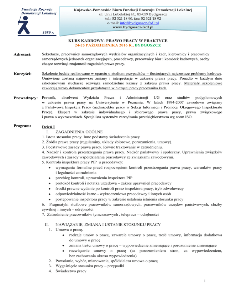 Kujawsko-Pomorskie Biuro Fundacji Rozwoju Demokracji Lokalnej ul. Unii Lubelskiej 4C, 85-059 Bydgoszcz tel.: 52 321 18 90, fax: 52 321 18 92 e-mail: [email protected] www.bydgoszcz-frdl.pl KURS KADROWY- PRAWO PRACY W PRAKTYCE 24-25 PAŹDZIERNIKA 2016 R., BYDGOSZCZ Adresaci: Sekretarze, pracownicy samorządowych wydziałów organizacyjnych i kadr, kierownicy i pracownicy samorządowych jednostek organizacyjnych, pracodawcy, pracownicy biur i komórek kadrowych, osoby chcące rozwinąć znajomość zagadnień prawa pracy. Korzyści: Szkolenie będzie realizowane w oparciu o studium przypadków – ilustrujących najczęstsze problemy kadrowe. Omówione zostaną najnowsze zmiany i interpretacje w zakresie prawa pracy. Ponadto w każdym dniu szkoleniowym słuchacze rozwiążą samodzielnie kazusy z zakresu prawa pracy. Materiały szkoleniowe zawierają wzory dokumentów przydatnych w bieżącej pracy pracownika kadr. absolwent Wydziału Prawa i Administracji UG oraz studiów podyplomowych w zakresie prawa pracy na Uniwersytecie w Poznaniu. W latach 1994-2007 zawodowo związany z Państwową Inspekcją Pracy (nadinspektor pracy w Sekcji Informacji i Promocji Okręgowego Inspektoratu Pracy). Ekspert w zakresie indywidualnego i zbiorowego prawa pracy, prawa związkowego i prawa o wykroczeniach. Specjalista systemów zarządzania przedsiębiorstwem wg norm ISO. Prowadzący: Prawnik, Program: Dzień I I. ZAGADNIENIA OGÓLNE 1. Istota stosunku pracy. Inne podstawy świadczenia pracy 2. Źródła prawa pracy (regulaminy, układy zbiorowe, porozumienia, umowy). 3. Podstawowe zasady prawa pracy. Równe traktowanie w zatrudnieniu. 4. Nadzór i kontrola przestrzegania prawa pracy. Nadzór państwowy i społeczny. Uprawnienia związków zawodowych i zasady współdziałania pracodawcy ze związkami zawodowymi. 5. Kontrola inspektora pracy PIP u pracodawcy: wymagania formalne przed rozpoczęciem kontroli przestrzegania prawa pracy, warunków pracy i legalności zatrudnienia przebieg kontroli, uprawnienia inspektora PIP protokół kontroli i notatka urzędowa – zakres uprawnień pracodawcy środki prawne wydanie po kontroli przez inspektora pracy, tryb odwoławczy odpowiedzialność karno - wykroczeniowa pracodawcy i innych osób postępowanie inspektora pracy w zakresie ustalenia istnienia stosunku pracy 6. Pragmatyki służbowe pracowników samorządowych, pracowników urzędów państwowych, służby cywilnej i innych – odrębności 7. Zatrudnienie pracowników tymczasowych , telepraca – odrębności II. NAWIĄZANIE, ZMIANA I USTANIE STOSUNKU PRACY 1. Umowa o pracę. rodzaje umów o pracę, zawarcie umowy o pracę, treść umowy, informacja dodatkowa do umowy o pracę zmiana treści umowy o pracę – wypowiedzenie zmieniające i porozumienie zmieniające rozwiązanie umowy o pracę (za porozumieniem stron, za wypowiedzeniem, bez zachowania okresu wypowiedzenia) 2. Powołanie, wybór, mianowanie, spółdzielcza umowa o pracę 3. Wygaśnięcie stosunku pracy – przypadki 4. Świadectwo pracy 1 Kujawsko-Pomorskie Biuro Fundacji Rozwoju Demokracji Lokalnej ul. Unii Lubelskiej 4C, 85-059 Bydgoszcz tel.: 52 321 18 90, fax: 52 321 18 92 e-mail: [email protected] www.bydgoszcz-frdl.pl III. 1. 2. 3. 4. 5. 6. IV. 1. 2. 3. 4. 5. V. 1. 2. 3. VI. OBOWIĄZKI PRACOWNIKÓW I PRACODAWCY Podstawowe obowiązki wynikające z Kodeksu pracy Obowiązki pracodawcy i pracownika w zakresie bhp Zakaz konkurencji – treść i zakres umowy Podnoszenie kwalifikacji zawodowych pracowników Zakres regulaminu pracy Odpowiedzialność porządkowa i dyscyplinarna pracowników WYNAGRODZENIE I INNE ŚWIADCZENIA ZE STOSUNKU PRACY Ustalanie składników wynagrodzenia i innych świadczeń związanych ze stosunkiem pracy (przepisy powszechnie obowiązujące, regulaminy wynagradzania, układy zbiorowe pracy, inne akty kształtujące wynagrodzenie pracownika) Ochrona wynagrodzenia za pracę Świadczenia z tytułu czasowej niezdolności do pracy Odprawy (emerytalno-rentowa, pośmiertna, w związku z rozwiązaniem umowy z przyczyn niedotyczących pracownika) Należności z tytułu podróży krajowych i zagranicznych ODPOWIEDZIALNOŚĆ MATERIALNA PRACOWNIKÓW Odpowiedzialność pracownika za szkodę wyrządzoną pracodawcy Odpowiedzialność pracownika za mienie powierzone Dochodzenie roszczeń przez pracodawcę z tytułu szkody wyrządzonej przez pracownika AKTA OSOBOWE I DOKUMENTACJA PRACOWNICZA 1. Zawartość akt osobowych, zasady gromadzenia i przechowywania 2. Ewidencja czasu pracy, listy (karty wynagrodzeń), kartoteki bhp 3. Inne zbiory dokumentów związanych ze stosunkiem pracy Dzień II VII. ROZLICZANIE CZASU PRACY 1. Pojęcie czasu pracy: normy , rozkłady , systemy czasu pracy, doba i tydzień, okres rozliczeniowy, dyżur, praca zmianowa 2. Okresy wliczane i niewliczane do czasu pracy 3. Podstawowy i równoważny system czasu pracy 4. Kształtowanie harmonogramów czasu pracy i prawidłowe jego rozliczanie. Ewidencja czasu pracy. 5. Praca w nocy oraz w niedziele i święta 6. Praca w godzinach nadliczbowych; odpoczynek dobowy i tygodniowy 7. Możliwości indywidualnego kształtowania czasu pracy 8. Rozliczanie czasu pracy niektórych grup zawodowych (kierowcy, służba zdrowia, niepełnosprawni, pracownicy samorządowi, nauczyciele itp.) 9. Zadaniowy system czasu pracy 10. Czas pracy kadry kierowniczej 11. Czas pracy w podróży służbowej 12. Skutki naruszania przepisów o czasie pracy VIII. URLOPY PRACOWNICZE I ZWOLNIENIA Z PRACY 2 Kujawsko-Pomorskie Biuro Fundacji Rozwoju Demokracji Lokalnej ul. Unii Lubelskiej 4C, 85-059 Bydgoszcz tel.: 52 321 18 90, fax: 52 321 18 92 e-mail: [email protected] www.bydgoszcz-frdl.pl 1. Urlopy wypoczynkowe Pojęcie urlopu wypoczynkowego Nabycie prawa do urlopu wypoczynkowego - prawo do pierwszego i kolejnych urlopów Wymiar urlopu wypoczynkowego – okresy uwzględniane przy ustalaniu wymiaru Urlop proporcjonalny (w stosunku do wymiaru etatu i okresu zatrudnienia) Zasady wykorzystywania url