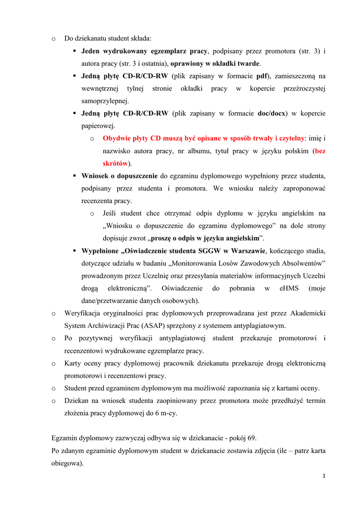 o Do dziekanatu student składa:  Jeden wydrukowany egzemplarz pracy, podpisany przez promotora (str. 3) i autora pracy (str. 3 i ostatnia), oprawiony w okładki twarde.  Jedną płytę CD-R/CD-RW (plik zapisany w formacie pdf), zamieszczoną na wewnętrznej tylnej stronie okładki pracy w kopercie przeźroczystej samoprzylepnej.  Jedną płytę CD-R/CD-RW (plik zapisany w formacie doc/docx) w kopercie papierowej. o Obydwie płyty CD muszą być opisane w sposób trwały i czytelny: imię i nazwisko autora pracy, nr albumu, tytuł pracy w języku polskim (bez skrótów).  Wniosek o dopuszczenie do egzaminu dyplomowego wypełniony przez studenta, podpisany przez studenta i promotora. We wniosku należy zaproponować recenzenta pracy. o Jeśli student chce otrzymać odpis dyplomu w języku angielskim na „Wniosku o dopuszczenie do egzaminu dyplomowego” na dole strony dopisuje zwrot „proszę o odpis w języku angielskim”.  Wypełnione „Oświadczenie studenta SGGW w Warszawie, kończącego studia, dotyczące udziału w badaniu „Monitorowania Losów Zawodowych Absolwentów” prowadzonym przez Uczelnię oraz przesyłania materiałów informacyjnych Uczelni drogą elektroniczną”. Oświadczenie do pobrania w eHMS (moje dane/przetwarzanie danych osobowych). o Weryfikacja oryginalności prac dyplomowych przeprowadzana jest przez Akademicki System Archiwizacji Prac (ASAP) sprzężony z systemem antyplagiatowym. o Po pozytywnej weryfikacji antyplagiatowej student przekazuje promotorowi i recenzentowi wydrukowane egzemplarze pracy. o Karty oceny pracy dyplomowej pracownik dziekanatu przekazuje drogą elektroniczną promotorowi i recenzentowi pracy. o Student przed egzaminem dyplomowym ma możliwość zapoznania się z kartami oceny. o Dziekan na wniosek studenta zaopiniowany przez promotora może przedłużyć termin złożenia pracy dyplomowej do 6 m-cy. Egzamin dyplomowy zazwyczaj odbywa się w dziekanacie - pokój 69. Po zdanym egzaminie dyplomowym student w dziekanacie zostawia zdjęcia (ile – patrz karta obiegowa). 1