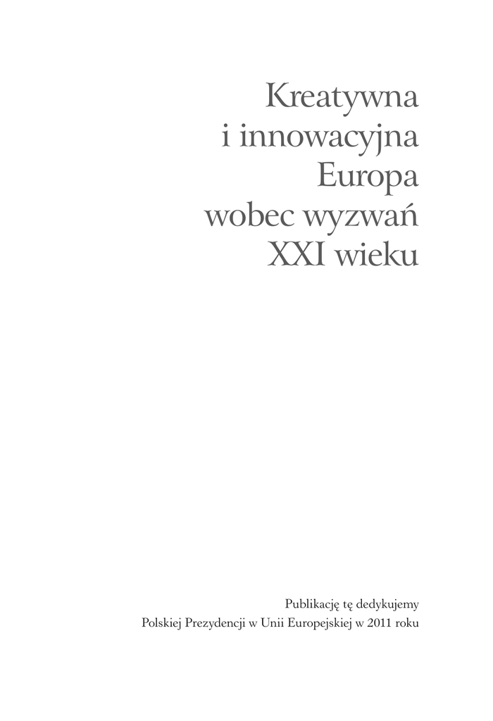 Kreatywna i innowacyjna Europa wobec wyzwań XXI wieku Publikację tę dedykujemy Polskiej Prezydencji w Unii Europejskiej w 2011 roku Kreatywna i innowacyjna Europa wobec wyzwań XXI wieku Redakcja: Antoni Kukliński Krzysztof Pawłowski Jacek Woźniak Kraków 2009 Publikacja stanowi pokłosie ogólnopolskiej konferencji „Kreatywna i innowacyjna Europa wobec wyzwań XXI wieku”, która odbyła się w Krakowie w dniach 5-6 czerwca 2008 r. Biblioteka Małopolskiego Obserwatorium Polityki Rozwoju, Tom I Redakcja: Antoni Kukliński, Krzysztof Pawłowski, Jacek Woźniak Recenzja: Prof. dr hab. Janusz Zaleski Publikacja współfinansowana ze środków Europejskiego Funduszu Społecznego w ramach Małopolskiego Obserwatorium Polityki Rozwoju oraz ze środków Europejskiego Funduszu Rozwoju Regionalnego w ramach Małopolskiego Regionalnego Programu Operacyjnego na lata 2007-2013. Wydawca: Urząd Marszałkowski Województwa Małopolskiego Departament Polityki Regionalnej ul. Basztowa 22, 31-156 Kraków Adres do korespondencji: ul. Racławicka 56, 30-017 Kraków Tel. (+48) 12 299 07 00, fax. (+48) 12 299 07 26 www.fundusze.malopolska.pl Projekt okładki i skład: www.olisons.pl Redakcja techniczna: Agnieszka Misiaszek Druk: DjaF Przy publikowaniu danych z książki „Kreatywna i innowacyjna Europa wobec wyzwań XXI wieku” prosimy o podawanie źródła. ISBN: 978-83-61355-31-1 Egzemplarz bezpłatny red. Antoni Kukliński, Krzysztof Pawłowski, Jacek Woźniak Kraków 2009 Marek Nawara Przedmowa ......................................................................... 7 Od Redakcji ............................................................................................... 11 Słowa wstępne: Jerzy Buzek ................................................................................................. 13 Elżbieta Bieńkowska .................................................................................. 17 Jan Olbrycht Udział Polski w rozwoju kreatywnej Europy – nie ma alternatywy ......................... 19 Roman Ciepiela ......................................................................................... 23 Michał Boni Wprowadzenie: Polityka rozwoju a perspektywa 2030 ............................................................................... 25 Roman Galar Kreatywna i innowacyjna Europa wobec wyzwań XXI wieku. Scenariusz optymistyczny .................................. 37 Witold M. Orłowski Czy kreatywna i innowacyjna Europa może być jednym z centrów rozwoju świata w XXI wieku? Scenariusz pesymistyczny ................................ 55 Andrzej P. Wierzbicki Warunki kreatywności i innowacyjności dla Europy i Polski ................................................... 63 Wojciech Lamentowicz Kreatywność i innowacyjność w unijnej Europie i Polsce .................................................................... 73 Edward Nęcka System, klimat i osoba .................................................... 97 Jacek Szlachta Kreatywność i innowacyjność polityki spójności Unii Europejskiej w kolejnym okresie programowania po roku 2013 ............................................................. 103 Antoni Kukliński Czy katastrofa Cywilizacji Zachodniej jest nieuniknionym werdyktem XXI wieku? ................ 111 Krzysztof Rybiński Czy UE mogła być demiurgiem kreatywnej i innowacyjnej Europy? .................................................... 119 Krzysztof Szczerski Władza umożliwiająca jako warunek kreatywnej i innowacyjnej Unii Europejskiej ............ 129 5 Spis treści Marek Pieńkowski Kreatywność i innowacyjność Europy dziełem człowieka .................................................................. 137 Piotr Żuber Unia Europejska w okresie zmian. Myślenie strategiczne. Konkurencyjność a nowa polityka spójności terytorialnej ............................................ 153 Tomasz Grzegorz Grosse Odnowiona strategia lizbońska a polityka spójności: ocena rezultatów współpracy i perspektywy rozwoju ......................................................................... 163 Krzysztof Pawłowski Czy Polska weźmie udział w rozwoju kreatywnej i innowacyjnej Europy? Scenariusz pesymistyczny .................................................................. 199 Elżbieta Hibner Czy Polska weźmie udział w rozwoju kreatywnej i innowacyjnej Europy? Z perspektywy środka Polski .............................................................. 213 Piotr Legutko Czy Polska weźmie udział w rozwoju kreatywnej i innowacyjnej Europy? .................................. 219 Jacek Woźniak Czy Polska weźmie udział w rozwoju kreatywnej i innowacyjnej Europy? Uwarunkowania polityki rozwoju w Polsce .... 225 Tomasz Parteka Czy Polska weźmie udział w rozwoju kreatywnej i innowacyjnej Europy? .................................. 237 Aleksander Noworól Czy Małopolska może zostać kreatywnym i innowacyjnym regionem? Scenariusz pesymistyczny ................................................................... 243 Bolesław Domański Czy Małopolska może zostać kreatywnym i innowacyjnym regionem? Głos dyskusyjny ................................................................................... 265 Krzysztof Krzysztofiak Czy Małopolska stanie się regionem wiedzy i innowacji? ............................................ 273 Michał Gabriel Woźniak Modernizacja refleksyjna kapitału ludzkiego wyzwaniem kreatywnej i innowacyjnej gospodarki ............................................... 283 Antoni Kukliński Memoriał Polonia quo vadis? .................................... 299 Antoni Kukliński Projekt manifestu konferencji krakowskiej w sprawie Konfederacji Wspólnoty Atlantyckiej jako najważniejszego wyzwania cywilizacji zachodniej XXI wieku ..... 311 Sprawozdanie z konferencji ................................................................... 313 Wykaz autorów ...........................................................................