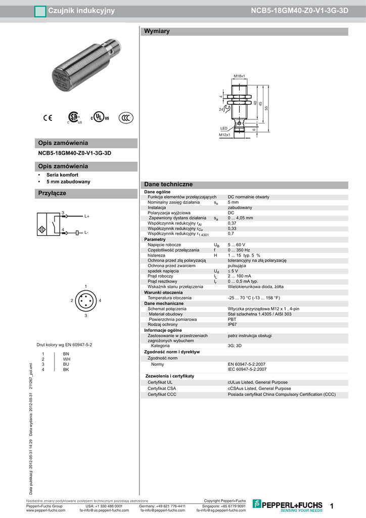 Czujnik indukcyjny NCB5-18GM40-Z0-V1-3G-3D Wymiary 55 40 45 4 M18x1 24 S 6 LED M12x1 Opis zamówienia NCB5-18GM40-Z0-V1-3G-3D Opis zamówienia • • Seria komfort 5 mm zabudowany Dane techniczne Przyłącze 3 L+ 4 L- 1 4 2 3 1 2 3 4 BN WH BU BK Zezwolenia i certyfikaty Certyfikat UL Certyfikat CSA Certyfikat CCC DC normalnie otwarty 5 mm zabudowany DC 0 ... 4,05 mm 0,37 0,33 0,7 5 ... 60 V 0 ... 350 Hz 1 ... 15 typ. 5 % tolerancyjny na złą polaryzację pulsująca ≤5V 2 ... 100 mA 0 ... 0,5 mA typ. Wielokierunkowa dioda, żółta -25 ... 70 °C (-13 ... 158 °F) Wtyczka przyrządowa M12 x 1 , 4-pin Stal szlachetna 1.4305 / AISI 303 PBT IP67 patrz instrukcja obsługi 3G; 3D EN 60947-5-2:2007 IEC 60947-5-2:2007 cULus Listed, General Purpose cCSAus Listed, General Purpose Posiada certyfikat China Compulsory Certification (CCC) Data publikacji: 2012-05-31 14:29 Data wydania: 2012-05-31 211267_pol.xml Drut kolory wg EN 60947-5-2 Dane ogólne Funkcja elementów przełączających Nominalny zasięg działania sn Instalacja Polaryzacja wyjżciowa Zapewniony dystans działania sa Współczynnik redukcyjny rAl Współczynnik redukcyjny rCu Współczynnik redukcyjny r1.4301 Parametry Napięcie robocze UB Częstotliwość przełączania f histereza H Ochrona przed złą polaryzacją Ochrona przed zwarciem spadek napięcia Ud Prąd roboczy IL Prąd resztkowy Ir Wskażnik stanu przełączenia Warunki otoczenia Temperatura otoczenia Dane mechaniczne Schemat połączenia Materiał obudowy Powierzchnia pomiarowa Rodzaj ochrony Informacje ogólne Zastosowanie w przestrzeniach zagrożonych wybuchem Kategoria Zgodność norm i dyrektyw Zgodność norm Normy Niezbêdne zmiany podyktowane postêpem technicznym pozostaj¹ zastrze¿one Pepperl+Fuchs Group USA: +1 330 486 0001 Germany: +49 621 776-4411 www.pepperl-fuchs.com [email protected] [email protected] Copyright Pepperl+Fuchs Singapore: +65 6779 9091 [email protected] 1 Czujnik indukcyjny ATEX 3G (nA) Instrukcja obsługi Kategoria urządzenia 3G (nA) zgodność z wytycznymi Zgodność norm NCB5-18GM40-Z0-V1-3G-3D Urządzenia elektryczne dla przestrzeni zagrożonych wybuchem do użytku w przestrzeniach zagrożonych wybuchem gazu, oparów i mgły. 94/9/EG EN 60079-0:2006, EN 60079-15:2005 Zabezpieczenie przed zapłonem typu "n" ograniczenie przez następujące warunki Oznakowanie CE Znak Ex Informacje ogólne Instalacja, uruchomienie Konserwacja, serwis ¬ II 3G Ex nA IIC T6 X Znak Ex znajduje się na załączonej etykietce. Urządzenie należy używać zgodnie z danymi katalogowymi oraz danymi zawartymi w tej instrukcji obsługi. Podane dane katalogowe ograniczone są przez tą instrukcję obsługi! Należy przestrzegać warunków szczególnych! Należy przestrzegać przepisów prawnych i/lub rozporządzeń i norm regulujących użycie lub też użycia zgodnego z przeznaczeniem. Załączoną etykietkę należy przykleić bezpośrednio w pobliżu czujnika! Powierzchnia naklejenia musi być czysta, odtłuszczona i gładka! Przyklejona etykietka musi być czytelna i trwała, również pod wpływem ewentualnej korozji chemicznej! Nie wolno dokonywać żadnych zmian przy urządzeniach przeznaczonych do pracy w przestrzeniach zagrożonych wybuchem. Wykonywanie napraw tych urządzeń nie jest możliwe. Szczególne warunki Maksymalny prąd obciążenia IL Data publikacji: 2012-05-31 14:29 Data wydania: 2012-05-31 211267_pol.xml Maksymalne dopuszczalne wartości prądu obciążenia są ograniczone do wartości podanych w następującej liście. Wyższe wartości prądu obciążenia i zwarcia nie są dopuszczalne. Maksymalne napięcie robocze UBmax Maksymalne dopuszczalne wartości napięcia roboczego UBmax ograniczone są do wartości podanych w następującej liście, tolerancja nie jest dopuszczalna. w zależności od prądu obciążenia IL i max. napięcia roboczego UBmax. Maksymalna dopuszczalna temperaDane zawarte są w następującej liście. tura otoczenia TUmax 51 °C (123,8 °F) gdy UBmax=60 V, IL=100 mA gdy UBmax=60 V, IL=50 mA 57 °C (134,6 °F) gdy UBmax=60 V, IL=25 mA 60 °C (140 °F) Łącznik wtykowy Nie odłączać łącznika wtykowego znajdującego się pod napięciem. Czujnik zbliżeniowy jest oznakowany w następujący sposób: "NIE ODŁĄCZAĆ, GDY CZUJNIK ZNAJDUJE SIĘ POD NAPIĘCIEM!" Po odłączeniu łącznika wtykowego, należy unikać zanieczyszczenia wewnętrznych części (tzn. niedostępnych, gdy łącznik jest załączony). Ochrona przed uszkodzeniami mecha- Czujnik nie może być narażony na ŻADNE mechaniczne uszkodzenia. nicznymi Ochrona przed żwiatłem UV Czujnik i przewód instalacyjny należy chronić przed szkodliwym promieniowaniem UV. Możliwe jest to przez montaż wewnątrz pomieszczeń. Wyładowanie elektrostatyczne Należy unikać wyładowań elektrostatycznych metalowych elementów obudowy. Uniknięcie niebezpiecznego wywyładowania elektrostatycznego metalowych komponentów obudowy możliwe jest przez ich uziemienie. 2 Niezbêdne zmiany podyktowane postêpem technicznym pozostaj¹ zastrze¿one Pepperl+Fuchs Group USA: +1 330 486 0001 Germany: +49 621 776-4411 www.pepperl-fuchs.com [email protected] [email protected] Copyright Pepperl+Fuchs Singapore: +65 6779 9091 [email protected] Czujnik indukcyjny ATEX 3D (tD) Instrukcja obsługi Kategoria urządzenia 3D zgodność z wytycznymi Zgodność norm NCB5-18GM40-Z0-V1-3G-3D Urządzenia elektryczne dla przestrzeni zagrożonych wybuchem do użytku w przestrzeniach zagrożonych wybuchem z obecnością palnego pyłu 94/9/EG EN 61241-0:2006, EN 61241-1:2004 ochrona przez obudowÄ™ âÄžtDâÄ″ ograniczenie przez następujące warunki Oznakowanie CE Znak Ex Informacje ogólne Instalacja, uruchomienie Konserwacja, serwis Szczególne warunki Maksymalny prąd obciążenia IL Maksymalne napięcie robocze UBmax Maksymalna dopuszczalna temperatura otoczenia TUmax gdy UBmax=60 V, IL=100 mA gdy UBmax=60 V, IL=50 mA gdy UBmax=60 V, IL=25 mA Łącznik wtykowy ¬ II 3D Ex tD A22 IP