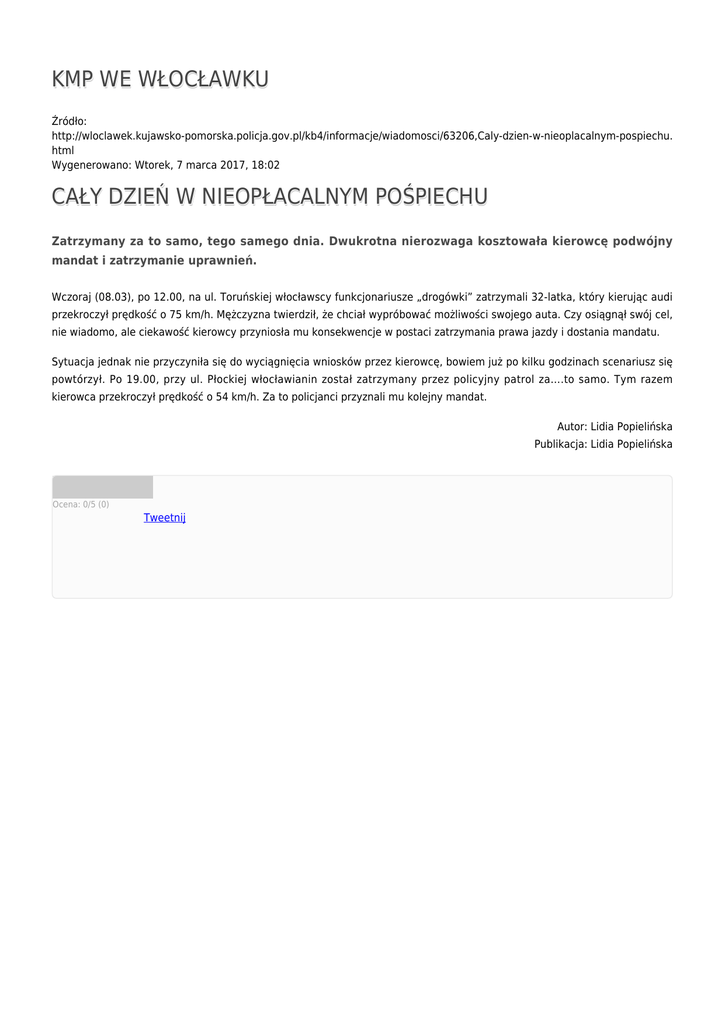 KMP WE WŁOCŁAWKU Źródło: http://wloclawek.kujawsko-pomorska.policja.gov.pl/kb4/informacje/wiadomosci/63206,Caly-dzien-w-nieoplacalnym-pospiechu. html Wygenerowano: Wtorek, 7 marca 2017, 18:02 CAŁY DZIEŃ W NIEOPŁACALNYM POŚPIECHU Zatrzymany za to samo, tego samego dnia. Dwukrotna nierozwaga kosztowała kierowcę podwójny mandat i zatrzymanie uprawnień. Wczoraj (08.03), po 12.00, na ul. Toruńskiej włocławscy funkcjonariusze „drogówki” zatrzymali 32-latka, który kierując audi przekroczył prędkość o 75 km/h. Mężczyzna twierdził, że chciał wypróbować możliwości swojego auta. Czy osiągnął swój cel, nie wiadomo, ale ciekawość kierowcy przyniosła mu konsekwencje w postaci zatrzymania prawa jazdy i dostania mandatu. Sytuacja jednak nie przyczyniła się do wyciągnięcia wniosków przez kierowcę, bowiem już po kilku godzinach scenariusz się powtórzył. Po 19.00, przy ul. Płockiej włocławianin został zatrzymany przez policyjny patrol za….to samo. Tym razem kierowca przekroczył prędkość o 54 km/h. Za to policjanci przyznali mu kolejny mandat. Autor: Lidia Popielińska Publikacja: Lidia Popielińska Ocena: 0/5 (0) Tweetnij