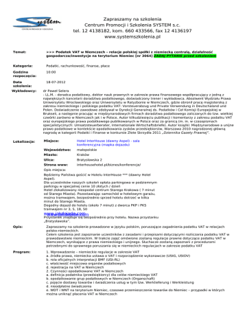 Zapraszamy na szkolenia Centrum Promocji i Szkolenia SYSTEM s.c. tel. 12 4138182, kom. 660 433566, fax 12 4136197 www.systemszkolenia.pl Temat: >>> Podatek VAT w Niemczech – relacje polskiej spółki z niemiecką centralą, działalność gospodarcza/inwestycje na terytorium Niemiec [nr 3064] ZADAJ PYTANIE przed szkoleniem Kategoria: Podatki, rachunkowość, finanse, płace Godzina rozpoczęcia: 10:00 Data szkolenia: 18-07-2012 Wykładowcy: Lokalizacja: dr drPaweł PawełSelera Selera - -LL.M. LL.M.- -doradca doradcapodatkowy, podatkowy,doktor doktornauk naukprawnych prawnychwwzakresie zakresieprawa prawafinansowego finansowegowspółpracujący współpracującyzzjedną jednązz największych największychkancelarii kancelariidoradztwa doradztwapodatkowego, podatkowego,doświadczony doświadczonytrener treneri iwykładowca. wykładowca.Absolwent AbsolwentWydziału WydziałuPrawa Prawa Uniwersytetu UniwersytetuWrocławskiego Wrocławskiegooraz orazUniwersytetu UniwersytetuwwRatyzbonie RatyzboniewwNiemczech, Niemczech,gdzie gdzieobronił obroniłpracę pracęmagisterską magisterskązz zakresu zakresuniemieckiego niemieckiegoi ipolskiego polskiegopodatku podatkuVAT: VAT:Vorsteuerabzug Vorsteuerabzugund undPrivate PrivateVerwendung VerwendungininDeutschaland Deutschalandund und Polen. Polen.Doświadczenie Doświadczeniezawodowe zawodowezdobywał zdobywałwwDyrekcji DyrekcjiGeneralnej Generalnejds. ds.Podatków Podatkówi iCeł CełKomisji KomisjiEuropejskiej Europejskiejww Brukseli, Brukseli,aanastępnie następniepracując pracującwwmiędzynarodowych międzynarodowychfirmach firmachdoradztwa doradztwapodatkowego podatkowegozaliczanych zaliczanychdo dotzw. tzw.wielkiej wielkiej czwórki czwórkizarówno zarównowwNiemczech Niemczechjak jaki iwwPolsce. Polsce.Autor Autorkilkudziesięciu kilkudziesięciupublikacji publikacjii ikomentarzy komentarzyzzzakresu zakresupodatku podatkuVAT VAT oraz orazeuropejskiego europejskiegoprawa prawapodatkowego podatkowegopublikowanych publikowanychwwPolsce Polsceoraz orazza zagranicą granicą(m. (m.in. in.wwczasopismach czasopismach specjalistycznych: specjalistycznych:Umsatzsteuerberater, Umsatzsteuerberater,Internationale InternationaleWirtschaftsbriefe). Wirtschaftsbriefe).Autor Autorksiążki: książki:Międzynarodowe Międzynarodoweaaunijne unijne prawo prawopodatkowe podatkowewwkontekście kontekścieopodatkowania opodatkowaniazysków zyskówprzedsiębiorstw, przedsiębiorstw,Warszawa Warszawa2010 2010nagrodzonej nagrodzonejgłówną główną nagrodą nagrodąwwkategorii kategoriiPodatki Podatkii iFinanse Finansewwkonkursie konkursieZłote ZłoteSkrzydła Skrzydła2011 2011„Dziennika „DziennikaGazety GazetyPrawnej”. Prawnej”. Miejsce: Miejsce: Hotel InterHouse (dawny Aspel) - sala Hotel InterHouse (dawny Aspel) - sala konferencyjna (mapka dojazdu) konferencyjna (mapka dojazdu) Województwo: Województwo: małopolskie małopolskie Miasto: Kraków Miasto: Kraków Ulica: Bratysławska 22 Ulica: Bratysławska Strona www: interhousehotel.pl/biznes/konferencje/ Strona www: interhousehotel.pl/biznes/konferencje/ Opis miejsca: Opis miejsca: Będziemy Państwa gościć ww Hotelu InterHouse *** (dawny Hotel Będziemy Państwa gościć Hotelu InterHouse *** (dawny Hotel Aspel). Aspel). Dla uczestników naszych szkoleń opłata parkingowa ww podziemnym Dla uczestników naszych szkoleń opłata parkingowa podziemnym parkingu w specjalnej cenie 10 złotych / dzień parkingu w specjalnej cenie 10 złotych / dzień Hotel zlokalizowany nieopodal centrum Starego Krakowa ( 7( 7 minut Hotel zlokalizowany nieopodal centrum Starego Krakowa minut odod Starego Miasta). Pozostawiając samochód w hotelowym garażu, Starego Miasta). Pozostawiając samochód w hotelowym garażu, można tramwajem, bezpośrednio sprzed hotelu dotrzeć ww kilka można tramwajem, bezpośrednio sprzed hotelu dotrzeć kilka minut do Starego Miasta. minut do Starego Miasta. Dogodny dojazd dodo hotelu (około 77 minut) z dworca PKP i PKS Dogodny dojazd hotelu (około minut) z dworca PKP i PKS tramwajem nr 3, 5, 18, 50 tramwajem nr 3, 5, 18, 50 www.jakdojade.com www.jakdojade.com Przystanek znajduje sięsię bezpośrednio przy hotelu. Nazwa przystanku Przystanek znajduje bezpośrednio przy hotelu. Nazwa przystanku „Bratysławska”. „Bratysławska”. Opis: Zapraszamy na szkolenie prowadzone w języku polskim, poruszające zagadnienia podatku VAT w relacjach polsko-niemieckich. Celem szkolenia jest zapoznanie uczestników z zasadami i przepisami dotyczącymi rozliczania podatku VAT w prawodawstwie niemieckim. W trakcie zajęć omówione zostaną regulacje prawne dotyczące podatku VAT w Niemczech, wynikające z prawa niemieckiego i unijnego. Słuchacze zostaną zapoznani z procedurami potrzebnymi do sprawnego poruszania się w niemieckich regulacjach w zakresie podatku VAT Program: 1. Wprowadzenie – niemieckie regulacje w zakresie VAT a. źródła prawa, niemiecka ustawa o VAT i rozporządzenie wykonawcze (UStG, UStDV) b. rola oficjalnych interpretacji BMF (USt-RL) c. właściwość miejscowa organów podatkowych d. rejestracja na VAT w Niemczech 2. Czynności opodatkowane VAT w Niemczech a. definicja podatnika (przedsiębiorcy) dla celów niemieckiego VAT b. opodatkowanie grup podatkowych w Niemczech (Organschaft) c. pojęcie dostawy towarów i świadczenia usług w tym tzw. Werklieferung i Werkleistung d. nieodpłatne świadczenia e. WDT i WNT na terytorium Niemiec, czasowe przemieszczenie towarów do Niemiec – przypadki w których można uniknąć płacenia VAT w Niemczech f. dostawy w oparciu o niemiecki magazyn konsygnacyjny – czy jest uproszczenie? g. dostawa towarów przez polskiego podatnika na terytorium Niemiec 3. Odwrotne obciążenie w Niemczech (VAT rozlicza nabywca) a. w jakich sytuacjach VAT rozlicza niemiecki nabywca a zagraniczny podmiot unika rejestracji w Niemczech? b. obowiązek rejestracji na VAT w Niemczech – obowiązki dokumentacyjno – ewidencyjne c. ró