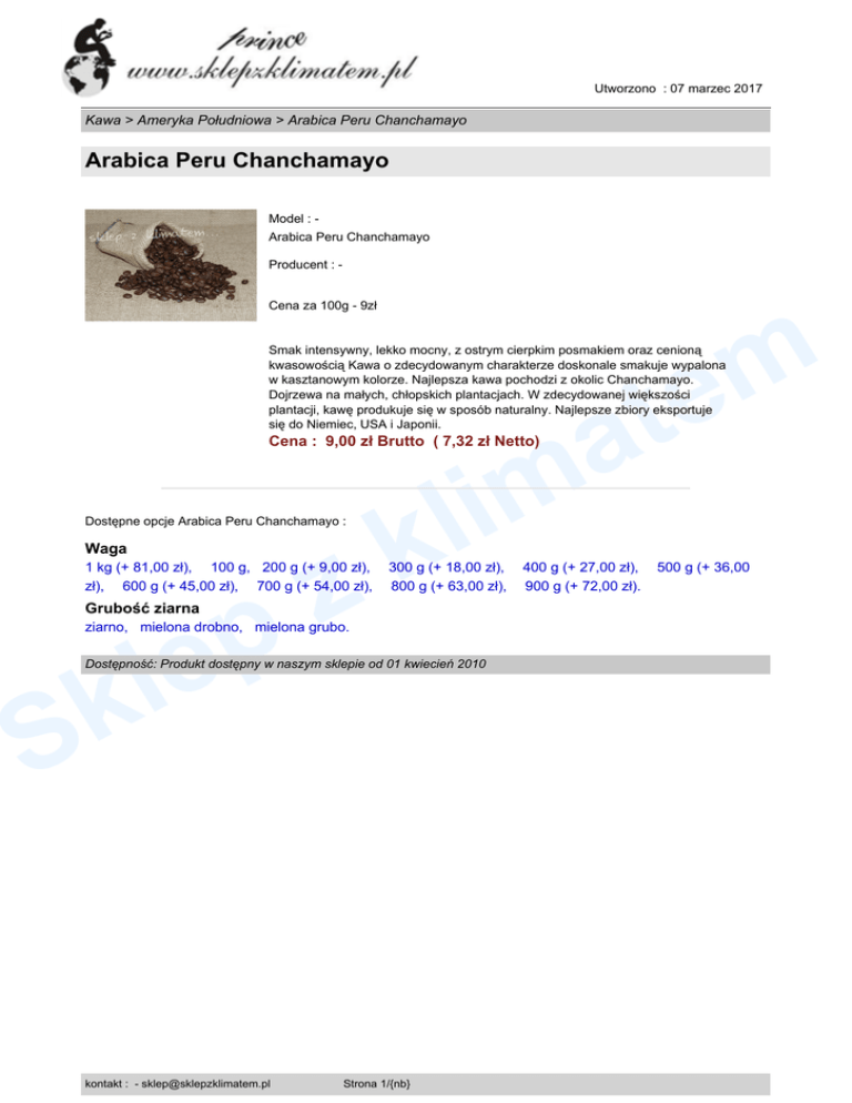 Utworzono : 07 marzec 2017 Kawa > Ameryka Południowa > Arabica Peru Chanchamayo Arabica Peru Chanchamayo Model : Arabica Peru Chanchamayo Producent : Cena za 100g - 9zł m e t Smak intensywny, lekko mocny, z ostrym cierpkim posmakiem oraz cenioną kwasowością Kawa o zdecydowanym charakterze doskonale smakuje wypalona w kasztanowym kolorze. Najlepsza kawa pochodzi z okolic Chanchamayo. Dojrzewa na małych, chłopskich plantacjach. W zdecydowanej większości plantacji, kawę produkuje się w sposób naturalny. Najlepsze zbiory eksportuje się do Niemiec, USA i Japonii. a m Cena : 9,00 zł Brutto ( 7,32 zł Netto) Dostępne opcje Arabica Peru Chanchamayo : Waga z p 1 kg (+ 81,00 zł), 100 g, 200 g (+ 9,00 zł), zł), 600 g (+ 45,00 zł), 700 g (+ 54,00 zł), Grubość ziarna e l k i l k 300 g (+ 18,00 zł), 800 g (+ 63,00 zł), ziarno, mielona drobno, mielona grubo. Dostępność: Produkt dostępny w naszym sklepie od 01 kwiecień 2010 S kontakt : - [email protected] Strona 1/{nb} 400 g (+ 27,00 zł), 900 g (+ 72,00 zł). 500 g (+ 36,00