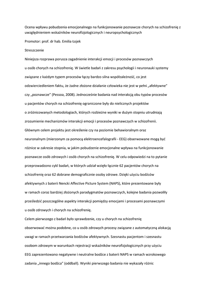 Ocena wpływu pobudzenia emocjonalnego na funkcjonowanie poznawcze chorych na schizofrenię z uwzględnieniem wskaźników neurofizjologicznych i neuropsychologicznych Promotor: prof. dr hab. Emilia Łojek Streszczenie Niniejsza rozprawa porusza zagadnienie interakcji emocji i procesów poznawczych u osób chorych na schizofrenię. W świetle badań z zakresu psychologii i neuronauki systemy związane z każdym typem procesów łączy bardzo silna współzależność, co jest odzwierciedleniem faktu, że żadne złożone działanie człowieka nie jest w pełni „afektywne” czy „poznawcze” (Pessoa, 2008). Jednocześnie badania nad interakcją obu typów procesów u pacjentów chorych na schizofrenię ograniczone były do nielicznych projektów o zróżnicowanych metodologiach, których rozbieżne wyniki w dużym stopniu utrudniają zrozumienie mechanizmów interakcji emocji i procesów poznawczych w schizofrenii. Głównym celem projektu jest określenie czy na poziomie behawioralnym oraz neuronalnym (mierzonym za pomocą elektroencefalografii - EEG) obserwowane mogą być różnice w zakresie stopnia, w jakim pobudzenie emocjonalne wpływa na funkcjonowanie poznawcze osób zdrowych i osób chorych na schizofrenię. W celu odpowiedzi na to pytanie przeprowadzono cykl badań, w których udział wzięło łącznie 62 pacjentów chorych na schizofrenię oraz 62 dobrane demograficznie osoby zdrowe. Dzięki użyciu bodźców afektywnych z baterii Nencki Affective Picture System (NAPS), które prezentowane były w ramach coraz bardziej złożonych paradygmatów poznawczych, kolejne badania pozwoliły prześledzić poszczególne aspekty interakcji pomiędzy emocjami i procesami poznawczymi u osób zdrowych i chorych na schizofrenię. Celem pierwszego z badań było sprawdzenie, czy u chorych na schizofrenię obserwować można podobne, co u osób zdrowych procesy związane z automatyczną alokacją uwagi w ramach przetwarzania bodźców afektywnych. Szesnastu pacjentom i szesnastu osobom zdrowym w warunkach rejestracji wskaźników neurofizjologicznych przy użyciu EEG zaprezentowano negatywne i neutralne bodźce z baterii NAPS w ramach wzrokowego zadania „innego bodźca” (oddball). Wyniki pierwszego badania nie wykazały różnic pomiędzy grupami, ani w zakresie ocen behawioralnych bodźców, ani też w odniesieniu do wczesnych (N2/P3) i późnych (Późny Dodatni Potencjał – Late Positive Potential; LPP) potencjałów związanych z mechanizmami alokacji uwagi. Drugie badanie cyklu miało na celu ocenę procesów związanych z automatyczną kontrolą wykonawczą, która aktywowana jest w sytuacji, gdy wykonanie zadania poznawczego zagrożone jest przez prezentację dystraktorów emocjonalnych. W tym celu 28 pacjentów i 28 osób zdrowych wykonywało zadanie odroczonego dopasowywania do wzorca (delayed matching to sample task; DMST), pomiędzy próbami którego prezentowane były bodźce afektywne z baterii NAPS. Zgodnie z hipotezami badania u pacjentów zaobserwowano niższy poziom wykonania zadania niezależnie od typu prezentowanej dystrakcji. W obu grupach stwierdzono podobną odpowiedź neurofizjologiczną na bodźce afektywne (LPP), jak również podobną modulację potencjałów P3 związanych z zapamiętywaniem i odtwarzaniem materiału w zależności od typu dystraktorów. W trakcie najbardziej wrażliwej na wpływ dystraktorów fazy zadania związanej z utrzymywaniem materiału w pamięci u osób zdrowych pod wpływem dystrakcji o charakterze negatywnym zaobserwowano wzmożenie aktywności neuronalnej (mierzonej amplitudą Negatywnej Fali Wolnej obserwowanej w okolicach ciemieniowych w przedziale pomiędzy 1000 a 4000 ms po prezentacji bodźca do zapamiętania). Wyniki wcześniejszych badań z użyciem metody funkcjonalnego rezonansu magnetycznego (fMRI), w których wykorzystywano paradygmat DMST połączony z bodźcami dystrakcyjnymi, wskazują, że efekt ten wiązać może się z nasiloną kontrolą wykonawczą, która niezbędna jest do przeciwstawienia się bodźcom dystrakcyjnym o charakterze emocjonalnym. Takiego zjawiska nie odnotowano w grupie klinicznej. Ostatnie z badań cyklu miało na celu analizę mechanizmów, które związane są z wolicjonalną kontrolą wykonawczą w odniesieniu do materiału afektywnego. Osiemnastu pacjentów oraz osiemnaście osób zdrowych wykonywało zadanie intencjonalnego zapominania (directed forgetting) oparte na negatywnych i neutralnych bodźcach z baterii NAPS. W obu grupach stwierdzono podobną modulację LPP w odpowiedzi na bodźce afektywne oraz podobne efekty „emocjonalnego wzmocnienia pamięci” (emotional enhancement of memory) na poziomie behawioralnym. Mimo osłabienia funkcji pamięci u pacjentów, w obu grupach stwierdzono porównywalną skuteczność procesów związanych z intencjonalnym zapominaniem materiału negatywnego i neutralnego. Dalsze analizy potencjałów wywołanych zarejestrowanych w trakcie obu faz zadania wykazały, że w obu grupach efekt ten związany był z użyciem odmiennych strategii. U osób zdrowych dla bodźców neutralnych intencjonalne zapominanie opierało się na mechanizmach wzmacniających zapamiętywanie bodźców prezentowanych z instrukcją „Pamiętaj” („selektywne powtarzanie”), podczas gdy dla bodźców negatywnych odbywało się ono poprzez „aktywną supresję” zapamiętywania bodźców prezentowanych z instrukcją „Zapomnij”. Natomiast u pacjentów nie wykryto mechanizmów związanych z „aktywną supresją” - jedynym obserwowanym mechanizmem było „selektywne powtarzanie”, którego osoby chore na schizofrenię używały w odniesieniu do bodźców negatywnych. Podsumowując, powyższy cykl badań wskazał na szereg zjawisk, które towarzyszą interakcji procesów emocjonalnych i poznawczych w schizofrenii. U pacjentów obserwować można zachowaną automatyczną reakcję i alokację uwagi na bodźcach afektywnych bez względu na kontekst, w jakim są pr