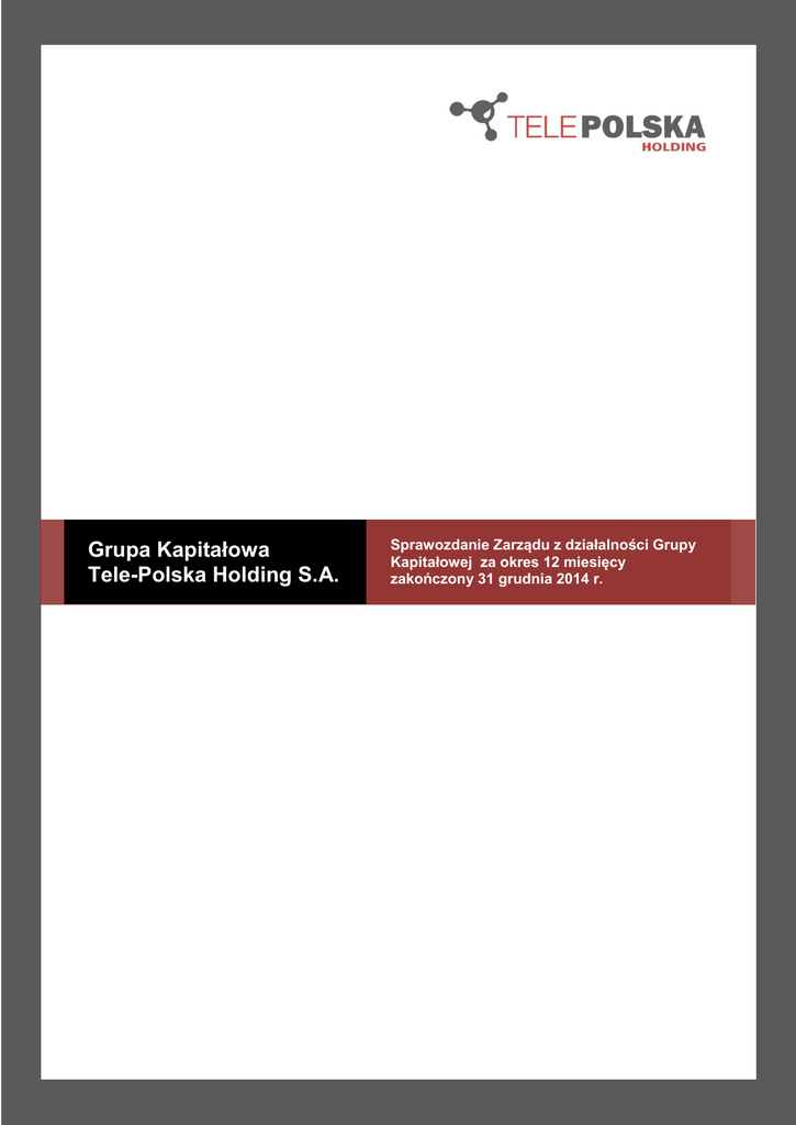 Grupa Kapitałowa Tele-Polska Holding S.A. Sprawozdanie Zarządu z działalności Grupy Kapitałowej za okres 12 miesięcy zakończony 31 grudnia 2014 r. SPIS TREŚCI 1. Informacje wstępne ........................................................................................................................................... 5 2. Opis organizacji Grupy Kapitałowej Emitenta ze wskazaniem jednostek podlegających konsolidacji oraz opis zmian w organizacji Grupy Kapitałowej ............................................................................................................ 6 3. Omówienie podstawowych wielkości ekonomiczno-finansowych, ujawnionych w rocznym skonsolidowanym sprawozdaniu finansowym Grupy ..................................................................................................................... 6 3.1. Opis czynników i zdarzeń, w tym o nietypowym charakterze, mających znaczący wpływ na działalność Spółki i Grupy Kapitałowej Spółki oraz osiągnięte zyski lub poniesione straty w roku obrotowym .................. 6 3.2. Omówienie perspektyw rozwoju działalności Spółki i jej Grupy Kapitałowej przynajmniej w najbliższym roku obrotowym ................................................................................................................................................ 6 4. Opis istotnych czynników ryzyka i zagrożeń, z określeniem, w jakim stopniu Grupa Kapitałowa Spółki jest na nie narażona ...................................................................................................................................................... 7 4.1. Ryzyko związane z sytuacją makroekonomiczną w Polsce........................................................................ 7 4.2. Ryzyko związane z koniunkturą w branży telekomunikacyjnej ................................................................. 8 4.3. Ryzyko rynkowe ......................................................................................................................................... 8 4.4. Ryzyko kredytowe ..................................................................................................................................... 8 4.5. Ryzyko płynności ....................................................................................................................................... 8 4.6. Ryzyko związane ze zmianą przepisów prawnych lub ich interpretacji ..................................................... 8 4.7. Ryzyko związane z niekorzystnymi zmianami przepisów podatkowych .................................................... 9 5. Opis głównych cech systemów kontroli wewnętrznej i zarządzania ryzykiem stosowanych w Grupie Kapitałowej w odniesieniu do procesu sporządzania sprawozdań finansowych ............................................... 9 5.1. Zarządzanie płynnością ........................................................................................................................... 10 5.2. Zarządzanie kapitałem ............................................................................................................................ 10 5.3. Monitoring instrumentów finansowych .................................................................................................. 10 6. Informacje o podstawowych produktach, towarach lub usługach wraz z ich określeniem wartościowym i ilościowym oraz udziałem poszczególnych produktów, towarów i usług (jeżeli są istotne) albo ich grup w sprzedaży Grupy Kapitałowej Spółki ogółem, a także zmianach w tym zakresie w danym roku obrotowym 10 7. Informacje o rynkach zbytu ............................................................................................................................. 11 8. Informacje o zawartych umowach znaczących dla działalności Grupy Kapitałowej, w tym znanych Spółce umowach zawartych pomiędzy akcjonariuszami (wspólnikami), umowach ubezpieczenia, współpracy lub kooperacji ........................................................................................................................................................ 12 9. Informacje o powiązaniach organizacyjnych lub kapitałowych Spółki z innymi podmiotami oraz określenie głównych inwestycji krajowych i zagranicznych (papiery wartościowe, instrumenty finansowe, wartości niematerialne i prawne oraz nieruchomości), w tym inwestycji kapitałowych dokonanych poza grupą jednostek powiązanych oraz opis metod ich finansowania ............................................................................. 13 10. Informacje o istotnych transakcjach zawartych przez Spółkę lub jednostkę od niego zależną z podmiotami powiązanymi na innych warunkach niż rynkowe ............................................................................................ 13 2015-04-30 Strona | 2 z 36 Sprawozdanie Zarządu 11. Informacje o zaciągniętych i wypowiedzianych w 2014 roku umowach kredytowych i umowach pożyczek oraz udzielonych i otrzymanych poręczeniach i gwarancjach z podaniem co najmniej ich kwoty, rodzaju i wysokości stopy procentowej, waluty i terminu wymagalności ..................................................................... 13 11.1. Umowy pożyczek zaciągniętych .............................................................................................................. 13 11.2. Umowy kredytowe .................................................................................................................................. 13 11.3. Umowy pożyczek udzielonych ................................................................................................................. 14 11.4. Poręczenia udzielone ............................................................................................................................... 14 11.5. Poręczenia otrzymane ............................................................................