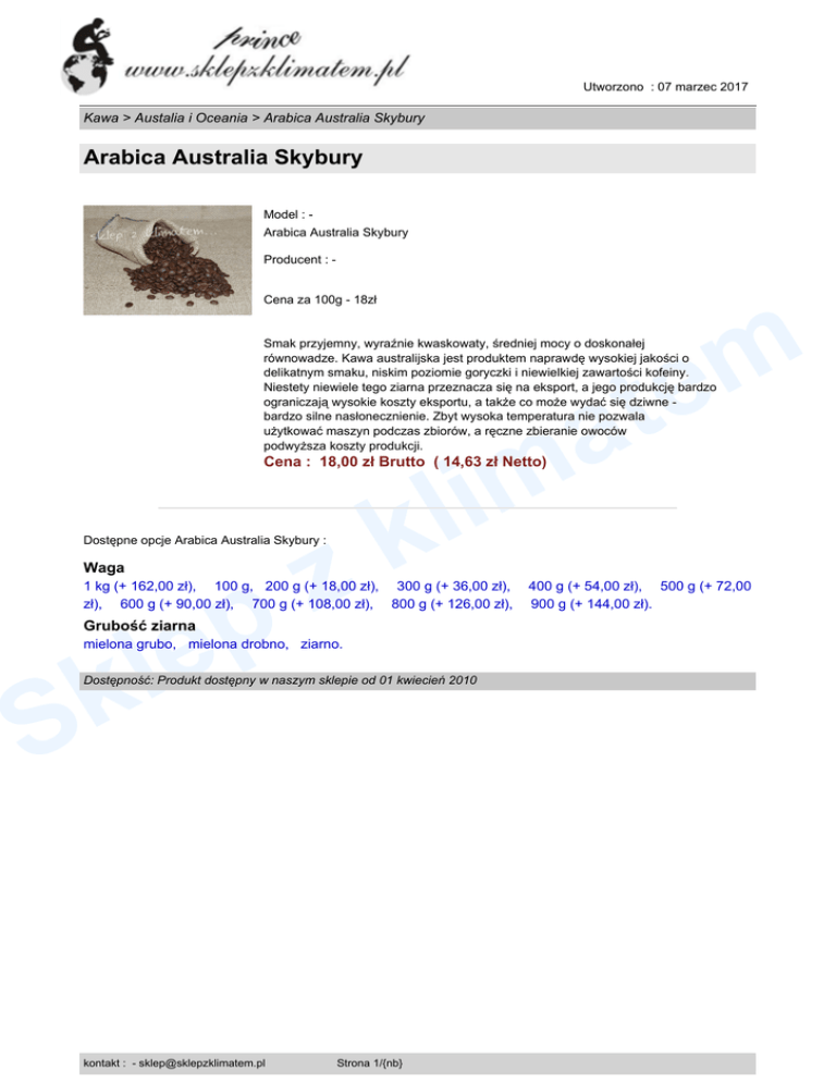 Utworzono : 07 marzec 2017 Kawa > Austalia i Oceania > Arabica Australia Skybury Arabica Australia Skybury Model : Arabica Australia Skybury Producent : Cena za 100g - 18zł m e t Smak przyjemny, wyraźnie kwaskowaty, średniej mocy o doskonałej równowadze. Kawa australijska jest produktem naprawdę wysokiej jakości o delikatnym smaku, niskim poziomie goryczki i niewielkiej zawartości kofeiny. Niestety niewiele tego ziarna przeznacza się na eksport, a jego produkcję bardzo ograniczają wysokie koszty eksportu, a także co może wydać się dziwne bardzo silne nasłonecznienie. Zbyt wysoka temperatura nie pozwala użytkować maszyn podczas zbiorów, a ręczne zbieranie owoców podwyższa koszty produkcji. i l k a m Cena : 18,00 zł Brutto ( 14,63 zł Netto) z p Dostępne opcje Arabica Australia Skybury : Waga 1 kg (+ 162,00 zł), 100 g, 200 g (+ 18,00 zł), 300 g (+ 36,00 zł), zł), 600 g (+ 90,00 zł), 700 g (+ 108,00 zł), 800 g (+ 126,00 zł), e l k Grubość ziarna mielona grubo, mielona drobno, ziarno. S Dostępność: Produkt dostępny w naszym sklepie od 01 kwiecień 2010 kontakt : - [email protected] Strona 1/{nb} 400 g (+ 54,00 zł), 500 g (+ 72,00 900 g (+ 144,00 zł).