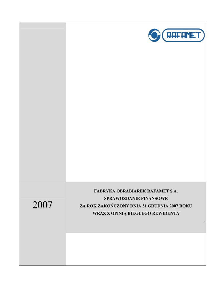 FABRYKA OBRABIAREK RAFAMET S.A. SPRAWOZDANIE FINANSOWE 2007 ZA ROK ZAKOŃCZONY DNIA 31 GRUDNIA 2007 ROKU WRAZ Z OPINIĄ BIEGŁEGO REWIDENTA . Fabryka Obrabiarek RAFAMET S.A. Sprawozdanie finansowe za rok zakończony dnia 31 grudnia 2007 roku ( w tysiącach złotych) RAFAMET S.A. Sprawozdanie finansowe za okres 12 miesięcy zakończony dnia 31 grudnia 2007 roku SPIS TREŚCI Informacje ogólne I. Dane jednostki ................................................................................................................................................................................4 II. Czas trwania Jednostki.....................................................................................................................................................................4 III. Okresy prezentowane ......................................................................................................................................................................4 IV. Skład organów Jednostki.................................................................................................................................................................4 V. Biegli rewidenci...............................................................................................................................................................................5 VI. Banki ...............................................................................................................................................................................................5 VII. Notowania na rynku regulowanym .................................................................................................................................................5 VIII. Znaczący akcjonariusze ..................................................................................................................................................................6 IX. Spółki zaleŜne .................................................................................................................................................................................6 X. Oświadczenie zarządu......................................................................................................................................................................6 XI. Zatwierdzenie sprawozdania finansowego ......................................................................................................................................7 SPRAWOZDANIE FINANSOWE RAFAMET S.A. ...........................................................................................................................8 Rachunek zysków i strat ..........................................................................................................................................................................8 Bilans.......................................................................................................................................................................................................9 Zestawienie zmian w kapitale własnym ................................................................................................................................................10 Rachunek przepływów pienięŜnych ......................................................................................................................................................11 INFORMACJA DODATKOWA DO SPRAWOZDANIA FINANSOWEGO .....................................................................................13 I. Zgodność z MSSF ............................................................................................................................................................................13 II. ZałoŜenie kontynuacji działalności gospodarczej i porównywalność sprawozdań finansowych .....................................................13 III. Opis przyjętych zasad rachunkowości .............................................................................................................................................13 IV. Istotne wartości oparte na profesjonalnym osądzie i szacunkach ....................................................................................................23 V. Zmiany zasad rachunkowości ..........................................................................................................................................................24 VI. Standardy oczekujące na zatwierdzenie Komisji Europejskiej........................................................................................................24 DODATKOWE NOTY I OBJAŚNIENIA DO SPRAWOZDANIA FINANSOWEGO .......................................................................25 Nota 1. Przychody ze sprzedaŜy ..........................................................................................................................................................25 Nota 2. Koszty działalności operacyjnej..............................................................................................................................................28 Nota 3. Pozostałe przychody i koszty operacyjne................................................................................................................................29 Nota 4. Przychody i koszty finansowe.................................................................................................................................................29 Nota 5. Podatek dochodowy i odroczony podatek dochodowy ...........................................................................................................30 Nota 6. Działalność zaniechana...........................................................................................................................................................32 Nota 7. Zysk przypadający na 1 akcje ........................................................................