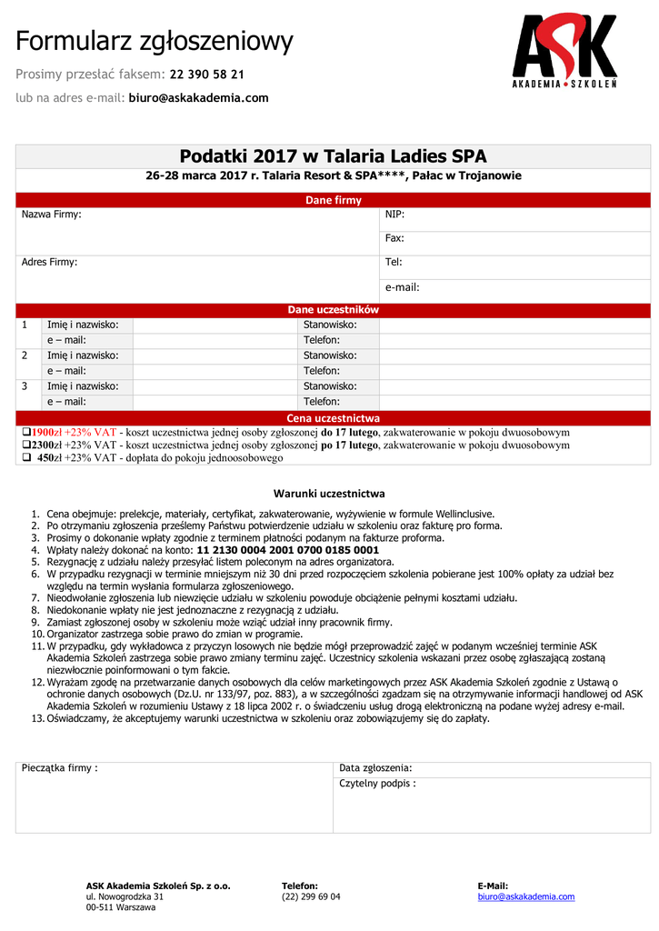 Formularz zgłoszeniowy Prosimy przesłać faksem: 22 390 58 21 lub na adres e-mail: [email protected] Podatki 2017 w Talaria Ladies SPA 26-28 marca 2017 r. Talaria Resort & SPA****, Pałac w Trojanowie Dane firmy Nazwa Firmy: NIP: Fax: Adres Firmy: Tel: e-mail: 1 Imię i nazwisko: 2 3 Dane uczestników Stanowisko: e – mail: Telefon: Imię i nazwisko: Stanowisko: e – mail: Telefon: Imię i nazwisko: Stanowisko: e – mail: Telefon: Cena uczestnictwa 1900zł +23% VAT - koszt uczestnictwa jednej osoby zgłoszonej do 17 lutego, zakwaterowanie w pokoju dwuosobowym 2300zł +23% VAT - koszt uczestnictwa jednej osoby zgłoszonej po 17 lutego, zakwaterowanie w pokoju dwuosobowym 450zł +23% VAT - dopłata do pokoju jednoosobowego Warunki uczestnictwa 1. 2. 3. 4. 5. 6. Cena obejmuje: prelekcje, materiały, certyfikat, zakwaterowanie, wyżywienie w formule Wellinclusive. Po otrzymaniu zgłoszenia prześlemy Państwu potwierdzenie udziału w szkoleniu oraz fakturę pro forma. Prosimy o dokonanie wpłaty zgodnie z terminem płatności podanym na fakturze proforma. Wpłaty należy dokonać na konto: 11 2130 0004 2001 0700 0185 0001 Rezygnację z udziału należy przesyłać listem poleconym na adres organizatora. W przypadku rezygnacji w terminie mniejszym niż 30 dni przed rozpoczęciem szkolenia pobierane jest 100% opłaty za udział bez względu na termin wysłania formularza zgłoszeniowego. 7. Nieodwołanie zgłoszenia lub niewzięcie udziału w szkoleniu powoduje obciążenie pełnymi kosztami udziału. 8. Niedokonanie wpłaty nie jest jednoznaczne z rezygnacją z udziału. 9. Zamiast zgłoszonej osoby w szkoleniu może wziąć udział inny pracownik firmy. 10. Organizator zastrzega sobie prawo do zmian w programie. 11. W przypadku, gdy wykładowca z przyczyn losowych nie będzie mógł przeprowadzić zajęć w podanym wcześniej terminie ASK Akademia Szkoleń zastrzega sobie prawo zmiany terminu zajęć. Uczestnicy szkolenia wskazani przez osobę zgłaszającą zostaną niezwłocznie poinformowani o tym fakcie. 12. Wyrażam zgodę na przetwarzanie danych osobowych dla celów marketingowych przez ASK Akademia Szkoleń zgodnie z Ustawą o ochronie danych osobowych (Dz.U. nr 133/97, poz. 883), a w szczególności zgadzam się na otrzymywanie informacji handlowej od ASK Akademia Szkoleń w rozumieniu Ustawy z 18 lipca 2002 r. o świadczeniu usług drogą elektroniczną na podane wyżej adresy e-mail. 13. Oświadczamy, że akceptujemy warunki uczestnictwa w szkoleniu oraz zobowiązujemy się do zapłaty. Pieczątka firmy : Data zgłoszenia: Czytelny podpis : ASK Akademia Szkoleń Sp. z o.o. ul. Nowogrodzka 31 00-511 Warszawa Telefon: (22) 299 69 04 E-Mail: [email protected]