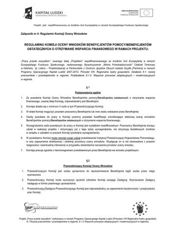Projekt jest współfinansowany ze środków Unii Europejskiej w ramach Europejskiego Funduszu Społecznego Załącznik nr 4: Regulamin Komisji Oceny Wniosków REGULAMINU KOMISJI OCENY WNIOSKÓW BENEFICJENTÓW POMOCY/BENEFICJENTÓW OSTATECZNYCH O OTRZYMANIE WSPARCIA FINANSOWEGO W RAMACH PROJEKTU: „Praca przede wszystkim”, zwanego dalej „Projektem” współfinansowanego ze środków Unii Europejskiej w ramach Europejskiego Funduszu Społecznego, realizowanego Stowarzyszenie „Wolna Przedsiębiorczość” Oddział Terenowy w Gdańsku (tj. Lidera – Projektodawcę) w Partnerstwie z Centrum Języków Obcych Izabela Szydło (Partnera) w ramach Programu Operacyjnego Kapitał Ludzki 2007-2013, Priorytet VIII: Regionalne kadry gospodarki, Działanie 8.1: rozwój pracowników i przedsiębiorstw w regionie, Poddziałanie 8.1.2: Wsparcie procesów adaptacyjnych i modernizacyjnych w regionie. §1 Postanowienia ogólne 1. Za powołanie Komisji Oceny Wniosków Beneficjentów pomocy/Beneficjentów ostatecznych o otrzymanie wsparcia finansowego, zwanej dalej Komisją, odpowiedzialny jest Beneficjent. 2. Komisja składa się z minimum 4 osób w tym Przewodniczącego Komisji. 3. W skład Komisji mogą być powołani pracownicy Beneficjenta lub inne osoby wskazane przez Beneficjenta. 4. Osoby powołane do pracy w Komisji powinny posiadać kwalifikacje umożliwiające właściwą ocenę wniosków Beneficjentów pomocy/Beneficjentów ostatecznych o otrzymanie wsparcia finansowego. 5. Wynagrodzenie osób powołanych do pracy w Komisji jest wydatkiem kwalifikowalnym. Pracownicy Beneficjenta biorący udział w realizacji projektu i otrzymujący już z tego tytułu wynagrodzenie, nie otrzymują dodatkowych środków w związku z udziałem w pracach Komisji (podwójne wynagradzanie). 6. W posiedzeniu Komisji może również wziąć udział przedstawiciel Instytucji Pośredniczącej Województwa Pomorskiego, w celu zapewnienia obiektywnej i rzetelnej procedury oceny wniosków. Występuje on w roli obserwatora z prawem reagowania i ewentualnej interwencji w przypadku stwierdzenia naruszenia procedur oceny wniosku. 7. Komisja pracuje zgodnie z harmonogramem przedstawionym przez Beneficjenta we wniosku projektowym. §2 Przewodniczący Komisji Oceny Wniosków 1. Przewodniczącym Komisji jest osoba uprawniona do reprezentowania Beneficjenta bądź osoba przez niego wyznaczona. 2. Przewodniczący Komisji może wyznaczyć spośród członków Komisji swojego Zastępcę. Wyznaczenie Zastępcy następuje w formie pisemnego upoważnienia. 3. Przewodniczący/Zastępca Przewodniczącego Komisji jest odpowiedzialny za zapewnienie bezstronności i przejrzystości prac Komisji. Projekt „Praca przede wszystkim” realizowany w ramach Programu Operacyjnego Kapitał Ludzki (Priorytetu VIII Regionalne Kadry gospodarki, 8.1 Rozwój pracowników i przedsiębiorstw w regionie, 8.1.2 Wsparcie procesów adaptacyjnych i modernizacyjnych w regionie). Projekt jest współfinansowany ze środków Unii Europejskiej w ramach Europejskiego Funduszu Społecznego 4. Wniosek Beneficjenta pomocy/Beneficjenta ostatecznego o otrzymanie wsparcia finansowego, tj.: Wniosek o przyznanie jednorazowej dotacji inwestycyjnej, Wniosek o przyznanie podstawowego wsparcia pomostowego, Wniosek o przyznanie przedłużonego wsparcia pomostowego. §3 Zadania Komisji Oceny Wniosków 1. Komisja jest odpowiedzialna za: a) przeprowadzenie oceny merytorycznej wniosków o przez Beneficjentów pomocy/Beneficjentów ostatecznych, otrzymanie wsparcia finansowego złożonych b) zweryfikowanie biznes planów i pozostałych załączników do wniosku, c) sporządzenie listy wniosków uszeregowanych w kolejności od największej liczby uzyskanych punktów, d) wyłonienie wniosków, które otrzymają wsparcie finansowe (wnioski, które otrzymały co najmniej 60% punktów ogólnej sumy punktów, zaś w poszczególnych punktach oceny merytorycznej uzyskały przynajmniej 40% punktów), w ramach środków określonych we wniosku projektowym na dany rodzaj wsparcia. §4 Posiedzenia Komisji Oceny Wniosków 1. Posiedzenia Komisji są ważne, gdy uczestniczy w nich minimum Przewodniczącego). Komisji (w tym Przewodniczący/Zastępca 2. Członkowie Komisji dokonują oceny merytorycznej wniosków podczas posiedzenia Komisji, które odbywa się w siedzibie Beneficjenta lub innym wskazanym miejscu. 3. Członkowie Komisji zobowiązani są do szczegółowego i merytorycznego uzasadnienia dokonanych ocen. §5 Zasada bezstronności prac Komisji Oceny Wniosków 1. Członkowie Komisji nie mogą być związani z wnioskodawcami stosunkiem osobistym lub służbowym, takiego rodzaju, który mógłby wywołać wątpliwości co do bezstronności przeprowadzonych czynności. 2. Członkowie Komisji zobowiązani są do podpisania Deklaracji bezstronności i poufności, której wzór stanowi załącznik do niniejszego regulaminu. 3. Każdy członek Komisji przed przystąpieniem do oceny wniosku, zobowiązany jest także podpisać Deklarację bezstronności znajdującą się na Karcie oceny merytorycznej wniosku Beneficjenta pomocy/Beneficjenta ostatecznego o otrzymanie wsparcia finansowego w odniesieniu do ocenianego przez siebie wniosku. Nie podpisanie deklaracji bezstronności pozbawia członka Komisji możliwości oceny danego wniosku. 4. W przypadku, określonym w ust. 3, wniosek jest kierowany do oceny innego członka Komisji wskazanego przez Przewodniczącego/Zastępcę Przewodniczącego. Projekt „Praca przede wszystkim” realizowany w ramach Programu Operacyjnego Kapitał Ludzki (Priorytetu VIII Regionalne Kadry gospodarki, 8.1 Rozwój pracowników i przedsiębiorstw w regionie, 8.1.2 Wsparcie procesów adaptacyjnych i modernizacyjnych w regionie). Projekt jest współfinansowany ze środków Unii Europejskiej w ramach Europejskiego Funduszu Społecznego §6 Ocena jakości merytorycznej i finansowej wniosków 1. Przedmiotem oceny Komisji są wyłącznie wnioski ocenione przez Beneficjen