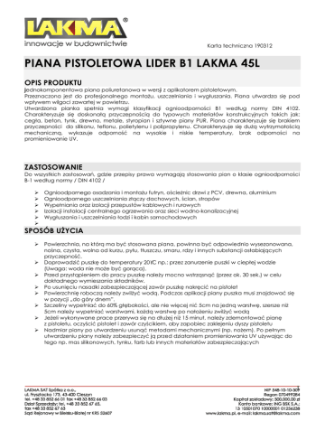 Karta techniczna 190312 PIANA PISTOLETOWA LIDER B1 LAKMA 45L OPIS PRODUKTU jednokomponentowa piana poliuretanowa w wersji z aplikatorem pistoletowym. Przeznaczona jest do profesjonalnego montażu, uszczelniania i wygłuszania. Piana utwardza się pod wpływem wilgoci zawartej w powietrzu. Utwardzona pianka spełnia wymogi klasyfikacji ognioodporności B1 według normy DIN 4102. Charakteryzuje się doskonałą przyczepnością do typowych materiałów konstrukcyjnych takich jak: cegła, beton, tynk, drewno, metale, styropian i sztywne piany PUR. Piana charakteryzuje się brakiem przyczepności do silikonu, teflonu, polietylenu i polipropylenu. Charakteryzuje się dużą wytrzymałością mechaniczną, wykazuje odporność na wysokie i niskie temperatury, brak odporności na promieniowanie UV. ZASTOSOWANIE Do wszystkich zastosowań, gdzie przepisy prawa wymagają stosowania pian o klasie ognioodporności B-1 według normy / DIN 4102 / Ognioodpornego osadzania i montażu futryn, ościeżnic drzwi z PCV, drewna, aluminium Ognioodpornego uszczelniania złączy dachowych, ścian, stropów Wypełniania oraz izolacji przepustów kablowych i rurowych Izolacji instalacji centralnego ogrzewania oraz sieci wodno-kanalizacyjnej Wygłuszania i uszczelniania łodzi i kabin samochodowych SPOSÓB UŻYCIA Powierzchnia, na którą ma być stosowana piana, powinna być odpowiednio wysezonowana, nośna, czysta, wolna od kurzu, pyłu, tłuszczu, smaru, rdzy i innych substancji osłabiających przyczepność. Doprowadzić puszkę do temperatury 20°C np.: przez zanurzenie puszki w ciepłej wodzie (Uwaga: woda nie może być gorąca). Przed przystąpieniem do pracy puszkę należy mocno wstrząsnąć (przez ok. 30 sek.) w celu dokładnego wymieszania składników. Po usunięciu nasadki zabezpieczającej zawór puszkę nakręcić na pistolet Powierzchnię roboczą należy zwilżyć wodą. Podczas aplikacji piany puszka musi znajdować się w pozycji „do góry dnem”. Szczeliny wypełniać do 60% głębokości, ale nie więcej nić 5cm na jedną warstwę, szersze niż 5cm należy wypełniać warstwami, każdą warstwę po nałożeniu zwilżyć wodą Jeżeli wykonywane prace przerywa się na dłużej niż 15 minut, należy zdemontować pianę z pistoletu, oczyścić pistolet i zawór czyścikiem, aby zapobiec zaklejeniu dyszy pistoletu Nadmiar piany po utwardzeniu usunąć metodami mechanicznymi (np. nożem). Po pełnym utwardzeniu piany należy zabezpieczyć ją przed działaniem promieniowania UV używając do tego np. mas silikonowych, tynku, farb lub innych materiałów zabezpieczających 1 Karta techniczna 190312 DANE TECHNICZNE Parametry Wartość Parametry preparatu nie utwardzonego (zawartości puszki) ciemnobrązowa ciecz w pojemniku Stan skupienia ciśnieniowym pod ciśnieniem płynnego gazu Barwa od ciemno do jasnoczerwonego Zapach charakterystyczny, drażniący Rozpuszczalność preparatu: Uwaga! Powolna reakcja z wodą, a) w wodzie (proces twardnienia piany) b) w rozpuszczalnikach organicznych aceton Parametry utwardzonego preparatu (piany) Kolor Jasno czerwony od -5°C do +25°C (optymalnie Temperatura pracy podłoża +20OC) Temperatura puszki +20°C Czas tworzenia naskórka 5÷8 min (20°C, RH 90%) Czas pełnego utwardzenia 12 godz. -40°C ÷+80°C Odporność termiczna (po utwardzeniu) Okresowo -40°C ÷+100°C Wydłużenie przy obciążeniu ok. 5% Chłonność wody po 24 godz. 0,3% 0,02÷0,03 MPa (na ściskanie) Wytrzymałość 0,08÷0,10 MPa (na rozciąganie) Klasa palności Przewodnictwo cieplne Rozpuszczalność preparatu: a) w wodzie b) w rozpuszczalnikach organicznych Wydajność piany z opakowania 750 ml: Przechowywanie i okres przydatności B1 wg normy DIN 4102 0,04 W/m·K brak Spęcznianie w wybranych rozpuszczalnikach Do 45 dm3 (w zależności od temperatury otoczenia i wilgotności powietrza, oraz umiejętności montażysty a także stanu technicznego sprzętu – pistoletu do aplikacji) Produkt należy przechowywać w zamkniętym opakowaniu w pozycji pionowej, (aby zapobiec zaklejeniu zaworu) w dobrze wentylowanym pomieszczeniu w temperaturze od +5°C do +35°C (zalecana pokojowa) z dala od bezpośredniego nasłonecznienia oraz innych źródeł ciepła i zapłonu. Przechowywanie produktu w innych warunkach niż podane może spowodować skrócenie przydatności do użycia nawet o 3 miesiące. Termin ważności 12 miesięcy. Data ważności znajduje się na dnie opakowania. 2 Karta techniczna 190312 BHP I OSTRZEŻENIA Informacja o składnikach Zawiera izocyjaniany: (difenylometanodiizocyjanian, izomery i homologi, difenylometano-4,4’diizocyjanian, difenylometano-2,4’-diizocyjanian) Rodzaje zagrożeń: Produkt skrajnie łatwopalny. Działa szkodliwie przez drogi oddechowe i po połknięciu. Działa drażniąco na oczy, drogi oddechowe i skórę. Może powodować uczulenie w następstwie narażenia drogą oddechową i w kontakcie ze skórą. Ograniczone dowody działania rakotwórczego. Działa szkodliwie przez drogi oddechowe; stwarza poważne zagrożenie zdrowia w następstwie długotrwałego narażenia. Może powodować długo utrzymujące się niekorzystne zmiany w środowisku wodnym. Może oddziaływać szkodliwie na dzieci karmione piersią. Warunki bezpiecznego stosowania: Nie wdychać pary. Nosić odpowiednią odzież ochronną, odpowiednie rękawice ochronne. W przypadku awarii lub jeżeli źle się poczujesz, niezwłocznie zasięgnij porady lekarza – jeżeli to możliwe, pokaż etykietę. Stosować wyłącznie w dobrze wentylowanych pomieszczeniach. Wyroby przechowywać w miejscu niedostępnym dla dzieci. Zawiera izocyjaniany. Zapoznaj się z instrukcją dostarczoną przez producenta. Pojemnik pod ciśnieniem: chronić przed słońcem i nagrzaniem powyżej temperatury +50oC. Nie przekłuwać ani nie spalać, także po zużyciu. Nie rozpylać nad otwartym płomieniem lub żarzącym się materiałem. Nie przechowywać w pobliżu źródeł zapłonu – nie palić tytoniu. Ch