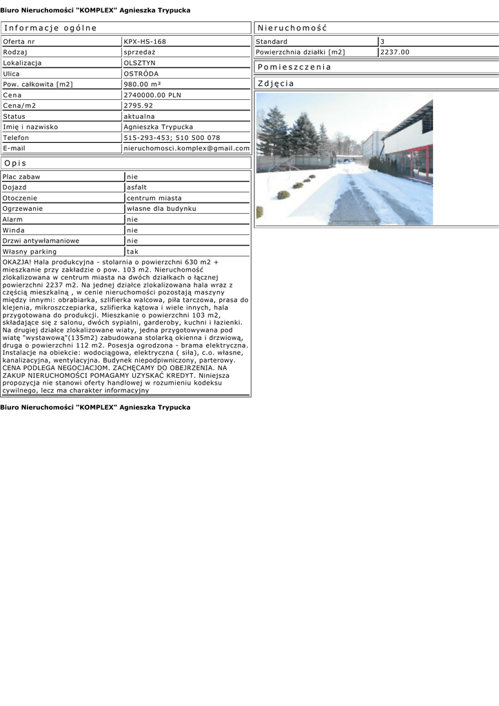 Biuro Nieruchomości "KOMPLEX" Agnieszka Trypucka Informacje ogólne Nieruchomość Oferta nr KPX-HS-168 Standard 3 Rodzaj sprzedaż Powierzchnia działki [m2] 2237.00 Lokalizacja OLSZTYN Ulica OSTRÓDA Pow. całkowita [m2] 980.00 m² Cena 2740000.00 PLN Cena/m2 2795.92 Status aktualna Imię i nazwisko Agnieszka Trypucka Telefon 515-293-453; 510 500 078 E-mail [email protected] Opis Plac zabaw nie Dojazd asfalt Otoczenie centrum miasta Ogrzewanie własne dla budynku Alarm nie Winda nie Drzwi antywłamaniowe nie Własny parking tak OKAZJA! Hala produkcyjna - stolarnia o powierzchni 630 m2 + mieszkanie przy zakładzie o pow. 103 m2. Nieruchomość zlokalizowana w centrum miasta na dwóch działkach o łącznej powierzchni 2237 m2. Na jednej działce zlokalizowana hala wraz z częścią mieszkalną , w cenie nieruchomości pozostają maszyny między innymi: obrabiarka, szlifierka walcowa, piła tarczowa, prasa do klejenia, mikroszczepiarka, szlifierka kątowa i wiele innych, hala przygotowana do produkcji. Mieszkanie o powierzchni 103 m2, składające się z salonu, dwóch sypialni, garderoby, kuchni i łazienki. Na drugiej działce zlokalizowane wiaty, jedna przygotowywana pod wiatę "wystawową"(135m2) zabudowana stolarką okienna i drzwiową, druga o powierzchni 112 m2. Posesja ogrodzona - brama elektryczna. Instalacje na obiekcie: wodociągowa, elektryczna ( siła), c.o. własne, kanalizacyjna, wentylacyjna. Budynek niepodpiwniczony, parterowy. CENA PODLEGA NEGOCJACJOM. ZACHĘCAMY DO OBEJRZENIA. NA ZAKUP NIERUCHOMOŚCI POMAGAMY UZYSKAĆ KREDYT. Niniejsza propozycja nie stanowi oferty handlowej w rozumieniu kodeksu cywilnego, lecz ma charakter informacyjny Biuro Nieruchomości "KOMPLEX" Agnieszka Trypucka Pomieszczenia Zdjęcia