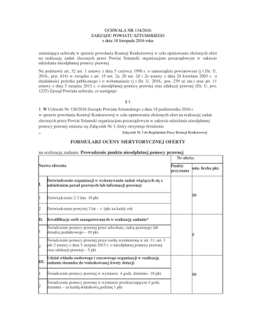 UCHWAŁA NR 134/2016 ZARZĄDU POWIATU SZTUMSKIEGO z dnia 18 listopada 2016 roku zmieniająca uchwałę w sprawie powołania Komisji Konkursowej w celu opiniowania złoŜonych ofert na realizację zadań zleconych przez Powiat Sztumski organizacjom pozarządowym w zakresie udzielania nieodpłatnej pomocy prawnej. Na podstawie art. 32 ust. 1 ustawy z dnia 5 czerwca 1998 r. o samorządzie powiatowym (j t Dz. U. 2016., poz. 814) w związku z art. 15 ust. 2a, 2b ust. 2d i 2e ustawy z dnia 24 kwietnia 2003 r. o działalności poŜytku publicznego i o wolontariacie (j t Dz. U. 2016,. poz. 239 ze zm.) oraz art. 11 ustawy z dnia 5 sierpnia 2015 r. o nieodpłatnej pomocy prawnej oraz edukacji prawnej (Dz. U. poz. 1255) Zarząd Powiatu uchwala, co następuje: §1 1. W Uchwale Nr 126/2016 Zarządu Powiatu Sztumskiego z dnia 18 października 2016 r. w sprawie powołania Komisji Konkursowej w celu opiniowania złoŜonych ofert na realizację zadań zleconych przez Powiat Sztumski organizacjom pozarządowym w zakresie udzielania nieodpłatnej pomocy prawnej zmienia się Załącznik Nr 3, który otrzymuje brzmienia „ Załącznik Nr 3 do Regulaminu Pracy Komisji Konkursowej FORMULARZ OCENY MERYTORYCZNEJ OFERTY na realizację zadania: Prowadzenie punktu nieodpłatnej pomocy prawnej Nr oferty: Nazwa oferenta I. Doświadczenie organizacji w wykonywaniu zadań wiąŜących się z udzieleniem porad prawnych lub informacji prawnej: 1 Doświadczenie 2-3 lata 10 pkt 2 Doświadczenie powyŜej 3 lat – + 1pkt za kaŜdy rok II. Kwalifikacje osób zaangaŜowanych w realizację zadania* 1 Świadczenie pomocy prawnej przez adwokata, radcę prawnego lub doradcę podatkowego – 10 pkt. 2 Świadczenie pomocy prawnej przez osobę wymienioną w art. 11, ust. 3 pkt 2 ustawy z dnia 5 sierpnia 2015 r. o nieodpłatnej pomocy prawnej oraz edukacji prawnej – 5 pkt Punkty min. liczba pkt. przyznane 10 5 Udział wkładu osobowego i rzeczowego organizacji w realizację III. zadania stosunku do wnioskowanej kwoty dotacji 1 Świadczenie pomocy prawnej w wymiarze 4 godz. dziennie– 10 pkt. 2 Świadczenie pomocy prawnej w wymiarze przekraczającym 4 godz. dziennie – za kaŜdą dodatkową godzinę 1 pkt 10 IV Udział wkładu finansowego organizacji w realizację zadania 1 Koszt nieprzekraczający dotację przewidzianą w budŜecie powiatu na realizację zadania – 5 pkt 2 Koszt przekraczający dotację przewidzianą w budŜecie powiatu na realizację zadania – 0 pkt RAZEM 5 30 Czytelny podpis członka Komisji: ................................................................... Sztum, dnia …………………. r. *W przypadku złoŜenia ofert wykazujących osoby wymienione w pkt. II.1 i II.2 formularza ocena punktowa dokonywana jest wg wzoru: (Pkt II.1x10) + (pkt II.2x5): liczba osób, przy udziale których realizowane będzie zadanie” 2. Pozostał e warunki pozostają bez zmian. §2. Uchwała wchodzi w Ŝycie z dniem podjęcia