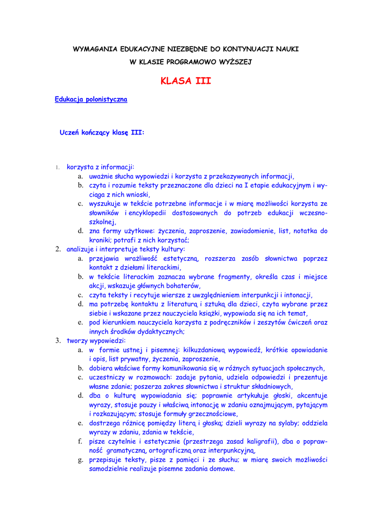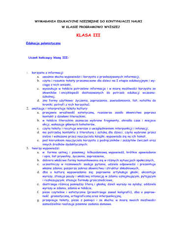 WYMAGANIA EDUKACYJNE NIEZBĘDNE DO KONTYNUACJI NAUKI W KLASIE PROGRAMOWO WYŻSZEJ KLASA III Edukacja polonistyczna Uczeń kończący klasę III: korzysta z informacji: a. uważnie słucha wypowiedzi i korzysta z przekazywanych informacji, b. czyta i rozumie teksty przeznaczone dla dzieci na I etapie edukacyjnym i wyciąga z nich wnioski, c. wyszukuje w tekście potrzebne informacje i w miarę możliwości korzysta ze słowników i encyklopedii dostosowanych do potrzeb edukacji wczesnoszkolnej, d. zna formy użytkowe: życzenia, zaproszenie, zawiadomienie, list, notatka do kroniki; potrafi z nich korzystać; 2. analizuje i interpretuje teksty kultury: a. przejawia wrażliwość estetyczną, rozszerza zasób słownictwa poprzez kontakt z dziełami literackimi, b. w tekście literackim zaznacza wybrane fragmenty, określa czas i miejsce akcji, wskazuje głównych bohaterów, c. czyta teksty i recytuje wiersze z uwzględnieniem interpunkcji i intonacji, d. ma potrzebę kontaktu z literaturą i sztuką dla dzieci, czyta wybrane przez siebie i wskazane przez nauczyciela książki, wypowiada się na ich temat, e. pod kierunkiem nauczyciela korzysta z podręczników i zeszytów ćwiczeń oraz innych środków dydaktycznych; 3. tworzy wypowiedzi: a. w formie ustnej i pisemnej: kilkuzdaniową wypowiedź, krótkie opowiadanie i opis, list prywatny, życzenia, zaproszenie, b. dobiera właściwe formy komunikowania się w różnych sytuacjach społecznych, c. uczestniczy w rozmowach: zadaje pytania, udziela odpowiedzi i prezentuje własne zdanie; poszerza zakres słownictwa i struktur składniowych, d. dba o kulturę wypowiadania się; poprawnie artykułuje głoski, akcentuje wyrazy, stosuje pauzy i właściwą intonację w zdaniu oznajmującym, pytającym i rozkazującym; stosuje formuły grzecznościowe, e. dostrzega różnicę pomiędzy literą i głoską; dzieli wyrazy na sylaby; oddziela wyrazy w zdaniu, zdania w tekście, f. pisze czytelnie i estetycznie (przestrzega zasad kaligrafii), dba o poprawność gramatyczną, ortograficzną oraz interpunkcyjną, g. przepisuje teksty, pisze z pamięci i ze słuchu; w miarę swoich możliwości samodzielnie realizuje pisemne zadania domowe. 1. Język obcy nowożytny Uczeń kończący klasę III: 1. 2. 3. 4. 5. 6. 7. 8. wie, że ludzie posługują się różnymi językami i że chcąc się z nimi porozumieć, trzeba nauczyć się ich języka (motywacja do nauki języka obcego); reaguje werbalnie i niewerbalnie na proste polecenia nauczyciela; rozumie wypowiedzi ze słuchu: rozróżnia znaczenie wyrazów o podobnym brzmieniu, rozpoznaje zwroty stosowane na co dzień i potrafi się nimi posługiwać, rozumie ogólny sens krótkich opowiadań i baśni przedstawianych także za pomocą obrazów, gestów, rozumie sens prostych dialogów w historyjkach obrazkowych (także w nagraniach audio i video); czyta ze zrozumieniem wyrazy i proste zdania zadaje pytania i udziela odpowiedzi w ramach wyuczonych zwrotów, recytuje wiersze, rymowanki i śpiewa piosenki, nazywa obiekty z otoczenia i opisuje je, bierze udział w mini przedstawieniach teatralnych); przepisuje wyrazy i zdania; potrafi korzystać w nauce języka obcego nowożytnego ze słowniczków obrazkowych, książeczek, środków multimedialnych; współpracuje z rówieśnikami w trakcie nauki. Edukacja muzyczna Uczeń kończący klasę III: 1. w zakresie odbioru muzyki: a. zna i stosuje następujące rodzaje aktywności muzycznej: śpiewa w zespole piosenki ze słuchu (nie mniej niż 10 utworów w roku szkolnym); śpiewa z pamięci hymn narodowy, gra na instrumentach perkusyjnych (proste rytmy i wzory rytmiczne) oraz melodycznych (proste melodie i akompaniamenty), realizuje sylabami rytmicznymi, gestem oraz ruchem proste rytmy i wzory rytmiczne; reaguje ruchem na puls rytmiczny i jego zmiany, zmiany tempa, metrum i dynamiki (maszeruje, biega, podskakuje), tańczy podstawowe kroki i figury krakowiaka, polki oraz innego, prostego tańca ludowego, rozróżnia podstawowe elementy muzyki (melodia, rytm, wysokość dźwięku, akompaniament, tempo, dynamika) i znaki notacji muzycznej (wyraża ruchowo czas trwania wartości rytmicznych, nut i pauz), b. aktywnie słucha muzyki i określa jej cechy: rozróżnia i wyraża środkami pozamuzycznymi charakter emocjonalny muzyki, rozpoznaje utwory wykonane: solo i zespołowo, na chór i orkiestrę; orientuje się w rodzajach głosów ludzkich (sopran, bas) oraz w instrumentach muzycznych (fortepian, gitara, skrzypce, trąbka, flet, perkusja); rozpoznaje podstawowe formy muzyczne – AB, ABA (wskazuje ruchem lub gestem ich kolejne części); a. 1. w zakresie tworzenia muzyki: a. tworzy proste ilustracje dźwiękowe do tekstów i obrazów oraz improwizacje ruchowe do muzyki, b. improwizuje głosem i na instrumentach według ustalonych zasad, c. wykonuje proste utwory, interpretuje je zgodnie z ich rodzajem i funkcją. Edukacja plastyczna Uczeń kończący klasę III: w zakresie percepcji sztuki: a. określa swoją przynależność kulturową poprzez kontakt z wybranymi dziełami sztuki, zabytkami i z tradycją w środowisku rodzinnym, szkolnym i lokalnym; uczestniczy w życiu kulturalnym tych środowisk, wie o istnieniu placówek kultury działających na ich rzecz, b. korzysta z przekazów medialnych; stosuje ich wytwory w swojej działalności twórczej (zgodnie z podstawowymi zasadami prawa autorskiego); 2. w zakresie ekspresji przez sztukę: a. podejmuje działalność twórczą posługując się takimi środkami wyrazu plastycznego, jak: kształt, barwa, faktura, w kompozycji na płaszczyźnie i w przestrzeni (stosując określone materiały, narzędzia i techniki plastyczne), b. realizuje proste projekty w zakresie form użytkowych, w tym służące kształtowaniu własnego wizerunku i otoczenia oraz upowszechnianiu kultury w środowisku szkolnym (stosując określone narzędzia i wytwory przekazów medialnych); 3. w zakresie recepcji sztuki: a. rozróżnia takie dzie