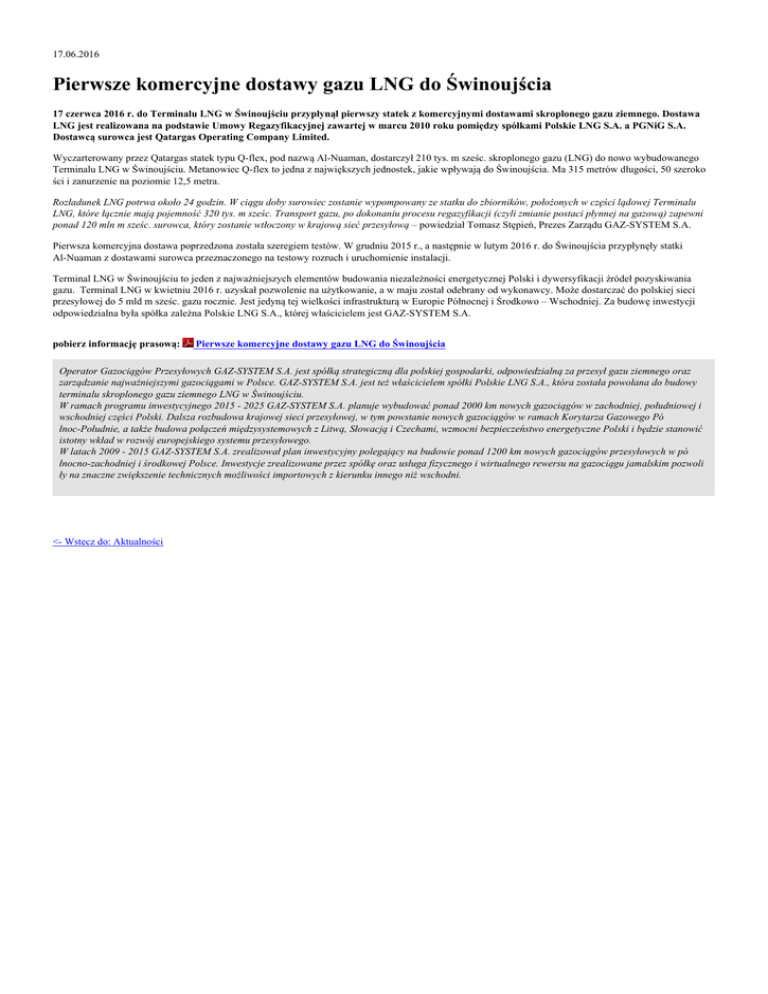 17.06.2016 Pierwsze komercyjne dostawy gazu LNG do Świnoujścia 17 czerwca 2016 r. do Terminalu LNG w Świnoujściu przypłynął pierwszy statek z komercyjnymi dostawami skroplonego gazu ziemnego. Dostawa LNG jest realizowana na podstawie Umowy Regazyfikacyjnej zawartej w marcu 2010 roku pomiędzy spółkami Polskie LNG S.A. a PGNiG S.A. Dostawcą surowca jest Qatargas Operating Company Limited. Wyczarterowany przez Qatargas statek typu Q-flex, pod nazwą Al-Nuaman, dostarczył 210 tys. m sześc. skroplonego gazu (LNG) do nowo wybudowanego Terminalu LNG w Świnoujściu. Metanowiec Q-flex to jedna z największych jednostek, jakie wpływają do Świnoujścia. Ma 315 metrów długości, 50 szeroko ści i zanurzenie na poziomie 12,5 metra. Rozładunek LNG potrwa około 24 godzin. W ciągu doby surowiec zostanie wypompowany ze statku do zbiorników, położonych w części lądowej Terminalu LNG, które łącznie mają pojemność 320 tys. m sześc. Transport gazu, po dokonaniu procesu regazyfikacji (czyli zmianie postaci płynnej na gazową) zapewni ponad 120 mln m sześc. surowca, który zostanie wtłoczony w krajową sieć przesyłową – powiedział Tomasz Stępień, Prezes Zarządu GAZ-SYSTEM S.A. Pierwsza komercyjna dostawa poprzedzona została szeregiem testów. W grudniu 2015 r., a następnie w lutym 2016 r. do Świnoujścia przypłynęły statki Al-Nuaman z dostawami surowca przeznaczonego na testowy rozruch i uruchomienie instalacji. Terminal LNG w Świnoujściu to jeden z najważniejszych elementów budowania niezależności energetycznej Polski i dywersyfikacji źródeł pozyskiwania gazu. Terminal LNG w kwietniu 2016 r. uzyskał pozwolenie na użytkowanie, a w maju został odebrany od wykonawcy. Może dostarczać do polskiej sieci przesyłowej do 5 mld m sześc. gazu rocznie. Jest jedyną tej wielkości infrastrukturą w Europie Północnej i Środkowo – Wschodniej. Za budowę inwestycji odpowiedzialna była spółka zależna Polskie LNG S.A., której właścicielem jest GAZ-SYSTEM S.A. pobierz informację prasową: Pierwsze komercyjne dostawy gazu LNG do Świnoujścia Operator Gazociągów Przesyłowych GAZ-SYSTEM S.A. jest spółką strategiczną dla polskiej gospodarki, odpowiedzialną za przesył gazu ziemnego oraz zarządzanie najważniejszymi gazociągami w Polsce. GAZ-SYSTEM S.A. jest też właścicielem spółki Polskie LNG S.A., która została powołana do budowy terminalu skroplonego gazu ziemnego LNG w Świnoujściu. W ramach programu inwestycyjnego 2015 - 2025 GAZ-SYSTEM S.A. planuje wybudować ponad 2000 km nowych gazociągów w zachodniej, południowej i wschodniej części Polski. Dalsza rozbudowa krajowej sieci przesyłowej, w tym powstanie nowych gazociągów w ramach Korytarza Gazowego Pó łnoc-Południe, a także budowa połączeń międzysystemowych z Litwą, Słowacją i Czechami, wzmocni bezpieczeństwo energetyczne Polski i będzie stanowić istotny wkład w rozwój europejskiego systemu przesyłowego. W latach 2009 - 2015 GAZ-SYSTEM S.A. zrealizował plan inwestycyjny polegający na budowie ponad 1200 km nowych gazociągów przesyłowych w pó łnocno-zachodniej i środkowej Polsce. Inwestycje zrealizowane przez spółkę oraz usługa fizycznego i wirtualnego rewersu na gazociągu jamalskim pozwoli ły na znaczne zwiększenie technicznych możliwości importowych z kierunku innego niż wschodni. <- Wstecz do: Aktualności