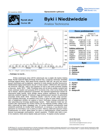 Byki i Niedźwiedzie BRE Bank BRE Bank Securities Opracowanie cykliczne 04 kwietnia 2005 Rynek akcji Byki i Niedźwiedzie Numer 29 Analiza Techniczna 2150 WIG20 Dane podstawowe 2100 Pkt. Indeksy szerokie 2050 WIG WIG20 MIDWiG TechWig 2000 1950 1900 1850 1800 27197.35 1988.63 1733.41 648.75 WigBan. WigBud. WigInf. WigMed. WigSpo. WigTel. 34942.54 19189.43 12305.50 27710.97 22997.87 10530.05 17 24 31 7 February 14 21 28 7 March 14 21 29 4 April 11 18 2 Rys. nr 1 Wig20 - wykres dzienny słupkowy …Czekając na wyrok... Próba zamknięcia okna (2010) zakończyła się w piątek dla byków totalną klapą. Rynek wykonał słabą formację reversal day, a korpusy utworzyły niewielką formację objęcia bessy. Byki będą broniły wsparcia 1982 pkt. ale przy tak nieciekawym zamknięciu jak to piątkowe, wsparcie to może okazać się tylko iluzoryczne. Niedźwiedzie będą zastanawiać się jak w miarę szybko i efektownie zbić poprzednie minimum 1930 pkt. i jeśli w tym tygodniu im się to uda rynek powinien opadać w kierunku strefy 1870 – 1890. Ponieważ karty nie do końca zostały rozdane byki może uratować szybki ruch powyżej 2015 na koniec dnia, choć na tę chwilę może się to okazać jedynie pobożnym życzeniem. Na wykresie tygodniowym doszło do utworzenia białej szpulki, która dodaje więcej znaków zapytania niż rozwiązuje dylematy ostatnich tygodni. W dalszym ciągu podstawowym oporem do pokonania pozostaje strefa okolic 2032. Trendowe adx(9) i adx(14) od kilku sesji wzrostowych opadają informując, że ostatnie ruchy kursu w górę na razie należy rozpatrywać w kategoriach korekty niż wejścia w trend. Kończący miesiąc przyniósł niezbyt optymistyczną formację spadkowego harami. Takie ułożenie może być odczytane jako zaproszenie do zmiany trendu lub do większej korekty całego ruchu który rozpoczął się latem ubiegłego roku. W wyniku ostatnich wzrostowych sesji wskaźniki powróciły do środka stref neutralnych, co oznacza, iż są obecnie przygotowane na mocniejszy ruch w jedną ze stron. Obecny układ jest typowym wręcz oczekiwaniem na wyrok, gdzie jedna ze stron w nadchodzącym czasie powinna doznać mocniejszego uszczuplenia swoich zasobów. Problem leży tylko w tym, iż nie wiadomo, która strona będzie stała pod ścianą. To będzie smutny tydzień. +2.11 +1.43 +0.19 -2.63 +2.11 +2.96 +0.14 -0.78 -0.19 +0.27 +0.64 +3.91 -5.18 +3.22 -3.40 +3.08 Byki 10000 3 10 2005 +1.07 +1.00 +1.95 +0.52 Indeksy sektorowe x100 27 Zmiana % Tydz. Od 1.I.05 1 - Computerland 2 - Kable 3 - KGHM 4 - Optimus 5 - Amica Niedźwiedzie 1 - Apator 2 - Forte 3 - Hoop 4 - MCI 5 - Stalprofil Jacek Borawski (48 22) 697 48 88 [email protected] www.brebrokers.com.pl DI BRE Banku S.A. nie ponosi odpowiedzialności za decyzje inwestycyjne podjęte na podstawie niniejszego opracowania, ani za szkody poniesione w wyniku decyzji inwestycyjnych podjętych na podstawie niniejszego opracowania, które nie jest rekomendacją w rozumieniu Rozporządzenia Rady Ministrów z dnia 21 kwietnia 2004 r. w sprawie informacji stanowiących rekomendacje dotyczące instrumentów finansowych lub ich emitentów. Byki i Niedźwiedzie BRE Bank Byki Computerland 130 Computerland 125 Oczekiwany zasięg - 120 115 110 Kurs - 108,5 zł. Fala spadkowa była gwałtowna, byki liżą rany, ale pojawiła się szansa na odbicie w kierunku linii szyi formacji RGR. Adx(9) jest wszakże bardzo wysoko (53). A Ultimate, który kreśli pozytywne dywergencje i zachęca do krótkoterminowej spekulacji. Wszystko rzecz jasna z obroną po pokonaniu 106,50 zł. 105 100 20000 22 29 6 13 December 20 27 3 10 2005 17 24 31 7 14 February 21 28 7 March 14 21 29 4 April Kable SFK (22.1000, 23.6000, 22.1000, 23.2000, +1.30000) 50 Kable 45 Oczekiwany zasięg - 40 Jeśli byki postanowiły na poważnie ruszyć w górę nie powinny zbijać dna ostatniej świecy z 1 kwietnia (22,10 zł.) 35 Kurs - 23,20 zł. 30 25 10000 September October 100.0% November December 2005 February March April KGHM (30.9000, 31.4000, 30.4000, 30.4000, -0.40000) 40 39 38 37 36 35 61.8% 34 50.0% 33 38.2% 32 23.6% 30 31 29 28 0.0% September October 27 November December 2005 February March April KGHM Kurs - 30,40 zł. Oczekiwany zasięg Ustabilizowanie kursu wokół średnich 15.45.100 i 200 oraz adx(14) na poziomie 14 pkt to sugestia do przyszłego silniejszego ruchu. Byki liczą na zbudowanie prawego ramienia Formacji „Odwróconej RGR”. Jednocześnie powinny pomyśleć o obronie 29,60 intraday lub na koniec dnia. Byki i Niedźwiedzie BRE Bank Optimus Optimus Technologie, Moving Average Ribbon Kurs - 8,35 zł. 10.0 Oczekiwany zasięg 9.5 9.0 Jeśli byki chcą wreszcie w górę na trochę dłużej nie powinny forsować dna białej świecy z 23 marca (7,90 zł.) 8.5 8.0 7.5 2 8 15 22 29 6 13 20 27 3 10 17 24 31 7 14 21 28 7 November December 2005 February March 14 21 29 4 April 38 Amica Wronki (29.5000, 29.5000, 29.1000, 29.5000, +0.10000) 37 36 35 34 33 32 31 Amica Kurs - 29,50 zł. Oczekiwany zasięg Niedźwiedzie bawią się z linią trendu spadkowego, ale muszą uważać bo byki próbują odzyskać świeżość, póki pozostaje nie przebite 28,30 zł. na koniec dnia. Na wykresie tygodniowym pojawiła się ostatnio ważka, która zachęca do odważniejszego wejścia na rynek. 30 29 28 27 50000 October November December 2005 February March April PORTFEL BYKÓW Nazwa spółki byki Groclin GTC Handlowy Data wydania 3.83 21.03.05 14.02.05 28.02.05 28.02.05 21.03.05 21.03.05 Mennica Relpol WSiP z ub tygodnia Efekt 29.03.05 Kredyt B 29.03.05 Redan 29.03.05 Cena wydania Cena obecna Zmiana kursu (%) Warunki wyjścia Poziom ind. WIG Zmiana ind. WIG (%) 96.50 99.30 108.00 63.90 74.10 58.50 112.50 69.10 73.00 60.10 6.90 7.35 2.90 4.17 8.14 -1.48 2.74 6.52 < 97,50 eod < 106 eod < 63,40 eod < 71,00 eod < 58,60 eod < 7,00 eod 26850 27614 28547 28547 26850 26850 1.29 -1.51 -4.73 -4.73 1.29 1.29 10.35 9.45 8.30 11.35 9.60 9.45 9.66 1.59 13.86 < 10,60 eod < 9,15 eod <
