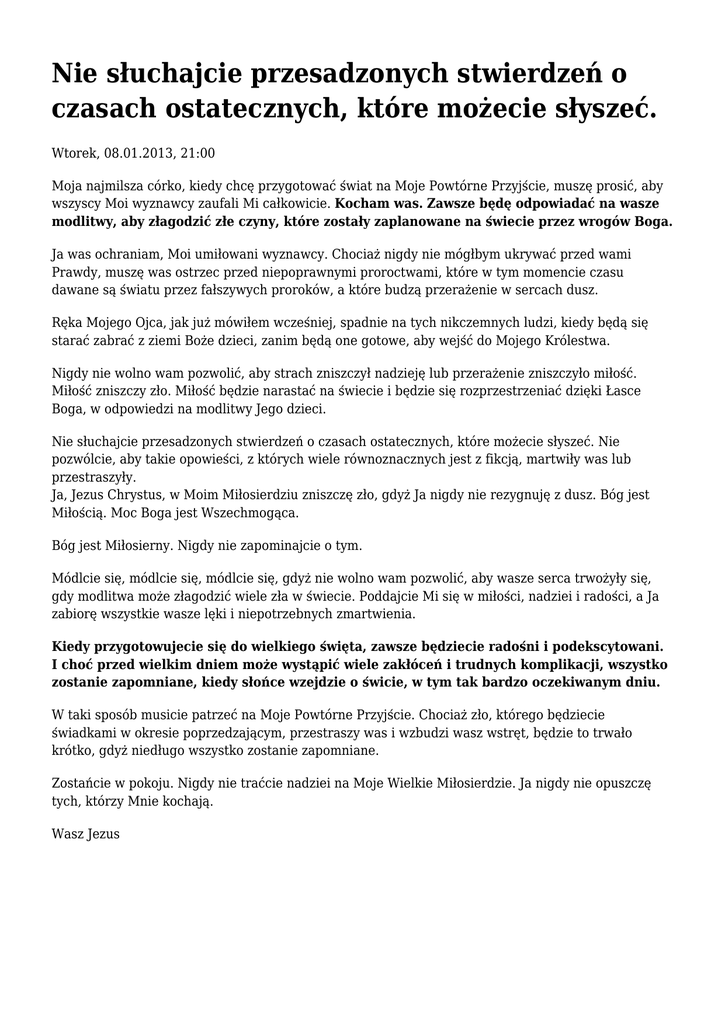 Nie słuchajcie przesadzonych stwierdzeń o czasach ostatecznych, które możecie słyszeć. Wtorek, 08.01.2013, 21:00 Moja najmilsza córko, kiedy chcę przygotować świat na Moje Powtórne Przyjście, muszę prosić, aby wszyscy Moi wyznawcy zaufali Mi całkowicie. Kocham was. Zawsze będę odpowiadać na wasze modlitwy, aby złagodzić złe czyny, które zostały zaplanowane na świecie przez wrogów Boga. Ja was ochraniam, Moi umiłowani wyznawcy. Chociaż nigdy nie mógłbym ukrywać przed wami Prawdy, muszę was ostrzec przed niepoprawnymi proroctwami, które w tym momencie czasu dawane są światu przez fałszywych proroków, a które budzą przerażenie w sercach dusz. Ręka Mojego Ojca, jak już mówiłem wcześniej, spadnie na tych nikczemnych ludzi, kiedy będą się starać zabrać z ziemi Boże dzieci, zanim będą one gotowe, aby wejść do Mojego Królestwa. Nigdy nie wolno wam pozwolić, aby strach zniszczył nadzieję lub przerażenie zniszczyło miłość. Miłość zniszczy zło. Miłość będzie narastać na świecie i będzie się rozprzestrzeniać dzięki Łasce Boga, w odpowiedzi na modlitwy Jego dzieci. Nie słuchajcie przesadzonych stwierdzeń o czasach ostatecznych, które możecie słyszeć. Nie pozwólcie, aby takie opowieści, z których wiele równoznacznych jest z fikcją, martwiły was lub przestraszyły. Ja, Jezus Chrystus, w Moim Miłosierdziu zniszczę zło, gdyż Ja nigdy nie rezygnuję z dusz. Bóg jest Miłością. Moc Boga jest Wszechmogąca. Bóg jest Miłosierny. Nigdy nie zapominajcie o tym. Módlcie się, módlcie się, módlcie się, gdyż nie wolno wam pozwolić, aby wasze serca trwożyły się, gdy modlitwa może złagodzić wiele zła w świecie. Poddajcie Mi się w miłości, nadziei i radości, a Ja zabiorę wszystkie wasze lęki i niepotrzebnych zmartwienia. Kiedy przygotowujecie się do wielkiego święta, zawsze będziecie radośni i podekscytowani. I choć przed wielkim dniem może wystąpić wiele zakłóceń i trudnych komplikacji, wszystko zostanie zapomniane, kiedy słońce wzejdzie o świcie, w tym tak bardzo oczekiwanym dniu. W taki sposób musicie patrzeć na Moje Powtórne Przyjście. Chociaż zło, którego będziecie świadkami w okresie poprzedzającym, przestraszy was i wzbudzi wasz wstręt, będzie to trwało krótko, gdyż niedługo wszystko zostanie zapomniane. Zostańcie w pokoju. Nigdy nie traćcie nadziei na Moje Wielkie Miłosierdzie. Ja nigdy nie opuszczę tych, którzy Mnie kochają. Wasz Jezus