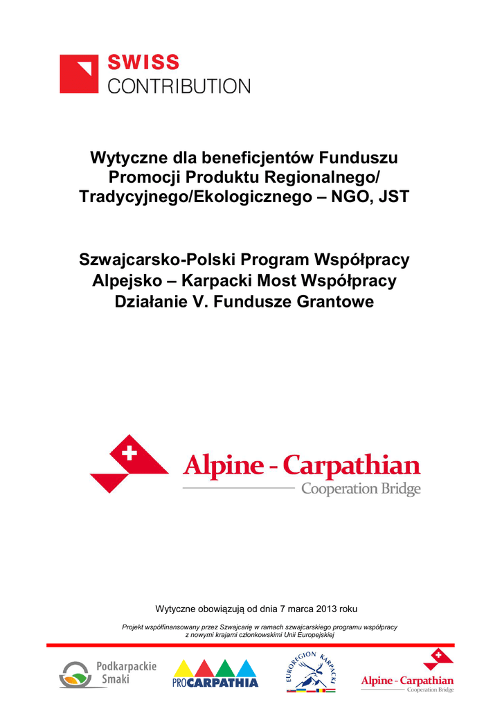 Wytyczne dla beneficjentów Funduszu Promocji Produktu Regionalnego/ Tradycyjnego/Ekologicznego – NGO, JST Szwajcarsko-Polski Program Współpracy Alpejsko – Karpacki Most Współpracy Działanie V. Fundusze Grantowe Wytyczne obowiązują od dnia 7 marca 2013 roku Projekt współfinansowany przez Szwajcarię w ramach szwajcarskiego programu współpracy z nowymi krajami członkowskimi Unii Europejskiej 1 Spis treści 1. INFORMACJE OGÓLNE ......................................................................................... 4 1.1 1.2 1.3 1.4 Informacje ogólne o Szwajcarsko-Polskim Programie Współpracy ......................................... 4 Cel Funduszu Promocji Produktu Regionalnego/Tradycyjnego/ Ekologicznego – NGO, JST (FPPRTEN) ....................................................................................................................... 5 Alokacja Finansowa w ramach naboru .................................................................................... 6 Termin trwania naboru .............................................................................................................. 8 2. INFORMACJE SZCZEGÓŁOWE ............................................................................. 9 2.1. 2.2. 2.3. 2.4. 2.5. 2.6. 2.7. 2.8. Podstawowe definicje ............................................................................................................... 9 Przykładowe typy projektów ................................................................................................... 11 Podmioty mogące ubiegać się o wsparcie ............................................................................. 12 Partnerstwo i kwalifikowalność partnerów.............................................................................. 12 Pozostałe wymagania dotyczące projektów .......................................................................... 13 Wydatki kwalifikowalne i niekwalifikowalne w ramach Funduszu .......................................... 14 Intensywność wsparcia .......................................................................................................... 18 Wkład własny i zabezpieczenie inwestycji ............................................................................. 20 3. ZASADY SPORZĄDZANIA WNIOSKÓW .............................................................. 21 4. ZASADY SKŁADANIA WNIOSKÓW ..................................................................... 22 5. DODATKOWE INFORMACJE DLA WNIOSKODAWCÓW.................................... 23 6. SPOSÓB OCENY I WYBORU PROJEKTÓW........................................................ 24 6.1 6.2 6.3 6.4 6.5 6.6 7. 7.1 7.2 7.3 7.4 7.5 7.6 Ocena formalna ...................................................................................................................... 24 Wzór karty oceny formalnej .................................................................................................... 25 Ocena techniczna (merytoryczna): ........................................................................................ 28 Wzór karty oceny technicznej (merytorycznej) ...................................................................... 32 Powiadomienie o decyzji ........................................................................................................ 35 6.5.1 Treść decyzji: ........................................................................................................... 35 6.5.2 Sugerowany harmonogram .................................................................................... 35 WARUNKI DOTYCZĄCE WDRAŻANIA DZIAŁAŃ NASTĘPUJĄCYCH PO DECYZJI O PRZYZNANIU DOTACJI ....................................................................................................... 36 6.6.1 Przyznanie dotacji: .................................................................................................. 36 REALIZACJA PROJEKTU .................................................................................... 37 Zasady zawierania umów o dofinansowanie projektu ..................................................... 37 Zmiany w umowie o dofinansowanie projektu .................................................................. 38 Rozwiązywanie umowy ........................................................................................................ 39 System raportowania i płatności ........................................................................................ 40 7.4.1 Zasady wypłaty dofinansowania ............................................................................ 40 7.4.2 Zasady dokumentowania wydatków z postępu z realizacji projektu ................. 41 7.4.3 Raport końcowy z realizacji projektu i wniosek o płatność końcową................ 45 7.4.4 Archiwizacja dokumentów ...................................................................................... 49 Monitorowanie i kontrola projektów ................................................................................... 49 Kontrola na miejscu ............................................................................................................. 50 Projekt współfinansowany przez Szwajcarię w ramach szwajcarskiego programu współpracy z nowymi krajami członkowskimi Unii Europejskiej 2 8. POZOSTAŁE KWESTIE ZWIĄZANE Z REALIZACJĄ PROJEKTÓW................... 51 8.1 8.2 8.3 Informacja i promocja ............................................................................................................. 51 Stosowanie Ustawy Prawo Zamówień Publicznych ............................................................... 53 Pomoc publiczna .................................................................................................................... 59 9. ZAŁĄCZNIKI .......................................................................................................... 63 9.1 Formularz wniosku o dofinansowanie projektu w r