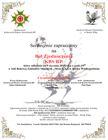 Zjednoczenie Kurkowych Bractw Strzeleckich RP. Kurkowe Bractwo Strzeleckie w Borku Wlkp. Serdecznie zapraszamy na Bal Zjednoczenia KBS RP. który odbędzie się 9 stycznia 2016roku o godz.1900 w Sali Balowej Zakładów Mięsnych „Mróz S.A.” w Borku Wielkopolskim. Z brackim pozdrowieniem Prezes Zjednoczenia Kurkowych Bractw Strzeleckich RP. Adam Gołembowski Prezes Kurkowego Bractwa Strzeleckiego w Borku Wlkp. Leszek Matelski Król Zjednoczenia Kurkowych Bractw Strzeleckich RP. Piotr Sitarz Koszt uczestnictwa – 300 zł od pary. Zgłoszenia prosimy dokonać w terminie do 23.12.2015r. natomiast wpłatę proszę przesłać na konto. Nr konta: KBS Borek Wlkp. BGŻ 02203000451110000004037500 z dopiskiem „ Bal Zjednoczenia 2016” i podaniem ilości par. Rezerwacja noclegów: „Villa Natura” Dolsk ( przewóz na trasie Dolsk – Borek Wlkp. i powrót w cenie noclegu) Tel.061-2825253 lub 601764725 Tel. Kontaktowy Leszek Matelski 602471966 lub Renata Ratajczak 601794010