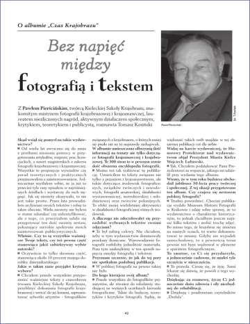 O albumie „Czas Krajobrazu” Bez napięć między Z Pawłem Pierścińskim, twórcą Kieleckiej Szkoły Krajobrazu, znakomitym mistrzem fotografii krajobrazowej i krajoznawczej, laureatem niezliczonych nagród, aktywnym działaczem społecznym, krytykiem, teoretykiem i publicystą, rozmawia Tomasz Kosiński Skąd wziął się pomysł na takie wydawnictwo? Od wielu lat zwracano się do mnie z prośbami niesienia pomocy w przygotowaniu artykułów, rozpraw, prac licencjackich, a nawet magisterskich z zakresu fotografii krajobrazowej i krajoznawczej. Wszystkie te propozycje wywiadów czy porad teoretycznych i praktycznych przyjmowałem z zainteresowaniem. Jednocześnie myślałem sobie, że ja już to przecież tyle razy opisałem w najróżniejszych źródłach i wystarczy do nich sięgnąć. Jak się niestety okazywało, to nie jest takie proste. Przez lata prowadziłem archiwum swoich tekstów i robię to także obecnie. Wielu niestety nie byłem w stanie odszukać czy zidentyfikować, ale z tego, co przejrzałem udało się przygotować ten dość swoisty zestaw, pokazujący szerokie spektrum moich zainteresowań publicystycznych. Właśnie. Czy to są wszystkie ważniejsze Twoje teksty, czy też pewna część stanowiąca jakiś subiektywny wybór autorski? Oczywiście to tylko skromna część, stanowiąca około 10 procent mojego dorobku dziennikarskiego. Jakie w takim razie przyjąłeś kryteria wyboru? Chciałem przede wszystkim przypomnieć ważniejsze teksty z czasookresu trwania Kieleckiej Szkoły Krajobrazu, przybliżyć dokonania fotografii krajobrazowej i wrócić do jej korzeni, zaprezentować sylwetki artystów - fotografików związanych z krajobrazem, o których mniej się pisało niż na to naprawdę zasługiwali. W albumie umieszczono olbrzymią ilość informacji na tematy nie tylko dotyczące fotografii krajoznawczej i krajobrazowej. Te 300 stron to w pewnym sensie dość obszerna encyklopedia fotografii. Można też tak traktować tę publikację. Umieściłem tu teksty związane nie tylko z pejzażem i krajoznawstwem, ale także dotyczące środowisk fotograficznych, związków twórczych i zawodowych, fotografii amatorskiej, działalności wystawienniczej, instruktorskiej i młodzieżowej oraz twórców polonijnych. To efekt mojej wieloletniej aktywności w działalności fotograficznej różnych środowisk. A dlaczego nie zdecydowałeś się przyozdobić wybranych tekstów swoimi zdjęciami? To był zabieg celowy. Nie chciałem, żeby w tym wydawnictwie dominowały przekazy ikoniczne. Wprowadzenie fotografii rozbiłoby jednolitość materiału. Poza tym uniknęliśmy w ten sposób napięcia między fotografią i tekstem. Przyznam szczerze, że jak do tej pory nie spotkałem podobnej publikacji. W polskiej fotografii na pewno takiej nie było. Do kogo kierujesz swój album? Przede wszystkim do fotografików pejzażystów, ale również do młodzieży studiującej na wyższych uczelniach kierunki fotograficzne. Także do badaczy, teoretyków i krytyków fotografii. Sądzę, że 42 fot. T. Kosiński fotografią i tekstem Paweł Pierściński większość takich osób znajdzie w tej obszernej publikacji coś dla siebie. Widzę na karcie wydawniczej, że Honorowy Protektorat nad wydawnictwem objął Prezydent Miasta Kielce Wojciech Lubawski. Tak. Chciałem podziękować Panu Prezydentowi za wsparcie, jakiego mi udzielił przy wydaniu tego albumu. Wiemy, że w tym roku będziesz obchodził jubileusz 50-lecia pracy twórczej i społecznej. Z tej okazji przygotowano ten album. Czy czujesz się nestorem polskiej fotografii? Trudno powiedzieć. Chociaż publikację wydało Muzeum Historii Fotografii w Krakowie i zdaję sobie sprawę, że to wydawnictwo o charakterze historycznym, to jednak chciałbym jeszcze napisać kilka tekstów i zrobić trochę zdjęć. Bo mimo tego, że krajobraz się zmienia na naszych oczach, to warto dokumentować te zmiany. Gdyby nie wypadek samochodowy, to z pewnością teraz pewnie też bym wędrował w plenerze z aparatem fotograficznym. To smutne, co Ci się przydarzyło, a jednocześnie cudowne, że miałeś tyle szczęścia w nieszczęściu. To prawda. Cieszę się, że żyję. Sami lekarze się dziwią, że powoli z tego wychodzę. Dziękując za rozmowę, życzę Ci jednocześnie dużo zdrowia i siły niezbędnej do rehabilitacji. Dziękuję i pozdrawiam czytelników „Dedala”.