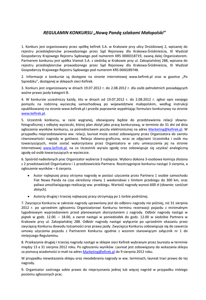 REGULAMIN KONKURSU „Nową Pandą szlakami Małopolski” 1. Konkurs jest organizowany przez spółkę kefirek S.A. w Krakowie przy ulicy Drożdżowej 2, wpisanej do rejestru przedsiębiorców prowadzonego przez Sąd Rejonowy dla Krakowa-Śródmieścia, XI Wydział Gospodarczy Krajowego Rejestru Sądowego pod numerem KRS 0000318719, zwaną dalej Organizatorem. Partnerem konkursu jest spółka Viamot S.A. z siedzibą w Krakowie przy ul. Zakopiańskiej 288, wpisana do rejestru przedsiębiorców prowadzonego przez Sąd Rejonowy dla Krakowa-Śródmieścia, XI Wydział Gospodarczy Krajowego Rejestru Sądowego pod numerem KRS 0000289748. 2. Informacje o konkursie są dostępne na stronie internetowej www.kefirek.pl oraz w gazetce „Po Sąsiedzku”, dostępnej w sklepach sieci Kefirek. 3. Konkurs jest organizowany w dniach 19.07.2012 r. do 2.08.2012 r. dla osób pełnoletnich posiadających ważne prawo jazdy kategorii B. 4. W konkursie uczestniczy każdy, kto w dniach od 19.07.2012 r. do 2.08.2012 r. zgłosi opis swojego pomysłu na rodzinną wycieczkę samochodową po województwie małopolskim, według instrukcji opublikowanej na stronie www.kefirek.pl i prześle poprawnie wypełniając formularz konkursowy na stronie www.kefirek.pl. 5. Uczestnik konkursu, w razie wygranej, obowiązany będzie do przedstawienia relacji słownofotograficznej z odbytej wycieczki, której plan złożył jako pracę konkursową, w terminie do 31 dni od dnia ogłoszenia wyników konkursu, za pośrednictwem poczty elektronicznej na adres [email protected]. W przypadku nieprzedstawienia ww. relacji, laureat może zostać zobowiązany przez Organizatora do zwrotu równowartości nagrody w gotówce. Relacja słowno-graficzna, wraz ze zdjęciami Uczestnika i osób mu towarzyszących, może zostać wykorzystana przez Organizatora w celu umieszczenia jej na stronie internetowej www.kefirek.pl, na co Uczestnik wyraża zgodę oraz zobowiązuje się uzyskać analogiczną zgodę od osób towarzyszących w wycieczce. 6. Spośród nadesłanych prac Organizator wybierze 3 najlepsze. Wyboru dokona 3-osobowa komisja złożona z 2 przedstawicieli Organizatora i 1 przedstawiciela Partnera. Rozstrzygnięcie konkursu nastąpi 3 sierpnia, a ogłoszenie wyników – 6 sierpnia. Autor najlepszej pracy otrzyma nagrodę w postaci użyczenia przez Partnera 1 osobie samochodu Fiat Nowa Panda na czas określony równy 1 weekendowi z limitem przebiegu do 300 km, oraz paliwa umożliwiającego realizację ww. przebiegu. Wartość nagrody wynosi 600 zł (słownie: sześćset złotych). Autorzy drugiej i trzeciej najlepszej pracy otrzymają po 1 torbie podróżnej. 7. Zwycięzca Konkursu w zakresie nagrody uprawniony jest do odbioru nagrody nie później, niż 31 sierpnia 2012 r. po uprzednim zgłoszeniu Organizatorowi Konkursu terminu rezerwacji pojazdu z minimalnym tygodniowym wyprzedzeniem przed planowanym skorzystaniem z nagrody. Odbiór nagrody nastąpi w piątek w godz. 12.00. – 18.00, a zwrot nastąpi w poniedziałek do godz. 12.00 w siedzibie Partnera w Krakowie przy ul. Zakopiańskiej 288. Odbiór nagrody nastąpi wyłącznie po uprzednim okazaniu przez zwycięzcę Konkursu dowodu tożsamości oraz prawa jazdy. Zwycięzca Konkursu zobowiązuje się do zawarcia umowy użyczenia pojazdu z Partnerem Konkursu zgodnie z wzorem stanowiącym załącznik nr 1 do niniejszego Regulaminu. 8. Przekazanie drugiej i trzeciej nagrody nastąpi w sklepie sieci Kefirek wybranym przez laureata w terminie między 13 a 31 sierpnia 2012 roku. Po ogłoszeniu wyników. Laureat jest zobowiązany do wskazania sklepu za pomocą wiadomości e-mail na adres [email protected] do 9 sierpnia 2012 roku. W przypadku niewskazania sklepu oraz nieodebrania nagrody w ww. terminach, laureat traci prawo do tej nagrody. 9. Organizator zastrzega sobie prawo do nieprzyznania jednej lub więcej nagród w przypadku niskiego poziomu zgłoszonych prac. Uczestnicy konkursu poprzez zgłoszenie do konkursu wyrażają zgodę na wykorzystanie imienia i nazwiska w celach związanych z konkursem, w tym do publikacji tych danych na plakacie, stronie www.kefirek.pl, stronie www.facebook.com/sklepKefirek oraz w magazynie „Po Sąsiedzku”. 10. Zgłoszenie do konkursu jest równoznaczne z wyrażeniem zgody na przetwarzanie danych osobowych do celów związanych z konkursem Organizatorowi i Partnerowi konkursu, oraz z przeniesieniem na Organizatora całości majątkowych praw autorskich do nadesłanych prac: planu wycieczki i ew. relacji na następujących polach eksploatacji: a) przeredagowanie i zmianę tekstów, b) drukowanie tekstów na ulotkach i plakatach reklamowych c) zwielokrotnianie określoną techniką tj. powielanie, kopiowanie, skanowanie, przepisywanie, rozpowszechnianie za pomocą mailingu, poczty, umieszczanie na stronach internetowych d) wprowadzania do obrotu, e) wprowadzania do pamięci komputera, f) publicznego odtworzenia i wystąpienia g) wystawienia, h) wyświetlania, i) najmu, j) dzierżawy, k) udzielania licencji na wykorzystanie, l) wykorzystywania w kampanii reklamowej m) odstąpienia odpłatnie lub nieodpłatnie osobom trzecim. 7. Jakakolwiek odpowiedzialność Organizatora ograniczona jest do kwoty 600 zł. Szczegółowe zasady użyczenia Pojazdu, odpowiedzialności za stan Pojazdu oraz odpowiedzialność względem Partnera uregulowana zostanie w odrębnej umowie. Organizator nie ponosi odpowiedzialności za Pojazd, działania lub zaniechania Uczestników lub Partnera. 8. Wartość nagród nie przekracza kwoty 760 zł zatem nie podlega opodatkowaniu 10 % zryczałtowanym podatkiem dochodowym (art. 30 ust. 1 pkt. 68 Ustawy o podatku dochodowym od osób fizycznych). 9. W konkursie nie mogą brać udziału pracownicy Organizatora, ani ich najbliższe rodziny: wstępni, zstępni i małżonkowie. 10. Organizator zastrzega sobie prawo do zmiany regulaminu w czasie trwania konkursu. Załącznik nr 1 – wzór umowy użyczenia samochodu UMOWA UŻYCZENIA SAMOCHODU zaw