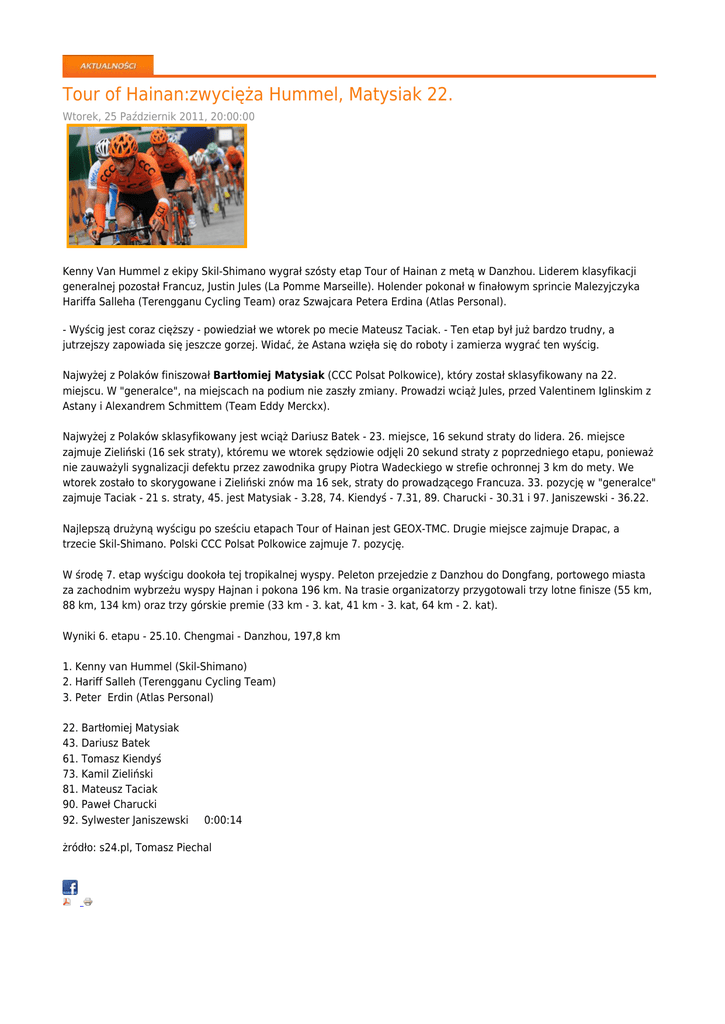 Tour of Hainan:zwycięża Hummel, Matysiak 22. Wtorek, 25 Październik 2011, 20:00:00 Kenny Van Hummel z ekipy Skil-Shimano wygrał szósty etap Tour of Hainan z metą w Danzhou. Liderem klasyfikacji generalnej pozostał Francuz, Justin Jules (La Pomme Marseille). Holender pokonał w finałowym sprincie Malezyjczyka Hariffa Salleha (Terengganu Cycling Team) oraz Szwajcara Petera Erdina (Atlas Personal). - Wyścig jest coraz cięższy - powiedział we wtorek po mecie Mateusz Taciak. - Ten etap był już bardzo trudny, a jutrzejszy zapowiada się jeszcze gorzej. Widać, że Astana wzięła się do roboty i zamierza wygrać ten wyścig. Najwyżej z Polaków finiszował Bartłomiej Matysiak (CCC Polsat Polkowice), który został sklasyfikowany na 22. miejscu. W "generalce", na miejscach na podium nie zaszły zmiany. Prowadzi wciąż Jules, przed Valentinem Iglinskim z Astany i Alexandrem Schmittem (Team Eddy Merckx). Najwyżej z Polaków sklasyfikowany jest wciąż Dariusz Batek - 23. miejsce, 16 sekund straty do lidera. 26. miejsce zajmuje Zieliński (16 sek straty), któremu we wtorek sędziowie odjęli 20 sekund straty z poprzedniego etapu, ponieważ nie zauważyli sygnalizacji defektu przez zawodnika grupy Piotra Wadeckiego w strefie ochronnej 3 km do mety. We wtorek zostało to skorygowane i Zieliński znów ma 16 sek, straty do prowadzącego Francuza. 33. pozycję w "generalce" zajmuje Taciak - 21 s. straty, 45. jest Matysiak - 3.28, 74. Kiendyś - 7.31, 89. Charucki - 30.31 i 97. Janiszewski - 36.22. Najlepszą drużyną wyścigu po sześciu etapach Tour of Hainan jest GEOX-TMC. Drugie miejsce zajmuje Drapac, a trzecie Skil-Shimano. Polski CCC Polsat Polkowice zajmuje 7. pozycję. W środę 7. etap wyścigu dookoła tej tropikalnej wyspy. Peleton przejedzie z Danzhou do Dongfang, portowego miasta za zachodnim wybrzeżu wyspy Hajnan i pokona 196 km. Na trasie organizatorzy przygotowali trzy lotne finisze (55 km, 88 km, 134 km) oraz trzy górskie premie (33 km - 3. kat, 41 km - 3. kat, 64 km - 2. kat). Wyniki 6. etapu - 25.10. Chengmai - Danzhou, 197,8 km 1. Kenny van Hummel (Skil-Shimano) 2. Hariff Salleh (Terengganu Cycling Team) 3. Peter Erdin (Atlas Personal) 22. Bartłomiej Matysiak 43. Dariusz Batek 61. Tomasz Kiendyś 73. Kamil Zieliński 81. Mateusz Taciak 90. Paweł Charucki 92. Sylwester Janiszewski 0:00:14 żródło: s24.pl, Tomasz Piechal