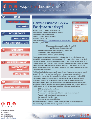 Harvard Business Review. Podejmowanie decyzji Autorzy: Peter F. Drucker, John Hammond, Ralph Keeney, Howard Raiffa, Alden M. Hayashi T³umaczenie: Adriana Ossowska, Tomasz Rzychoñ, Magda Witkowska ISBN: 83-7361-915-1 Tytu³ orygina³u: Harvard Business Review on Decision Making Format: A5, stron: 216 Kluczowe zagadnienia z zakresu teorii i praktyki podejmowania skutecznych decyzji • Rozwijanie umiejêtnoœci w³aœciwej analizy problemów • Pokonywanie barier interpersonalnych • Podejmowanie decyzji w oparciu o intuicjê Nasze ¿ycie prywatne i zawodowe zale¿y w du¿ym stopniu od trafnoœci naszych decyzji. Ich podejmowanie to proces sk³adaj¹cy siê z etapów, które ³atwo wyodrêbniæ i usystematyzowaæ. Skuteczni mened¿erowie wiedz¹, kiedy decyzja ma opieraæ siê na pewnych regu³ach, a kiedy musi zostaæ podjêta w sposób pragmatyczny, na podstawie faktów dotycz¹cych konkretnego przypadku. Szybkoœæ podejmowania decyzji jest wa¿na, ale nie najwa¿niejsza. Kluczowym elementem jest prawid³owa analiza problemu i wszystkich jego aspektów. Niniejsza ksi¹¿ka jest zbiorem artyku³ów poœwiêconych sztuce podejmowania decyzji. Ukaza³y siê one w Harvard Business Review -- cenionym przez mened¿erów, naukowców i przedsiêbiorców czasopiœmie, wydawanym przez jeden z najbardziej presti¿owych uniwersytetów na œwiecie. Autorami artyku³ów s¹ uznani fachowcy z dziedziny zarz¹dzania. W swoich artyku³ach opisuj¹ oni proces podejmowania w³aœciwych decyzji w ró¿nych okolicznoœciach, metody pokonywania ró¿nic pomiêdzy wspó³pracownikami, sposoby racjonalnej analizy problemów oraz sytuacje, w których podejmowanie decyzji pod wp³ywem intuicji jest najlepszym rozwi¹zaniem. • Zdefiniowanie i analiza problemu • Regu³y podejmowania decyzji • Podejmowanie decyzji z uwzglêdnieniem barier interpersonalnych • Przewidywanie konsekwencji podjêtych decyzji • Wprowadzanie decyzji w ¿ycie • Wykorzystywanie przeczuæ i intuicji Ksi¹¿ki z serii Harvard Business Review powinny staæ siê lektur¹ obowi¹zkow¹ dla ambitnych pracowników ka¿dej organizacji na œwiecie. Spis treści Podejmowanie skutecznych decyzji 7 PETER F. DRUCKER Równe zamiany (ang. even swaps) – metoda racjonalnego osiągania kompromisu 29 JOHN S. HAMMOND, RALPH L. KEENEY I HOWARD RAIFFA Pokorne podejmowanie decyzji 55 AMITAI ETZIONI Bariery interpersonalne a proces podejmowania decyzji 71 CHRIS ARGYRIS Czy potrafisz dokonać analizy tego problemu? 113 PERRIN STRYKER Jak dokonać analizy tego problemu? Część II ćwiczenia dla menedżerów 129 PERRIN STRYKER Myślowe pułapki, które prowadzą do złych decyzji 161 JOHN S. HAMMOND, RALPH L. KEENEY I HOWARD RAIFFA Kiedy należy zaufać przeczuciom? 189 ALDEN M. HAYASHI O autorach 211 Podejmowanie skutecznych decyzji PETER F. DRUCKER R Y Z Y K O W N E O S Ą D Y , których muszą dokonać zarządzający, są rzadkie, ale za to bardzo ważne. Można je lepiej zrozumieć, rozbijając proces decyzyjny na sześć kolejnych kroków. S K U T E C Z N I Z A R Z Ą D Z A J Ą C Y nie podejmują dużej ilości decyzji. Koncentrują się natomiast na kwestiach szczególnie istotnych. Starają się podejmować jedynie kilka najważniejszych decyzji na najwyższym poziomie ogólności. Próbują znaleźć w danej sytuacji względną stałość, by móc ją przemyśleć na poziomie strategicznym, ogólnym, niż po prostu „rozwiązać problem”. Dlatego też nie wywiera na nich wrażenia szybkość podejmowania decyzji — nadmierna wirtuozeria w operowaniu wieloma zmiennymi jest dla nich przejawem niestaranności. Zarządzający chcą wiedzieć, co wiąże się z daną decyzją, a także znać warunki, jakie muszą być spełnione. Dla nich liczy się skutek, a nie metody jego osiągnięcia. Wolą okazać się ludźmi rozsądnymi niż sprytnymi. 8 Drucker Skuteczni menedżerowie wiedzą, kiedy decyzja powinna opierać się na ogólnych regułach, a kiedy powinna być podejmowana w sposób pragmatyczny, na podstawie faktów dotyczących konkretnego przypadku. Wiedzą, że najtrudniejsza decyzja to wybór między dobrym a złym kompromisem — nauczyli się też rozpoznawać tę różnicę. Zdają sobie sprawę, że najbardziej czasochłonnym etapem tego procesu nie jest samo podejmowanie decyzji, ale wprowadzanie jej w życie. Dopóki nie przekształci się ona w działanie, nie jest decyzją — można ją w najlepszym wypadku nazwać pobożnym życzeniem. Oznacza to, że podczas gdy skuteczna decyzja jest podejmowana na wysokim poziomie ogólności, zaplanowane na jej podstawie działania muszą możliwie najlepiej korespondować z umiejętnościami osób, które będą je wykonywać. Poza tym skuteczni zarządzający wiedzą, że podejmowanie decyzji to pewien systematyczny proces składający się z etapów, które łatwo wyszczególnić. Kolejne kroki Samo wykonywanie kolejnych kroków nie sprawi, że decyzja „się podejmie”. Właściwie każda decyzja polega na ocenie ryzyka. Jednakże, jeśli poszczególne etapy nie będą stanowić spójnej sekwencji, nie uda się podjąć słusznej, a już na pewno skutecznej decyzji. Dlatego też opiszę w tym artykule kolejne etapy, które składają się na cały proces podejmowania decyzji. 1. Klasyfikacja problemu. Czy jest on ogólny, powtarzalny? Czy może jest wyjątkowy lub szczegółowy? Może jest przejawem nowego typu problemów, dla którego trzeba opracować nowe reguły? 2. Zdefiniowanie problemu. Z czym mamy do czynienia? Podejmowanie skutecznych decyzji 9 3. Określenie założeń dotyczących rozwiązania pro- blemu. Jakie są warunki brzegowe? 4. Określenie najlepszego sposobu działania, prowa- dzącego do spełnienia warunków brzegowych, a nie jedynie akceptowalnego. Określenie, jakie kroki należałoby podjąć, by w najlepszy sposób rozwiązać problem, zanim uwaga zostanie skoncentrowana na realnych możliwościach — kompromisach, adaptacjach lub ustępstwach niezbę