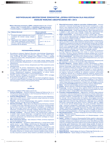 INDYWIDUALNE UBEZPIECZENIE ZDROWOTNE „OPIEKA SZPITALNA DLA MALUSZKA” OGÓLNE WARUNKI UBEZPIECZENIA NR 1/2016 9. Wykaz informacji zawartych w OWU, o których mowa w art. 17 ust 1 ustawy z dnia 11 września 2015 r. o działalności ubezpieczeniowej i reasekuracyjnej, z uwzględnieniem definicji z OWU („Skorowidz”). L.p. Rodzaj informacji 1. 2. Przesłanki wypłaty odszkodowania i innych świadczeń lub wartości wykupu ubezpieczenia Ograniczenia oraz wyłączenia odpowiedzialności zakładu ubezpieczeń uprawniające do odmowy wypłaty odszkodowania i innych świadczeń lub ich obniżania 10. Numer jednostki redakcyjnej wzorca umowy - § 3 ust 2 - 3 - § 5 ust 1 – 3, ust 6, ust 11 - 12 - § 8 ust 1 - §4 - § 5 ust 5, 7, 10, 13 i 14 - §7 - § 8 ust 2 - 3 11. 12. §1 13. POSTANOWIENIA OGÓLNE 1. 2. 3. 4. 5. 6. Na podstawie niniejszych Ogólnych Warunków Indywidualnego Ubezpieczenia Zdrowotnego “Opieka Szpitalna dla Maluszka” (dalej w skrócie „OWU”) Medicover Försäkrings AB (publ.) działające przez Oddział w Polsce z siedzibą w Warszawie (zwane dalej „Ubezpieczycielem”) zawiera Umowy ubezpieczenia z osobami fizycznymi. Umowa ubezpieczenia jest zawierana na rzecz osoby trzeciej, będącej osobą fizyczną (zwanej dalej „Ubezpieczonym”), na warunkach określonych w Umowie ubezpieczenia. Potwierdzeniem zawarcia Umowy ubezpieczenia jest Polisa wystawiona przez Ubezpieczyciela. Za zgodą stron do Umowy ubezpieczenia mogą zostać wprowadzone warunki szczególne, odbiegające od postanowień niniejszych OWU, które mają pierwszeństwo przed zapisami OWU. W takim przypadku, przed zawarciem umowy, Ubezpieczyciel przedstawi Ubezpieczającemu na piśmie różnice pomiędzy postanowieniami OWU a Umową ubezpieczenia. Wszelkie regulacje odbiegające od postanowień niniejszych OWU wymagają formy pisemnej pod rygorem ich nieważności. W sprawach nieuregulowanych w OWU lub warunkach szczególnych mają zastosowanie przepisy Kodeksu Cywilnego oraz inne przepisy prawa powszechnie obowiązującego na obszarze Rzeczpospolitej Polskiej. 14. 15. 16. 17. 18. 19. 20. §2 DEFINICJE Przez użyte w niniejszych OWU pojęcia rozumie się: 1. Centrum Medicover – Placówka Medyczna należąca do Medicover Sp. z o. o. i/lub Placówka Medyczna będąca w sieci franczyzowej Medicover Sp. z o. o., z wyłączeniem Szpitali Medicover. 2. Centrum Obsługi Klienta – infolinia, w ramach której na rzecz Ubezpieczonego można umówić termin i miejsce wykonania usługi medycznej lub uzyskać informacje na temat ubezpieczenia. 3. Choroba – stan zdrowia Ubezpieczonego, który zgodnie z aktualnym stanem wiedzy medycznej, wymaga leczenia lub diagnostyki. 4. Choroba przewlekła – dający objawy lub zdiagnozowany lub leczony w okresie 12 miesięcy przed Datą rozpoczęcia ochrony stan chorobowy charakteryzujący się powolnym rozwojem oraz długookresowym przebiegiem, wymagający stałego lub okresowego leczenia i/lub rehabilitacji, charakteryzujący się okresami zaostrzenia, zmniejszenia lub czasowego ustąpienia objawów albo będący przyczyną hospitalizacji w okresie 12 miesięcy przed Datą rozpoczęcia ochrony. 5. Choroba wrodzona – zaburzenie budowy i/lub funkcjonowania organizmu na każdym etapie rozwoju płodowego, w szczególności choroby obecne przy urodzeniu, wady wrodzone rozpoznane na każdym etapie życia, choroby uwarunkowane genetycznie oraz konsekwencje zdrowotne wynikające ze wszystkich wymienionych stanów. 6. Data rozpoczęcia ochrony – data wskazana w Polisie, od której rozpoczyna się ochrona ubezpieczeniowa. 7. Hot Line Medicover – 24-godzinna usługa telefoniczna, w ramach której można uzyskać pomoc w razie Nagłego zachorowania lub Nieszczęśliwego wypadku Ubezpieczonego, zgodnie z przysługującym mu Zakresem ubezpieczenia. 8. Implant - element wykonany z biomateriału, umieszczony w organizmie w celu uzupełnienia lub zastąpienia tkanek narządu (albo jego części) lub w celu spełniania (albo wspomagania) ich funkcji oraz w celu wykonania danej procedury medycznej. Za implanty uważa się m.in. protezy stawów, sztuczne więzadła, protezy naczyniowe, filtry naczyniowe, soczewki, stenty metalowe i powlekane, stymulatory serca. 21. 22. 23. 24. 25. 26. 1 XC_MC00DC_0130_077_OWU.indd 1 Materiały/instrumenty medyczne potrzebne śródoperacyjnie - elementy wykonane z materiału tkankowego lub biomateriału umieszczone w organizmie w celu uzupełnienia tkanek narządu lub w celu wspomagania ich funkcji, a których wprowadzenie jest etapem wykonania danej procedury a nie jej celem. Miesiąc ubezpieczenia – miesiąc rozpoczynający się w Dacie rozpoczęcia ochrony, a następnie w takim samym dniu kolejnego miesiąca Roku ubezpieczeniowego, a jeżeli nie ma takiego dnia w danym miesiącu w ostatnim dniu tego miesiąca. Nagłe zachorowanie – stan chorobowy powstały w sposób nagły i niezamierzony, w okresie odpowiedzialności Ubezpieczyciela, bezpośrednio zagrażający życiu lub zdrowiu Ubezpieczonego, wymagający udzielenia natychmiastowej pomocy lekarskiej i poddania się leczeniu. Nieszczęśliwy wypadek – nagłe zdarzenie, wywołane wyłącznie przyczyną zewnętrzną, powstałe w okresie odpowiedzialności Ubezpieczyciela, w wyniku którego Ubezpieczony, niezależnie od swojej woli, doznał fizycznych obrażeń ciała. Za Nieszczęśliwy wypadek nie uważa się zawału serca, udaru mózgu czy jakichkolwiek innych chorób, w tym występujących nagle. Ubezpieczeniem objęte są bezpośrednie następstwa Nieszczęśliwego wypadku, czyli takie które wystąpiły i podlegały diagnostyce i/lub leczeniu w terminie 7 dni od daty Nieszczęśliwego wypadku. Obszar udzielania świadczeń – obszar, w obrębie którego świadczone są usługi Pogotowia Ratunkowego oraz wizyty w miejscu zachorowania. Informacja o aktualnym obszarze udzielania świadczeń dostępna jest na stronie internetowej www.medicover.pl oraz pod numerem Centrum Obsługi Klient