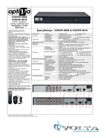 VODVR 9008 VODVR 9016 8 &16 - kanałowy cyfrowy rejestrator wizji Pentapleks - H.264 Real-Time - Algorytm kompresji wideo H.264 - Algorytm kompresji audio G.711U, 64K/sek. - Pentapleks – podgląd na żywo, odtwarzanie, archiwizacja lokalna, odtwarzanie i archiwizacja zdalna poprzez sieć - Zapis jednoczesny maks. 25kl/sek. dla wszystkich kamer - REAL-TIME w rozdz. CIF - Dualny strumień wideo: MAIN-Główny (Zapis & Sieć) / SUB-Podstrumień (Sieć) - Odtwarzanie wszystkich kanałów jednocześnie - Blokowanie fragmentów nagrań przed nadpisaniem - 6 stopni jakości kompresji obrazu - 4 tryby zapisu: ręczny, harmonogram, wideodetekcja, alarm - Indywidualne ustawienia audio & wideo dla każdego kanału osobno - 4 strefy prywatności na każdy kanał - CMS – Aplikacja centralnego zarządzania i monitoringu kilkunastu rejestratorów - Funkcja sieciowego „wielodostepu” MultiCast - PRE-Alarm – buforowanie i rejestracja nagrań nawet do 5 sekund sprzed wzbudzenia zapisu - zoom cyfrowy dla podglądu na żywo i odtwarzania - Monitor Główny – BNC lubVGA/HDMI - Monitor SPOT – BNC lub VGA/HDMI zarządzany z podziałami ekranowymi - Regulacja jasności, koloru i kontrastu dla każdego kanału indywidualnie, nawet dla dwóch różnych przedziałów czasowych (np. różne na noc i dzień) - Funkcja automatycznego przełączania sekwencyjnego kamer - Archiwizacja: USB, HDD, CMS, Klient Siec. - Rozszerzone zarządzanie dyskami HDD: formatowanie, weryfikacja uszkodzonych sektorów, zarządzanie zasilaniem i temperaturą - Alarmy lokalne: zanik obrazu, wideo-detekcja, błąd HDD, brak miejsca na dysku HDD, uszkodzony sektor HDD, błąd wideo - Obsługa strumieniowania sieciowego RTSP - Alarmy zdalne - zanik obrazu, wideo-detekcja - Diagnostyka obciążenia sieci - Wzbudzanie zapisu z wideo-detekcji również innych powiązanych kamer - Intercom komunikacyjny - Notyfikacja e-mail – typ, numer kanału, zdjęcie - Dziennik zdarzeń systemowych i alarmowych - Podgląd mobilny (IPhone, Android) Specyfikacja: VODVR 9008 & VODVR 9016 Sygnał wideo Tor audio Wyświetlanie Wejścia Wejścia/wejścia Nagrywanie Odświeżanie Rozdzielczość wyświetlania Tryby wyświetlania Monitor główny & SPOT System OS Tryb pracy Kompresja Rozdzielczość Tryby nagrywania Nagrywanie Prędkoś nagrywania Wielkość klatki Dyski twarde Zdalny dostęp przez Internet Tryb odtwarzania Odtwarzanie Tryb podziału ekranu Wyszukiwanie nagrań Sterowanie alarmem Reakcja na Alarm Wyjście Zdalne obsługa Przeglądarka nagrań Nagrywanie lokalne Praca sieciowa Konfiguracja zdalna Aplikacja CMS Sub-Stream Archiwizacja nagrań W standardzie Pilot IR i Mysz USB: * Urządzenie sprzedawane jest bez dysków twardych HDD ** Dane techniczne podane w karcie katalogowej mogę ulec zmianie Zasilanie Wymiary Masa 8 x BNC 75 Ohm 16 x BNC 75 Ohm 1 x RCA (Line In / Intecom) / 1 x RCA (Line Out) Mono G.711U 64K / sek. Do 200 klatek (8 kanałów) Do 400 klatek (16 kanałów) BNC: 720x576 (PAL) HDMI/VGA: 1024x768/1280x720/1280x1024/1600x1200/1920x1080p x1, 2x2, 3x3, 4x4 (16ch), sekwencja 1 x BNC 1Vpp 75Ohm & 1x VGA/HDMI – Zarządzane RTOS Pentapleks – Podgląd, Nagrywanie, Odtwarzanie/Archiwizacja, Zdalny podgląd, Zdalne Odtwarzanie/Archiwizacja H.264 QCIF: 176x144 / CIF: 360x288 / 2CIF: 720x288 / 4CIF: 720x576 Harmonogram, Alarmowy, Wideo-detekcja, Ręczny PRE-Alarm (maks. 5 sekund na kanał) Ch 1~8: 25kl/sek dla QCIF & CIF Ch 1~16: 25kl/sek dla QCIF & lub 8kl/sek dla 2CIF & 4CIF CIF lub 6kl/sek dla 2CIF & 4CIF Ch 1: 25kl/sek dla 4CIF & Ch Ch 1: 25kl/sek dla 4CIF & Ch 2~8: 25kl/sek dla QCIF & CIF 2~16: 25kl/sek dla QCIF & CIF PAL : 2 ~ 20 KB 1x HDD SATA (maks. 4TB/szt.) TAK – Maks. 10 Użytkowników Szybkość: x1, x2, x4, x8, 16x / Powolne: x1/2 ~ x1/64 Pojedynczy, 2x2, 3x3 4x4 (16ch) Num. Kanału, Kalendarza, Daty i Czasu, Zdarzeń alarmowych Brzęczyk, E-Mail (+zdjęcie) TCP/IP, SNMP, DHCP, NTP, Multicasting, RTSP CMS(Serwer/Terminal), Zdalny Klient, WWW, Mobilny TAK – USB, HDD, CMS, Klient sieciowy, WWW TAK – Klient sieciowy, CMS TAK – CMS, WWW, Klient sieciowy Podgląd, Odtwarzanie, Archiwizacja, Nagrywanie lokalne Personalizacja profili użytkowników, Maks. podział 10x10 na monitor Ch 1~8: 6kl/sek dla CIF & Ch 1~16: 6kl/sek dla CIF & 25kl/sek dla QCIF 25kl/sek dla QCIF CMS, Klient sieciowy, WWW, USB, HDD 12VDC / 4A (z dyskiem HDD) 315mm x 230mm x 45mm ~ 6kg (z dyskiem HDD)