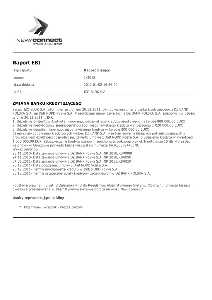 Raport EBI typ raportu Raport bieżący numer 1/2012 data dodania 2012-01-02 16:36:20 spółka IZO-BLOK S.A. ZMIANA BANKU KREDYTUJĄCEGO Zarząd IZO-BLOK S.A. informuje, że z dniem 20.12.2011 roku dokonano zmiany banku kredytującego z DZ BANK POLSKA S.A. na DnB NORD Polska S.A. Przedmiotem umów zawartych z DZ BANK POLSKA S.A. spłaconych w całości w dniu 30.12.2011 r. Było: 1. Udzielenie Emitentowi krótkoterminowego, odnawialnego kredytu obrotowego na kwotę 800 000,00 EURO. 2. Udzielenie kredytobiorcy średnioterminowego, nieodnawialnego kredytu wynoszącego 1 020 000,00 EURO. 3. Udzielenie długoterminowego, nieodnawialnego kredytu w kwocie 200 000,00 EURO. Celem spłaty zobowiązań kredytowych wobec DZ BANK S.A. oraz finansowania bieżących potrzeb związanych z prowadzeniem działalności gospodarczej, zawarto umowę z DnB NORD Polska S.A. o udzielenie kredytu w wysokości 1 000 000,00 EUR. Zabezpieczenie kredytu stanowi nieruchomość położona przy ul. Narutowicza 15 dla której Sąd Rejonowy w Chorzowie prowadzi księgę wieczystą o numerze KA1C/00024456/9. Wykaz terminów: 23.11.2010- Data zawarcia umowy z DZ BANK Polska S.A. NR 2010/RB/0089 24.11.2010- Data zawarcia umowy z DZ BANK Polska S.A. NR 2010/KI/0090 04.05.2011- Data zawarcia umowy z DZ BANK Polska S.A. NR 2011/KI/0059 20.12.2011- Data podpisania umowy z DnB NORD Polska S.A. 28.12.2011- Termin uruchomienia kredytu w DnB NORD Polska S.A. 30.12.2011- Termin ostatecznej spłaty kredytów zaciągniętych w DZ BANK POLSKA S.A. Podstawa prawna: § 3 ust. 2 Załącznika Nr 3 do Regulaminu Alternatywnego Systemu Obrotu "Informacje bieżące i okresowe przekazywane w alternatywnym systemie obrotu na rynku New Connect". Osoby reprezentujące spółkę: Przemysław Skrzydlak - Prezes Zarządu