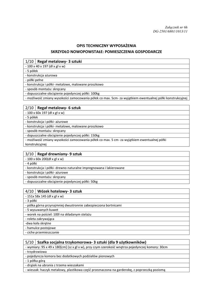 Załącznik nr 6h DG-2501/6801/1013/11 OPIS TECHNICZNY WYPOSAŻENIA SKRZYDŁO NOWOPOWSTAŁE: POMIESZCZENIA GOSPODARCZE 1/10 Regał metalowy- 3 sztuki - 100 x 40 x 197 (dł x gł x w) - 5 półek - konstrukcja ażurowa - półki pełne - konstrukcja i półki- metalowe, malowane proszkowo - sposób montażu: skręcany - dopuszczalne obciążenie pojedynczej półki: 100kg - możliwośd zmiany wysokości zamocowania półek co max. 5cm- za wyjątkiem ewentualnej półki konstrukcyjnej 2/10 Regał metalowy- 6 sztuk - 100 x 60x 197 (dł x gł x w) - 5 półek - konstrukcja i półki- ażurowe - konstrukcja i półki- metalowe, malowane proszkowo - sposób montażu: skręcany - dopuszczalne obciążenie pojedynczej półki: 150kg - możliwośd zmiany wysokości zamocowania półek co max. 5 cm- za wyjątkiem ewentualnej półki konstrukcyjnej 3/10 Regał drewniany- 9 sztuk - 100 x 60x 200(dł x gł x w) - 4 półki - konstrukcja i półki- drewno naturalne impregnowana i lakierowane - konstrukcja i półki- ażurowe - sposób montażu: skręcany - dopuszczalne obciążenie pojedynczej półki: 50kg 4/10 Wózek hotelowy- 3 sztuk - 151x 58x 145 (dł x gł x w) - 3 półki - pólka górna przynajmniej dwustronnie zabezpieczona bortnicami - 5 wysuwanych kuwet - worek na pościel: 100l na składanym stelażu - roleta zakrywająca -dwa koła skrętne - hamulce postojowe - ciche przemieszczanie 5/10 Szafka socjalna trzykomorowa- 3 sztuki (dla 9 użytkowników) - wymiary: 95 x 49 x 180[cm] (sz x gł x w), przy czym szerokośd wnętrza pojedynczej komory: 30cm - trzydrzwiowa - pojedyncza komora bez dodatkowych podziałów pionowych - 1 półka górą - drążek na ubrania z trzema wieszakami - wieszak: haczyk metalowy, plastikowa częśd przeznaczona na garderobę, z poprzeczką poziomą - na ściance bocznej 2 haczyki ubraniowe - całośd wykonana z blachy czarnej 1mm, malowana proszkowo- należy przyjąd dwa kolory (korpus i front)- do wyboru Zamawiającego - na cokole - w drzwiach otwory wentylacyjne - zamek krzywkowy, szyld zamka zlicowany z frontem drzwi - każda z komór ma posiadad własny, niepowtarzalny wzór klucza (do każdej komory Wykonawca dostarczy komplet dwóch kluczy) 6/10 Szafka pod zlewozmywak- 1 sztuka - 60 x 56x 82 *cm+(sz x gł x w) - dwudrzwiowa - korpus: płyta wiórowa laminowana dwustronnie, gr. 18mm - plecki: z płyty pilśniowej twardej laminowanej jednostronnie, gr. 4mm - krawędzie: zabezpieczone obrzeżem ABS, gr.2mm, klejone na gorąco - front: płyta wiórowa laminowana dwustronnie, gr. 18mm - korpus szuflady: płyta wiórowa laminowana dwustronnie, gr. 18mm - uchwyty: metalowe, proste, kolor: satyna chrom, rozstaw: 220mm, - nóżki z możliwością poziomowania, osłonięte cokołem z płyty meblowej, wys. 5cm 7/10 Blat - płyta MDF gr.38mm, laminowana dwustronnie, na wierzchu laminat HPL - nie dopuszcza się podziałów blatu wzdłuż jednej ściany - wycięcie w blacie na zlewozmywak - krawędzie: wyoblone 8/10 Lodówka - chłodziarka podblatowa, do zabudowy - 56 x55 x 80*cm+ (sz x gł x w) - pojemnośd: 130l - automatyczne rozmrażanie - klasa energetyczna A - półki: druciane, regulowane, 3szt. - drzwi lewe, z balkonikami (3 szt.) - poziom hałasu: maksymalnie 36dB - data wprowadzenia na rynek polski nie starsza niż dwa lata przed dniem złożenia oferty - zabudowa w standardzie i kolorze pozostałych mebli kuchennych 9/10 Szafka dolna z szufladą - 1 sztuka - 90 x 56x 82*cm+(sz x gł x w) - 1 szuflada o wysokości 150mm, - poniżej szuflady szafka dwudrzwiowa z 1 półką w środku wysokości - korpus: płyta wiórowa laminowana dwustronnie, gr. 18mm - plecki: z płyty pilśniowej twardej laminowanej jednostronnie, gr. 4mm - krawędzie: zabezpieczone obrzeżem ABS, gr.2mm, klejonym na gorąco - front: płyta wiórowa laminowana dwustronnie, gr. 18mm - korpus szuflady: płyta wiórowa laminowana dwustronnie, gr. 18mm - dno szuflady: płyta HDF, lakierowana, biała - pólka: płyta wiórowa laminowana dwustronnie, gr. 18mm - uchwyty: metalowe, proste, kolor: satyna chrom, rozstaw: 220mm, - nóżki z możliwością poziomowania, osłonięte cokołem z płyty meblowej, wys. 5cm 10/10 Szafka górna - 1 sztuka - 600 x 32x 72*cm+(sz x gł x w) - dwudrzwiowa - wewnątrz 2 półki (3 przestrzenie) - korpus: płyta wiórowa laminowana dwustronnie, gr. 18mm - plecki: z płyty pilśniowej twardej laminowanej jednostronnie, gr. 4mm - krawędzie: zabezpieczone obrzeżem ABS, gr.2mm, klejonym na gorąco - front: płyta wiórowa laminowana dwustronnie, gr. 18mm - półki: płyta wiórowa laminowana dwustronnie, gr. 18mm - uchwyty: metalowe, proste, kolor: satyna chrom, rozstaw: 220mm,