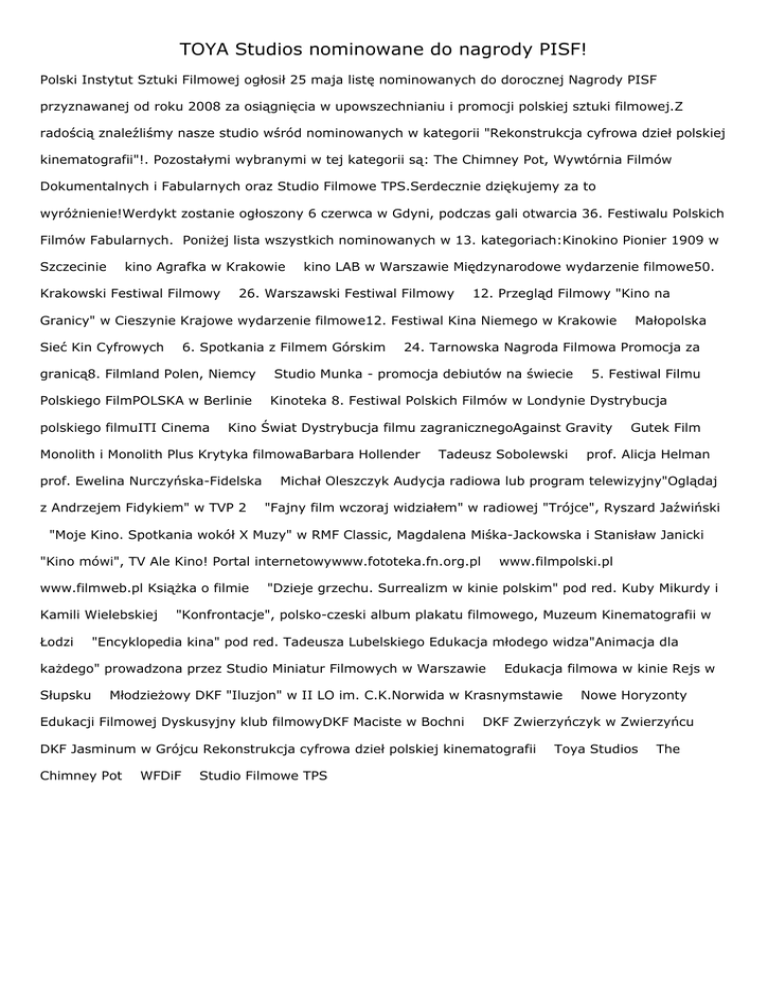 TOYA Studios nominowane do nagrody PISF! Polski Instytut Sztuki Filmowej ogłosił 25 maja listę nominowanych do dorocznej Nagrody PISF przyznawanej od roku 2008 za osiągnięcia w upowszechnianiu i promocji polskiej sztuki filmowej.Z radością znaleźliśmy nasze studio wśród nominowanych w kategorii "Rekonstrukcja cyfrowa dzieł polskiej kinematografii"!. Pozostałymi wybranymi w tej kategorii są: The Chimney Pot, Wywtórnia Filmów Dokumentalnych i Fabularnych oraz Studio Filmowe TPS.Serdecznie dziękujemy za to wyróżnienie!Werdykt zostanie ogłoszony 6 czerwca w Gdyni, podczas gali otwarcia 36. Festiwalu Polskich Filmów Fabularnych. Poniżej lista wszystkich nominowanych w 13. kategoriach:Kinokino Pionier 1909 w Szczecinie kino Agrafka w Krakowie Krakowski Festiwal Filmowy kino LAB w Warszawie Międzynarodowe wydarzenie filmowe50. 26. Warszawski Festiwal Filmowy 12. Przegląd Filmowy "Kino na Granicy" w Cieszynie Krajowe wydarzenie filmowe12. Festiwal Kina Niemego w Krakowie Sieć Kin Cyfrowych 6. Spotkania z Filmem Górskim granicą8. Filmland Polen, Niemcy Polskiego FilmPOLSKA w Berlinie polskiego filmuITI Cinema 24. Tarnowska Nagroda Filmowa Promocja za Studio Munka - promocja debiutów na świecie 5. Festiwal Filmu Kinoteka 8. Festiwal Polskich Filmów w Londynie Dystrybucja Kino Świat Dystrybucja filmu zagranicznegoAgainst Gravity Monolith i Monolith Plus Krytyka filmowaBarbara Hollender prof. Ewelina Nurczyńska-Fidelska z Andrzejem Fidykiem" w TVP 2 Małopolska Tadeusz Sobolewski Gutek Film prof. Alicja Helman Michał Oleszczyk Audycja radiowa lub program telewizyjny"Oglądaj "Fajny film wczoraj widziałem" w radiowej "Trójce", Ryszard Jaźwiński "Moje Kino. Spotkania wokół X Muzy" w RMF Classic, Magdalena Miśka-Jackowska i Stanisław Janicki "Kino mówi", TV Ale Kino! Portal internetowywww.fototeka.fn.org.pl www.filmweb.pl Książka o filmie Kamili Wielebskiej Łodzi www.filmpolski.pl "Dzieje grzechu. Surrealizm w kinie polskim" pod red. Kuby Mikurdy i "Konfrontacje", polsko-czeski album plakatu filmowego, Muzeum Kinematografii w "Encyklopedia kina" pod red. Tadeusza Lubelskiego Edukacja młodego widza"Animacja dla każdego" prowadzona przez Studio Miniatur Filmowych w Warszawie Słupsku Edukacja filmowa w kinie Rejs w Młodzieżowy DKF "Iluzjon" w II LO im. C.K.Norwida w Krasnymstawie Edukacji Filmowej Dyskusyjny klub filmowyDKF Maciste w Bochni DKF Zwierzyńczyk w Zwierzyńcu DKF Jasminum w Grójcu Rekonstrukcja cyfrowa dzieł polskiej kinematografii Chimney Pot WFDiF Studio Filmowe TPS Nowe Horyzonty Toya Studios The