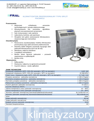 KLIMASKLEP, ul. Legionów Dąbrowskiego 4, 70-337 Szczecin tel.: (091) 432-43-42, fax.: (091) 432-43-40 e-mail: [email protected], www: www.KlimaSklep.pl KLIMATYZATOR PROFESJONALNY TYPU SPLIT FACSW22 Przeznaczenie: Miejscowe schładzanie procesów technologicznych i sprzętu elektronicznego Klimatyzowanie hal, namiotów, ogródków piwnych oraz pomieszczeo serwerowni Sale restauracyjne i sale szpitalne Laboratoria, kuchnie, sale sportowe Wszędzie tam gdzie zastosowanie klimatyzatora stacjonarnego jest niemożliwe Charakterystyka: Nowoczesny wysokowydajny mobilny klimatyzator przemysłowy typu Split sterowany elektronicznie Dowolny dobór długości przewodu łączącego obie jednostki klimatyzatora (od 5 do 30 mb) Metalowa, odporna obudowa 3 prędkości wentylatora Bardzo łatwe łączenie jednostek – przewód wyposażony w szybkozłączki Bardzo cichy Wyposażenie: Kółka jezdne Elastyczny i odporny na zgniecenia przewód Czynnik roboczy – woda z glikolem DANE TECHNICZNE Wydajność chłodzenia (260C, 55% RH wewnątrz, 300C na zewnątrz) Wydajność chłodzenia (260C, 55% RH wewnątrz, 300C na zewnątrz) Pobór mocy / Natężenie prądu (260C, 55% RH wewnątrz, 300C na zewnątrz) Przepływ powietrza - jednostka zewnętrzna Minimalny przepływ powietrza - jednostka wewnętrzna Normalny przepływ powietrza - jednostka wewnętrzna Maksymalny przepływ powietrza - jednostka wewnętrzna Poziom głośności jednostki wewnętrznej Czynnik chłodniczy R407C Zakres temperatury pracy jednostki wewnętrznej Zakres temperatury pracy jednostki zewnętrznej Wymiary jednostki wewnętrznej SzerokośćxGłebokośćxWysokość Wymiary jednostki zewnętrznej SzerokośćxGłebokośćxWysokość Kolor Waga jednostki wewnętrznej Waga jednostki zewnętrznej Stopień ochrony jednostki zewnętrznej Standard bezpieczeństwa 2 1 1 1 6,65 kW 22 900 BTU 2,7 kW/ 12A 100 m3/godz 150 m3/godz 400 m3/godz 500 m3/godz 49 dB(A) 730 g 10 – 300C 10 – 400C 81,5x36x103 cm 58,2x36x46 cm biały 86 kg 16,5 kg IP44 CE klimatyzatory