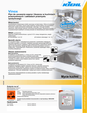 Vinox Płyn do usuwania wapna i tłuszczu w kuchniach przemysłowych i zakładach przemysłu spożywczego ⎯⎯⎯⎯⎯⎯⎯⎯⎯⎯⎯⎯⎯⎯⎯⎯⎯⎯⎯⎯⎯⎯⎯⎯⎯⎯⎯ Właściwości Wysokoaktywny antykorozyjny środek czyszczący na bazie kwasu. Wolny od substancji zapachowych i barwników. Usuwa osady wapienne i kamień kotłowy oraz pozostałości tłuszczowe i oleiste pochodzenia zwierzęcego i roślinnego. Vinox jest neutralny zapachowo i lekko pieniący podczas czyszczenia maszynowego. Stosowanie produktu na powierzchniach wrażliwych na kwasy prowadzi do nieodwracalnych szkód materiału. Skład (wg 648/2004/WE) Niejonowe związki powierzchniowo- czynne 5-15 %, kwasy nieorganiczne, związki antykorozyjne. pH (koncentratu) = ok. 0,5 pH (roztworu roboczego) = ok. 1,5 Sposób użycia Do wszystkich kwaso- i wodoodpornych powierzchni i przedmiotów znajdujących się przede wszystkim w kuchniach i zakładach przemysłu spożywczego takich jak: ceramiczne flizy ścienne i podłogowe, płyty bezpieczeństwa, powierzchnie robocze, kotły ze stali szlachetnej. Nadaje się także do usuwania pozostałości cementu z podłóg wodo- i kwasoodpornych. Powierzchnie i przedmioty sąsiadujące należy wcześniej zabezpieczyć. Obszar zastosowania Mycie powierzchni: W zależności od zabrudzenia 0,5 L Vinoxu na 5-8 L zimnej wody. Urządzenie rozpylające napełnić roztworem roboczym i spryskać czyszczoną powierzchnię, chwilę odczekać, spłukać lub umyć gruntownie zimną wodą. Powierzchnie bezpośrednio sąsiadujące wrażliwe na działanie kwasów należy wcześniej zabezpieczyć. Vinox jest niskopieniący i nadaje się do użycia w pistolecie pianowym. Nie ponosimy odpowiedzialności za szkody powstałe w wyniku niewłaściwego zastosowania produktu! 08.09.2006 21.05.2007 Mycie kuchni Zużycie na m² Mycie gruntowne: 75-150 ml Mycie powierzchni: 5 ml R 34 S 24/25 S 37/39 Powoduje oparzenia. Unikać zanieczyszczenia skóry i oczu. Nosić odpowiednią odzież ochronną, odpowiednie rękawice ochronne i okulary lub ochronę twarzy. Zawiera kwas fosforowy. żrący w koncentracie Produkt nie jest produktem konsumenckim w myśl dyrektywy 1999/44/WE Art. 1! Opakowanie 10 L kanister 200 L beczka Art.-Nr. j 55 06 10 Art.-Nr. j 55 06 72 www.kiehl-zegarski.pl Mycie gruntowne: W zależności od zabrudzenia 1 L Vinoxu na 2-8 L zimnej wody. Czyszczoną powierzchnię zwilżyć wcześniej czystą wodą. Rozprowadzić roztwór roboczy, szorować maszyną jednotarczową i szczotką, po krótkim czasie działania zebrać brud, spłukać gruntownie czystą wodą.
