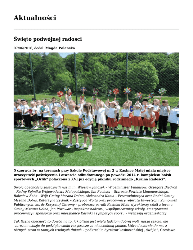 Aktualności Święto podwójnej radosci 07/06/2016, dodał: Magda Polańska 5 czerwca br. na terenach przy Szkole Podstawowej nr 2 w Kasince Małej miała miejsce uroczystość poświęcenia i otwarcie odbudowanego po powodzi 2014 r. kompleksu boisk sportowych „Orlik” połączona z XVI już edycją pikniku rodzinnego „Kraina Radości”. Swoją obecnością zaszczycili nas m.in. Wiesław Janczyk – Wiceminister Finansów, Grzegorz Biedroń – Radny Sejmiku Województwa Małopolskiego, Jan Puchała – Starosta Powiatu Limanowskiego, Bolesław Żaba - Wójt Gminy Mszana Dolna, Aleksandra Kania – Przewodnicząca oraz Radni Gminy Mszana Dolna, Katarzyna Szybiak – Zastępca Wójta oraz pracownicy referatu Inwestycji i Zamówień Publicznych, ks. dr Krzysztof Chromy – proboszcz parafii Kasinka Mała, dyrektorzy szkół z terenu Gminy Mszana Dolna, Jan Piwowar - inspektor nadzoru, współpracownicy szkoły, emerytowani pracownicy i sponsorzy oraz mieszkańcy Kasinki i sympatycy sportu – wyliczają organizatorzy. Tak liczna obecność to dowód na to, jak bliska jest wielu ludziom dobrej woli nasza szkoła, ale zarazem okazja do podziękowania raz jeszcze za nieocenioną pomoc, która docierała do nas z różnych stron w tamtych trudnych dniach – podkreśliła dyrektor kasinczańskiej „dwójki”, Czesława Łabuz. Dziś jednak nadszedł czas by przekazać pałeczkę młodym – naszemu pokoleniu, by czerpało wzorce z wielkich bohaterów sportu. Po uroczystym poświęceniu odbudowanego obiektu przez proboszcza, ks. Krzysztofa Chromego, nastąpiło przecięcie wstęgi, które stało się symbolicznym momentem otwarcia boiska. O pełnej gotowości kompleksu do jego użytkowania zaświadczyli goście uroczystości oddając honorowe strzały na bramkę. Miłym akcentem i świadectwem dobrej formy sportowej oraz zachętą dla przyszłych sukcesów były celne rzuty wójta i starosty. W swoim wystąpieniu Bolesław Żaba, wójt Gminy, przedstawił zestawienia kosztów oraz działań, dzięki którym odbudowa kasinczańskiego zaplecza sportowego jest dziś powodem do dumy. Wójt uhonorował pamiątkowymi statuetkami za włożony w odbudowę wysiłek Wiceministra Wiesława Janczyka, Wojewodę Małopolskiego – Józefa Pilcha, Wicemarszałka Województwa - Wojciecha Kozaka, Radnego Sejmiku Małopolskiego – Grzegorza Biedronia, Starostę Limanowskiego – Jana Puchałę, Wojciecha Pieroga – wykonawcę, właściciela firmy inżynieryjno – budowlanej INŻ. – BUD oraz inspektora nadzoru – Jana Piwowara. Zaproszeni do wspólnego świętowania goście, odnosząc się wspomnieniami do sierpnia 2014 i podkreślając ogromne zaangażowanie gminy i współpracę samych mieszkańców przy usuwaniu skutków powodzi, gratulowali rezultatów odbudowy i wyrazili nadzieję, że oddawany właśnie obiekt przyczyniać będzie się w dalszym ciągu do integracji społeczności lokalnej propagując zdrowy i aktywny tryb życia. Przy tej okazji życzyli, by możliwość korzystania z niego pomogła w rozwijaniu pasji i talentów sportowych. Czesława Łabuz, dyrektor szkoły, która była organizatorem uroczystości, przekazała na ręce wójta, Bolesława Żaby, podziękowanie kierowane w imieniu wszystkich obecnych i przyszłych użytkowników terenów sportowych dla instytucji i osób, które swoją pracą i zaangażowaniem doprowadziły do radości tego dnia: Szanowny Panie Wójcie! W dniu, kiedy oddaje Pan do użytku odbudowane i odremontowane obiekty – boiska sportowe pragnę podziękować w imieniu całej szkolnej społeczności za wszelkie działania, dzięki którym w naszej szkole czujemy się bezpiecznie. Dziękujemy, że wspólnie z Radą Gminy podjęliście Państwo tę trudną decyzję o odbudowie. Mamy wszyscy świadomość, że żywioł może znowu zagrozić obiektowi, lecz Orlik jest potrzebny naszej młodzieży, dorosłym i dzieciom. Ta przestrzeń, na której się znajdujemy pozwala nie tylko na uprawianie sportu, ale również jest miejscem gdzie nawiązywane są przyjaźnie i więzi między ludźmi (…) Najlepsza nagrodą i potwierdzeniem trafnie podjętej decyzji są wyniki sportowe i wyniki w nauce naszych uczniów, które jednocześnie są podziękowaniem dla Pana za zaangażowanie w odbudowę tego obiektu. To właśnie uczniowie klasy IV są Mistrzami Polski w rugby Tag i w ubiegłym tygodniu potwierdzili swoje umiejętności i, okazując się najlepszą drużyną w Małopolsce, będą reprezentować województwo w kolejnych Mistrzostwach Polski. To, że sport rzeźbi nie tylko ciało lecz również charakter potwierdza się również w wynikach nauczania, które uczniowie osiągają w egzaminach zewnętrznych. Od lat nasza szkoła jest drugą szkołą w gminie. I w tym roku również utrzymaliśmy ten wynik. Stanin 7, który osiągnęli nasi uczniowie jest wysoki i wyższy od średniej w gminie, powiecie i nawet województwie. Dziękując za inwestycję dyrektor przypomniała także o wszystkich ofiarodawcach gruntów pod tereny sportowe i budowniczych Orlika. Wdzięczność dla nich społeczność szkoły wyraziła w poprzednią niedzielę udziałem we Mszy św. ofiarowanej w ich intencji. Dowodem trafności podjętych decyzji są także wyrazy uznania i gratulacje nadesłane przez Sekretarza Stanu w Ministerstwie Spraw Wewnętrznych i Administracji – Jarosława Zielińskiego, Sekretarza Stanu w Ministerstwie Sportu i Turystyki – Jarosława Stawiarskiego i Marszałka Województwa Małopolskiego - Jacka Krupy, który na ręce Wójta Gminy i Dyrektora Szkoły złożył gratulacje i życzenia pomyślnej realizacji kolejnych planów inwestycyjnych, zaś młodzieży, która na co dzień korzystać będzie z nowego obiektu życzył aby osiągała znaczące sukcesy sportowe, a przede wszystkim dobrze się bawiła. Po zakończeniu oficjalnej części spotkania zebrani ruszyli barwnym korowodem, przy dźwiękach towarzyszącej wszystkim orkiestry „Echo Gór”, na