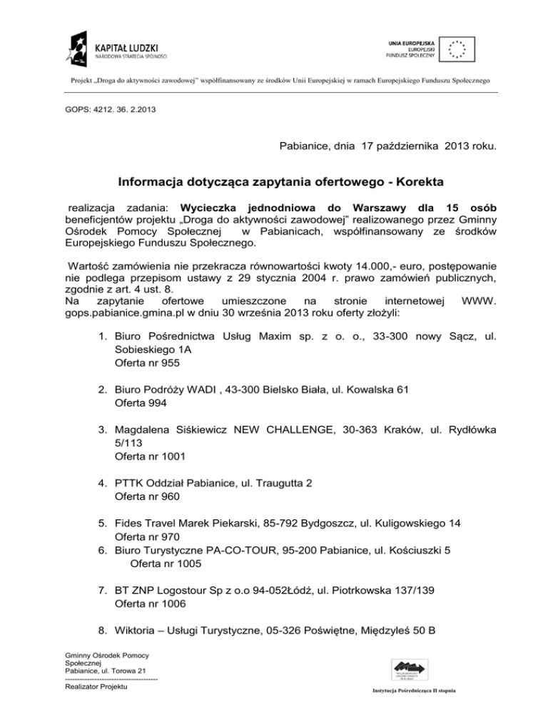 Projekt „Droga do aktywności zawodowej” współfinansowany ze środków Unii Europejskiej w ramach Europejskiego Funduszu Społecznego GOPS: 4212. 36. 2.2013 Pabianice, dnia 17 października 2013 roku. Informacja dotycząca zapytania ofertowego - Korekta realizacja zadania: Wycieczka jednodniowa do Warszawy dla 15 osób beneficjentów projektu „Droga do aktywności zawodowej” realizowanego przez Gminny Ośrodek Pomocy Społecznej w Pabianicach, współfinansowany ze środków Europejskiego Funduszu Społecznego. Wartość zamówienia nie przekracza równowartości kwoty 14.000,- euro, postępowanie nie podlega przepisom ustawy z 29 stycznia 2004 r. prawo zamówień publicznych, zgodnie z art. 4 ust. 8. Na zapytanie ofertowe umieszczone na stronie internetowej WWW. gops.pabianice.gmina.pl w dniu 30 września 2013 roku oferty złożyli: 1. Biuro Pośrednictwa Usług Maxim sp. z o. o., 33-300 nowy Sącz, ul. Sobieskiego 1A Oferta nr 955 2. Biuro Podróży WADI , 43-300 Bielsko Biała, ul. Kowalska 61 Oferta 994 3. Magdalena Siśkiewicz NEW CHALLENGE, 30-363 Kraków, ul. Rydłówka 5/113 Oferta nr 1001 4. PTTK Oddział Pabianice, ul. Traugutta 2 Oferta nr 960 5. Fides Travel Marek Piekarski, 85-792 Bydgoszcz, ul. Kuligowskiego 14 Oferta nr 970 6. Biuro Turystyczne PA-CO-TOUR, 95-200 Pabianice, ul. Kościuszki 5 Oferta nr 1005 7. BT ZNP Logostour Sp z o.o 94-052Łódź, ul. Piotrkowska 137/139 Oferta nr 1006 8. Wiktoria – Usługi Turystyczne, 05-326 Poświętne, Międzyleś 50 B Gminny Ośrodek Pomocy Społecznej Pabianice, ul. Torowa 21 -------------------------------------Realizator Projektu Instytucja Pośrednicząca II stopnia Projekt „Droga do aktywności zawodowej” współfinansowany ze środków Unii Europejskiej w ramach Europejskiego Funduszu Społecznego Oferta nr 1007 9. Kaskada – Biuro Podróży, Alicja Hołubowicz, 98-200 Sieradz, ul. POW 92/94 Oferta nr 1010 Zamówienia udzielono: BT ZNP Logostour Sp z o.o 94-052 Łódź, ul. Piotrkowska 137/139 Oferta nr 1006 na kwotę: 2400,- brutto Postępowanie prowadziła: Renata Bednarek Sprawdziła pod względem merytorycznym i zatwierdziła: Magdalena Mielczarek – Kierownik GOPS Gminny Ośrodek Pomocy Społecznej Pabianice, ul. Torowa 21 -------------------------------------Realizator Projektu Instytucja Pośrednicząca II stopnia