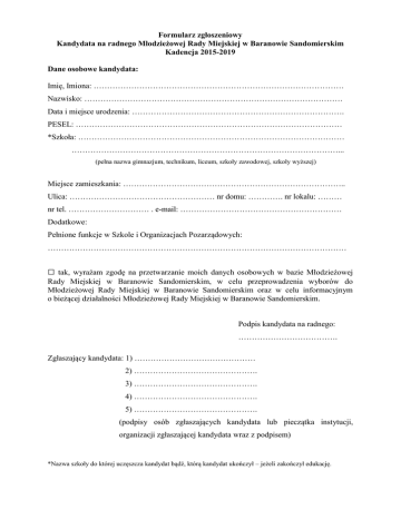 Formularz zgłoszeniowy Kandydata na radnego Młodzieżowej Rady Miejskiej w Baranowie Sandomierskim Kadencja 2015-2019 Dane osobowe kandydata: Imię, Imiona: ………………………………………………………………………………… Nazwisko: …………………………………………………………………………………… Data i miejsce urodzenia: ……………………………………………………………………. PESEL: ……………………………………………………………………………………… *Szkoła: ……………………………………………………………………………………… ………………………………………………………………………………………... (pełna nazwa gimnazjum, technikum, liceum, szkoły zawodowej, szkoły wyższej) Miejsce zamieszkania: ……………………………………………………………………….. Ulica: ……………………………………………… nr domu: …………. nr lokalu: ……… nr tel. ………………………… . e-mail: …………………………………………………… Dodatkowe: Pełnione funkcje w Szkole i Organizacjach Pozarządowych: ………………………………………………………………………………………………… □ tak, wyrażam zgodę na przetwarzanie moich danych osobowych w bazie Młodzieżowej Rady Miejskiej w Baranowie Sandomierskim, w celu przeprowadzenia wyborów do Młodzieżowej Rady Miejskiej w Baranowie Sandomierskim oraz w celu informacyjnym o bieżącej działalności Młodzieżowej Rady Miejskiej w Baranowie Sandomierskim. Podpis kandydata na radnego: ………………………………. Zgłaszający kandydata: 1) ……………………………………… 2) ………………………………………. 3) ………………………………………. 4) ………………………………………. 5) ………………………………………. (podpisy osób zgłaszających kandydata lub pieczątka instytucji, organizacji zgłaszającej kandydata wraz z podpisem) *Nazwa szkoły do której uczęszcza kandydat bądź, którą kandydat ukończył – jeżeli zakończył edukację.