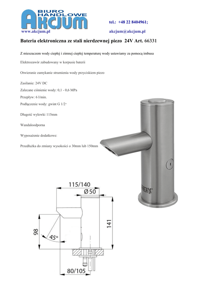 tel.: +48 22 8404961; www.akcjum.pl [email protected] Bateria elektroniczna ze stali nierdzewnej piezo 24V Art. 66331 Z mieszaczem wody ciepłej i zimnej ciepłej temperaturę wody ustawiamy za pomocą imbusa Elektrozawór zabudowany w korpusie baterii Otwieranie zamykanie strumienia wody przyciskiem piezo Zasilanie: 24V DC Zalecane ciśnienie wody: 0,1 - 0,6 MPa Przepływ: 6 l/min. Podłączenie wody: gwint G 1/2“ Długość wylewki 115mm Wandaloodporna Wyposażenie dodatkowe: Przedłużka do zmiany wysokości o 30mm lub 150mm